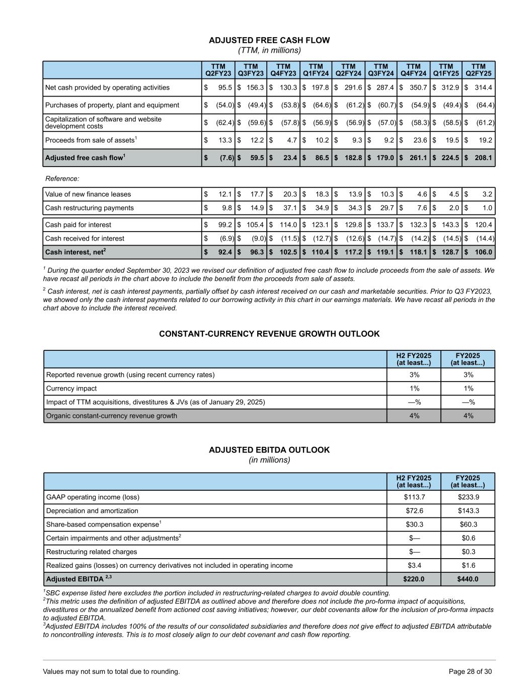 ADJUSTED FREE CASH FLOW (TTM, in millions) TTM Q2FY23 TTM Q3FY23 TTM Q4FY23 TTM Q1FY24 TTM Q2FY24 TTM Q3FY24 TTM Q4FY24 TTM Q1FY25 TTM Q2FY25 Net cash provided by operating activities $ 95.5 $ 156.3 $ 130.3 $ 197.8 $ 291.6 $ 287.4 $ 350.7 $ 312.9 $ 314.4 Purchases of property, plant and equipment $ (54.0) $ (49.4) $ (53.8) $ (64.6) $ (61.2) $ (60.7) $ (54.9) $ (49.4) $ (64.4) Capitalization of software and website development costs $ (62.4) $ (59.6) $ (57.8) $ (56.9) $ (56.9) $ (57.0) $ (58.3) $ (58.5) $ (61.2) Proceeds from sale of assets1 $ 13.3 $ 12.2 $ 4.7 $ 10.2 $ 9.3 $ 9.2 $ 23.6 $ 19.5 $ 19.2 Adjusted free cash flow1 $ (7.6) $ 59.5 $ 23.4 $ 86.5 $ 182.8 $ 179.0 $ 261.1 $ 224.5 $ 208.1 Reference: Value of new finance leases $ 12.1 $ 17.7 $ 20.3 $ 18.3 $ 13.9 $ 10.3 $ 4.6 $ 4.5 $ 3.2 Cash restructuring payments $ 9.8 $ 14.9 $ 37.1 $ 34.9 $ 34.3 $ 29.7 $ 7.6 $ 2.0 $ 1.0 Cash paid for interest $ 99.2 $ 105.4 $ 114.0 $ 123.1 $ 129.8 $ 133.7 $ 132.3 $ 143.3 $ 120.4 Cash received for interest $ (6.9) $ (9.0) $ (11.5) $ (12.7) $ (12.6) $ (14.7) $ (14.2) $ (14.5) $ (14.4) Cash interest, net2 $ 92.4 $ 96.3 $ 102.5 $ 110.4 $ 117.2 $ 119.1 $ 118.1 $ 128.7 $ 106.0 1 During the quarter ended September 30, 2023 we revised our definition of adjusted free cash flow to include proceeds from the sale of assets. We have recast all periods in the chart above to include the benefit from the proceeds from sale of assets. 2 Cash interest, net is cash interest payments, partially offset by cash interest received on our cash and marketable securities. Prior to Q3 FY2023, we showed only the cash interest payments related to our borrowing activity in this chart in our earnings materials. We have recast all periods in the chart above to include the interest received. CONSTANT-CURRENCY REVENUE GROWTH OUTLOOK H2 FY2025 (at least...) FY2025 (at least...) Reported revenue growth (using recent currency rates) 3% 3% Currency impact 1% 1% Impact of TTM acquisitions, divestitures & JVs (as of January 29, 2025) —% —% Organic constant-currency revenue growth 4% 4% ADJUSTED EBITDA OUTLOOK (in millions) H2 FY2025 (at least...) FY2025 (at least...) GAAP operating income (loss) $113.7 $233.9 Depreciation and amortization $72.6 $143.3 Share-based compensation expense1 $30.3 $60.3 Certain impairments and other adjustments2 $— $0.6 Restructuring related charges $— $0.3 Realized gains (losses) on currency derivatives not included in operating income $3.4 $1.6 Adjusted EBITDA 2,3 $220.0 $440.0 1SBC expense listed here excludes the portion included in restructuring-related charges to avoid double counting. 2This metric uses the definition of adjusted EBITDA as outlined above and therefore does not include the pro-forma impact of acquisitions, divestitures or the annualized benefit from actioned cost saving initiatives; however, our debt covenants allow for the inclusion of pro-forma impacts to adjusted EBITDA. 3Adjusted EBITDA includes 100% of the results of our consolidated subsidiaries and therefore does not give effect to adjusted EBITDA attributable to noncontrolling interests. This is to most closely align to our debt covenant and cash flow reporting. Values may not sum to total due to rounding. Page 28 of 30