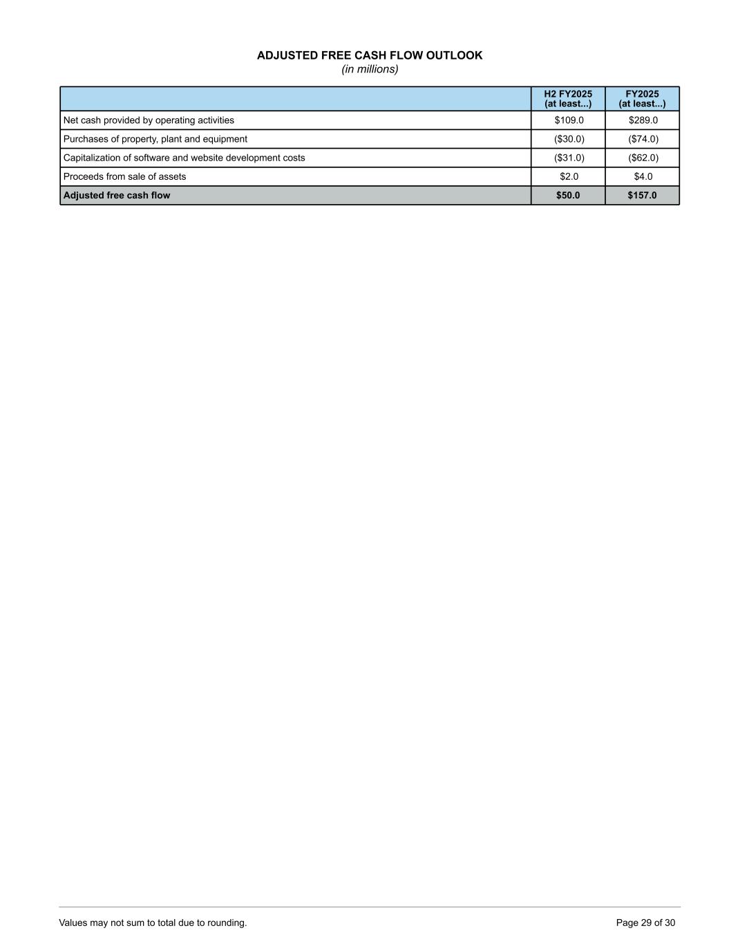 ADJUSTED FREE CASH FLOW OUTLOOK (in millions) H2 FY2025 (at least...) FY2025 (at least...) Net cash provided by operating activities $109.0 $289.0 Purchases of property, plant and equipment ($30.0) ($74.0) Capitalization of software and website development costs ($31.0) ($62.0) Proceeds from sale of assets $2.0 $4.0 Adjusted free cash flow $50.0 $157.0 Values may not sum to total due to rounding. Page 29 of 30