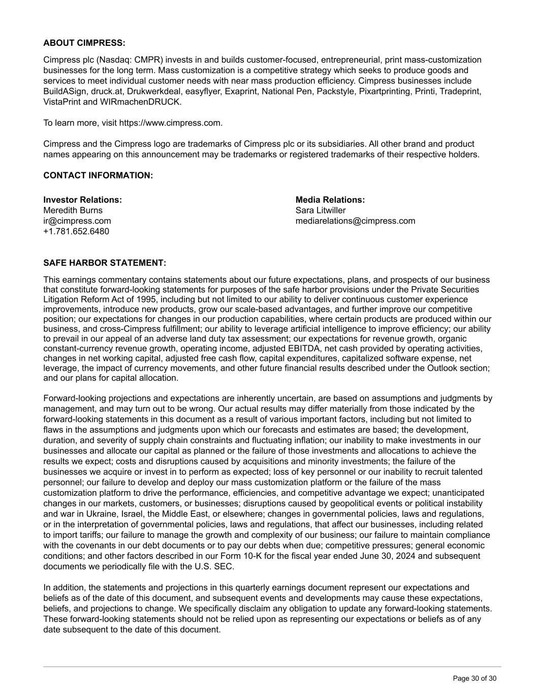 ABOUT CIMPRESS: Cimpress plc (Nasdaq: CMPR) invests in and builds customer-focused, entrepreneurial, print mass-customization businesses for the long term. Mass customization is a competitive strategy which seeks to produce goods and services to meet individual customer needs with near mass production efficiency. Cimpress businesses include BuildASign, druck.at, Drukwerkdeal, easyflyer, Exaprint, National Pen, Packstyle, Pixartprinting, Printi, Tradeprint, VistaPrint and WIRmachenDRUCK. To learn more, visit https://www.cimpress.com. Cimpress and the Cimpress logo are trademarks of Cimpress plc or its subsidiaries. All other brand and product names appearing on this announcement may be trademarks or registered trademarks of their respective holders. CONTACT INFORMATION: Investor Relations: Media Relations: Meredith Burns Sara Litwiller ir@cimpress.com mediarelations@cimpress.com +1.781.652.6480 SAFE HARBOR STATEMENT: This earnings commentary contains statements about our future expectations, plans, and prospects of our business that constitute forward-looking statements for purposes of the safe harbor provisions under the Private Securities Litigation Reform Act of 1995, including but not limited to our ability to deliver continuous customer experience improvements, introduce new products, grow our scale-based advantages, and further improve our competitive position; our expectations for changes in our production capabilities, where certain products are produced within our business, and cross-Cimpress fulfillment; our ability to leverage artificial intelligence to improve efficiency; our ability to prevail in our appeal of an adverse land duty tax assessment; our expectations for revenue growth, organic constant-currency revenue growth, operating income, adjusted EBITDA, net cash provided by operating activities, changes in net working capital, adjusted free cash flow, capital expenditures, capitalized software expense, net leverage, the impact of currency movements, and other future financial results described under the Outlook section; and our plans for capital allocation. Forward-looking projections and expectations are inherently uncertain, are based on assumptions and judgments by management, and may turn out to be wrong. Our actual results may differ materially from those indicated by the forward-looking statements in this document as a result of various important factors, including but not limited to flaws in the assumptions and judgments upon which our forecasts and estimates are based; the development, duration, and severity of supply chain constraints and fluctuating inflation; our inability to make investments in our businesses and allocate our capital as planned or the failure of those investments and allocations to achieve the results we expect; costs and disruptions caused by acquisitions and minority investments; the failure of the businesses we acquire or invest in to perform as expected; loss of key personnel or our inability to recruit talented personnel; our failure to develop and deploy our mass customization platform or the failure of the mass customization platform to drive the performance, efficiencies, and competitive advantage we expect; unanticipated changes in our markets, customers, or businesses; disruptions caused by geopolitical events or political instability and war in Ukraine, Israel, the Middle East, or elsewhere; changes in governmental policies, laws and regulations, or in the interpretation of governmental policies, laws and regulations, that affect our businesses, including related to import tariffs; our failure to manage the growth and complexity of our business; our failure to maintain compliance with the covenants in our debt documents or to pay our debts when due; competitive pressures; general economic conditions; and other factors described in our Form 10-K for the fiscal year ended June 30, 2024 and subsequent documents we periodically file with the U.S. SEC. In addition, the statements and projections in this quarterly earnings document represent our expectations and beliefs as of the date of this document, and subsequent events and developments may cause these expectations, beliefs, and projections to change. We specifically disclaim any obligation to update any forward-looking statements. These forward-looking statements should not be relied upon as representing our expectations or beliefs as of any date subsequent to the date of this document. Page 30 of 30