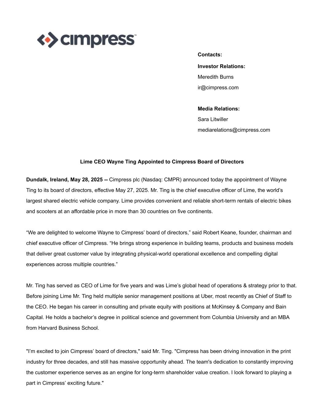 ​ ​ ​ Contacts: ​ ​ ​ ​ ​ ​ ​ ​ ​ Investor Relations: ​ ​ ​ ​ ​ ​ ​ ​ ​ Meredith Burns ​ ​ ​ ​ ​ ​ ​ ​ ​ ir@cimpress.com ​ ​ ​ ​ ​ ​ ​ ​ ​ ​ ​ ​ ​ ​ Media Relations: ​ ​ ​ ​ ​ ​ ​ ​ ​ Sara Litwiller ​ ​ ​ ​ ​ ​ ​ ​ ​ mediarelations@cimpress.com ​ ​ ​ ​ ​ ​ ​ ​ Lime CEO Wayne Ting Appointed to Cimpress Board of Directors Dundalk, Ireland, May 28, 2025 -- Cimpress plc (Nasdaq: CMPR) announced today the appointment of Wayne Ting to its board of directors, effective May 27, 2025. Mr. Ting is the chief executive officer of Lime, the world’s largest shared electric vehicle company. Lime provides convenient and reliable short-term rentals of electric bikes and scooters at an affordable price in more than 30 countries on five continents. “We are delighted to welcome Wayne to Cimpress’ board of directors,” said Robert Keane, founder, chairman and chief executive officer of Cimpress. “He brings strong experience in building teams, products and business models that deliver great customer value by integrating physical-world operational excellence and compelling digital experiences across multiple countries.” Mr. Ting has served as CEO of Lime for five years and was Lime’s global head of operations & strategy prior to that. Before joining Lime Mr. Ting held multiple senior management positions at Uber, most recently as Chief of Staff to the CEO. He began his career in consulting and private equity with positions at McKinsey & Company and Bain Capital. He holds a bachelor’s degree in political science and government from Columbia University and an MBA from Harvard Business School. "I’m excited to join Cimpress’ board of directors," said Mr. Ting. "Cimpress has been driving innovation in the print industry for three decades, and still has massive opportunity ahead. The team's dedication to constantly improving the customer experience serves as an engine for long-term shareholder value creation. I look forward to playing a part in Cimpress’ exciting future."