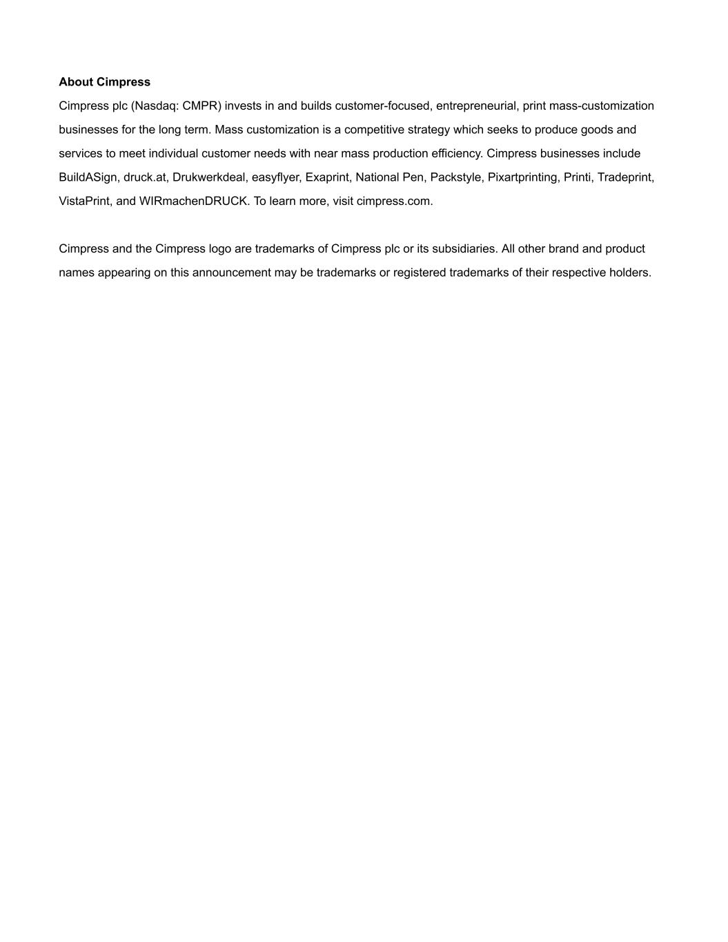 About Cimpress Cimpress plc (Nasdaq: CMPR) invests in and builds customer-focused, entrepreneurial, print mass-customization businesses for the long term. Mass customization is a competitive strategy which seeks to produce goods and services to meet individual customer needs with near mass production efficiency. Cimpress businesses include BuildASign, druck.at, Drukwerkdeal, easyflyer, Exaprint, National Pen, Packstyle, Pixartprinting, Printi, Tradeprint, VistaPrint, and WIRmachenDRUCK. To learn more, visit cimpress.com. Cimpress and the Cimpress logo are trademarks of Cimpress plc or its subsidiaries. All other brand and product names appearing on this announcement may be trademarks or registered trademarks of their respective holders.