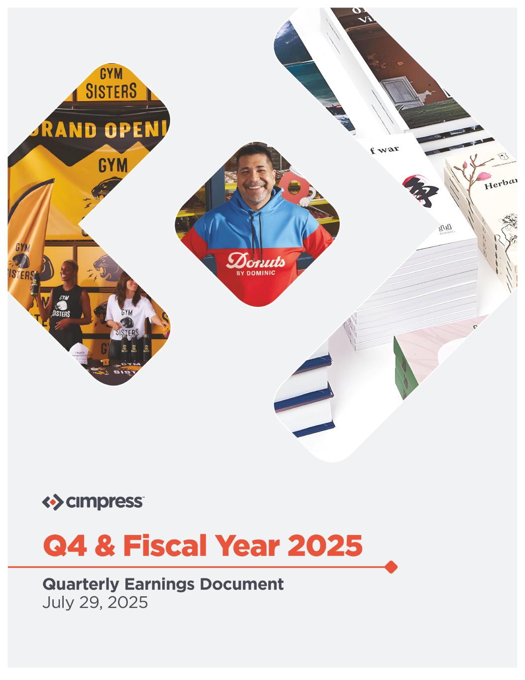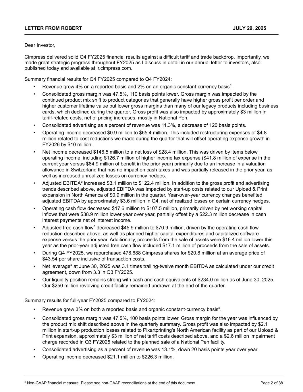 LETTER FROM ROBERT JULY 29, 2025 Dear Investor, Cimpress delivered solid Q4 FY2025 financial results against a difficult tariff and trade backdrop. Importantly, we made great strategic progress throughout FY2025 as I discuss in detail in our annual letter to investors, also published today and available at ir.cimpress.com. Summary financial results for Q4 FY2025 compared to Q4 FY2024: • Revenue grew 4% on a reported basis and 2% on an organic constant-currency basisa. • Consolidated gross margin was 47.5%, 110 basis points lower. Gross margin was impacted by the continued product mix shift to product categories that generally have higher gross profit per order and higher customer lifetime value but lower gross margins than many of our legacy products including business cards, which declined during the quarter. Gross profit was also impacted by approximately $3 million in tariff-related costs, net of pricing increases, mostly in National Pen. • Consolidated advertising as a percent of revenue was 11.3%, a decrease of 120 basis points. • Operating income decreased $0.9 million to $65.4 million. This included restructuring expenses of $4.8 million related to cost reductions we made during the quarter that will offset operating expense growth in FY2026 by $10 million. • Net income decreased $146.5 million to a net loss of $28.4 million. This was driven by items below operating income, including $126.7 million of higher income tax expense ($41.8 million of expense in the current year versus $84.9 million of benefit in the prior year) primarily due to an increase in a valuation allowance in Switzerland that has no impact on cash taxes and was partially released in the prior year, as well as increased unrealized losses on currency hedges. • Adjusted EBITDAa increased $3.1 million to $122.4 million. In addition to the gross profit and advertising trends described above, adjusted EBITDA was impacted by start-up costs related to our Upload & Print expansion in North America of $0.9 million in the quarter. Year-over-year currency changes benefited adjusted EBITDA by approximately $3.6 million in Q4, net of realized losses on certain currency hedges. • Operating cash flow decreased $17.6 million to $107.5 million, primarily driven by net working capital inflows that were $38.9 million lower year over year, partially offset by a $22.3 million decrease in cash interest payments net of interest income. • Adjusted free cash flowa decreased $45.9 million to $70.9 million, driven by the operating cash flow reduction described above, as well as planned higher capital expenditures and capitalized software expense versus the prior year. Additionally, proceeds from the sale of assets were $16.4 million lower this year as the prior-year adjusted free cash flow included $17.1 million of proceeds from the sale of assets. • During Q4 FY2025, we repurchased 478,688 Cimpress shares for $20.8 million at an average price of $43.54 per share inclusive of transaction costs. • Net leveragea at June 30, 2025 was 3.1 times trailing-twelve month EBITDA as calculated under our credit agreement, down from 3.3 in Q3 FY2025. • Our liquidity position remains strong with cash and cash equivalents of $234.0 million as of June 30, 2025. Our $250 million revolving credit facility remained undrawn at the end of the quarter. Summary results for full-year FY2025 compared to FY2024: • Revenue grew 3% on both a reported basis and organic constant-currency basisa. • Consolidated gross margin was 47.5%, 100 basis points lower. Gross margin for the year was influenced by the product mix shift described above in the quarterly summary. Gross profit was also impacted by $2.1 million in start-up production losses related to Pixartprinting's North American facility as part of our Upload & Print expansion, approximately $3 million of net tariff costs described above, and a $2.6 million impairment charge recorded in Q3 FY2025 related to the planned sale of a National Pen facility. • Consolidated advertising as a percent of revenue was 13.1%, down 20 basis points year over year. • Operating income decreased $21.1 million to $226.3 million. a Non-GAAP financial measure. Please see non-GAAP reconciliations at the end of this document. Page 2 of 38