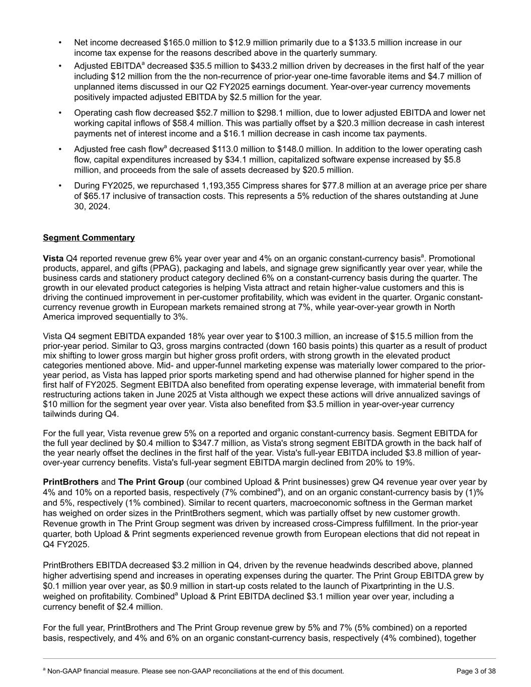 • Net income decreased $165.0 million to $12.9 million primarily due to a $133.5 million increase in our income tax expense for the reasons described above in the quarterly summary. • Adjusted EBITDAa decreased $35.5 million to $433.2 million driven by decreases in the first half of the year including $12 million from the the non-recurrence of prior-year one-time favorable items and $4.7 million of unplanned items discussed in our Q2 FY2025 earnings document. Year-over-year currency movements positively impacted adjusted EBITDA by $2.5 million for the year. • Operating cash flow decreased $52.7 million to $298.1 million, due to lower adjusted EBITDA and lower net working capital inflows of $58.4 million. This was partially offset by a $20.3 million decrease in cash interest payments net of interest income and a $16.1 million decrease in cash income tax payments. • Adjusted free cash flowa decreased $113.0 million to $148.0 million. In addition to the lower operating cash flow, capital expenditures increased by $34.1 million, capitalized software expense increased by $5.8 million, and proceeds from the sale of assets decreased by $20.5 million. • During FY2025, we repurchased 1,193,355 Cimpress shares for $77.8 million at an average price per share of $65.17 inclusive of transaction costs. This represents a 5% reduction of the shares outstanding at June 30, 2024. Segment Commentary Vista Q4 reported revenue grew 6% year over year and 4% on an organic constant-currency basisa. Promotional products, apparel, and gifts (PPAG), packaging and labels, and signage grew significantly year over year, while the business cards and stationery product category declined 6% on a constant-currency basis during the quarter. The growth in our elevated product categories is helping Vista attract and retain higher-value customers and this is driving the continued improvement in per-customer profitability, which was evident in the quarter. Organic constant- currency revenue growth in European markets remained strong at 7%, while year-over-year growth in North America improved sequentially to 3%. Vista Q4 segment EBITDA expanded 18% year over year to $100.3 million, an increase of $15.5 million from the prior-year period. Similar to Q3, gross margins contracted (down 160 basis points) this quarter as a result of product mix shifting to lower gross margin but higher gross profit orders, with strong growth in the elevated product categories mentioned above. Mid- and upper-funnel marketing expense was materially lower compared to the prior- year period, as Vista has lapped prior sports marketing spend and had otherwise planned for higher spend in the first half of FY2025. Segment EBITDA also benefited from operating expense leverage, with immaterial benefit from restructuring actions taken in June 2025 at Vista although we expect these actions will drive annualized savings of $10 million for the segment year over year. Vista also benefited from $3.5 million in year-over-year currency tailwinds during Q4. For the full year, Vista revenue grew 5% on a reported and organic constant-currency basis. Segment EBITDA for the full year declined by $0.4 million to $347.7 million, as Vista's strong segment EBITDA growth in the back half of the year nearly offset the declines in the first half of the year. Vista's full-year EBITDA included $3.8 million of year- over-year currency benefits. Vista's full-year segment EBITDA margin declined from 20% to 19%. PrintBrothers and The Print Group (our combined Upload & Print businesses) grew Q4 revenue year over year by 4% and 10% on a reported basis, respectively (7% combineda), and on an organic constant-currency basis by (1)% and 5%, respectively (1% combined). Similar to recent quarters, macroeconomic softness in the German market has weighed on order sizes in the PrintBrothers segment, which was partially offset by new customer growth. Revenue growth in The Print Group segment was driven by increased cross-Cimpress fulfillment. In the prior-year quarter, both Upload & Print segments experienced revenue growth from European elections that did not repeat in Q4 FY2025. PrintBrothers EBITDA decreased $3.2 million in Q4, driven by the revenue headwinds described above, planned higher advertising spend and increases in operating expenses during the quarter. The Print Group EBITDA grew by $0.1 million year over year, as $0.9 million in start-up costs related to the launch of Pixartprinting in the U.S. weighed on profitability. Combineda Upload & Print EBITDA declined $3.1 million year over year, including a currency benefit of $2.4 million. For the full year, PrintBrothers and The Print Group revenue grew by 5% and 7% (5% combined) on a reported basis, respectively, and 4% and 6% on an organic constant-currency basis, respectively (4% combined), together a Non-GAAP financial measure. Please see non-GAAP reconciliations at the end of this document. Page 3 of 38