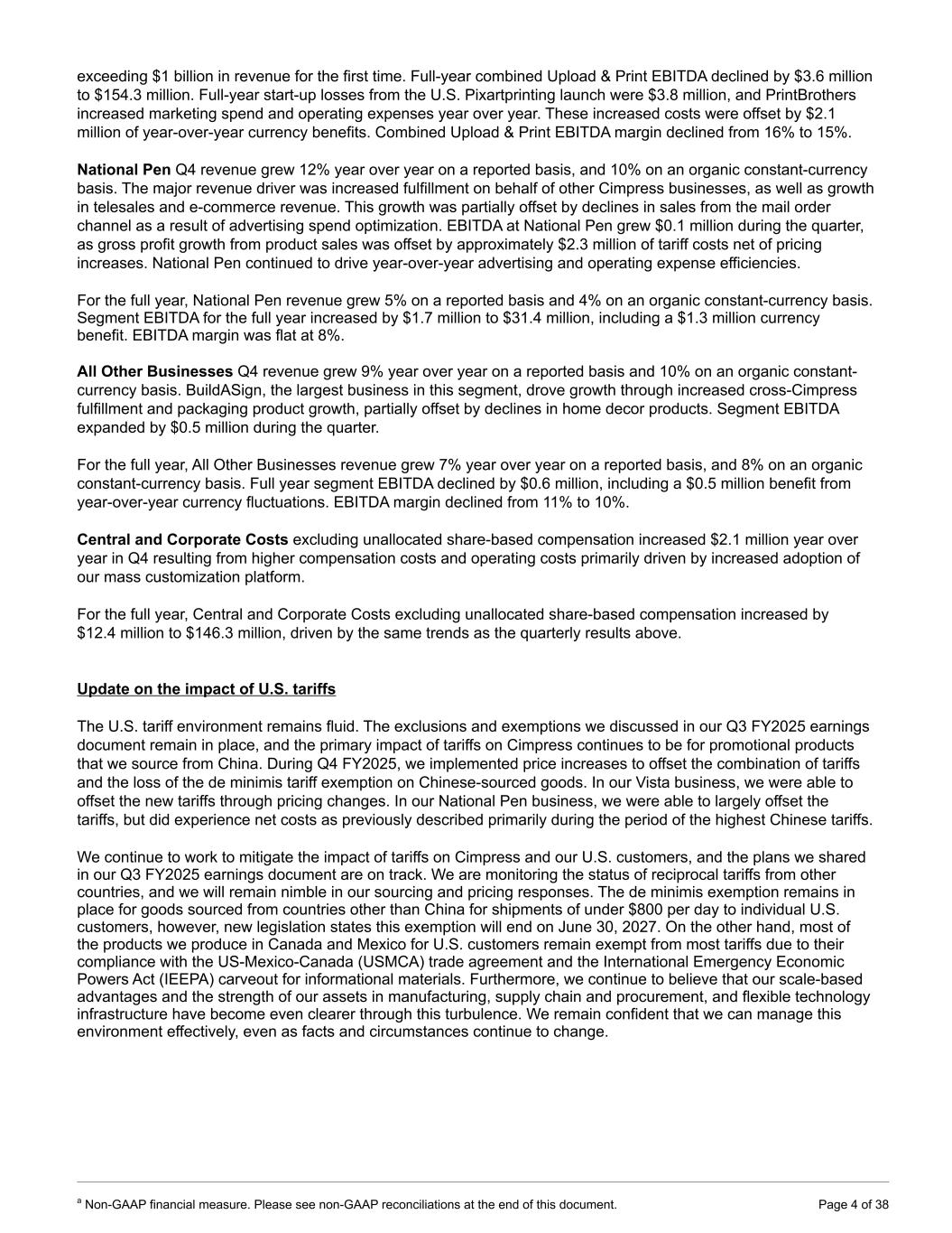 exceeding $1 billion in revenue for the first time. Full-year combined Upload & Print EBITDA declined by $3.6 million to $154.3 million. Full-year start-up losses from the U.S. Pixartprinting launch were $3.8 million, and PrintBrothers increased marketing spend and operating expenses year over year. These increased costs were offset by $2.1 million of year-over-year currency benefits. Combined Upload & Print EBITDA margin declined from 16% to 15%. National Pen Q4 revenue grew 12% year over year on a reported basis, and 10% on an organic constant-currency basis. The major revenue driver was increased fulfillment on behalf of other Cimpress businesses, as well as growth in telesales and e-commerce revenue. This growth was partially offset by declines in sales from the mail order channel as a result of advertising spend optimization. EBITDA at National Pen grew $0.1 million during the quarter, as gross profit growth from product sales was offset by approximately $2.3 million of tariff costs net of pricing increases. National Pen continued to drive year-over-year advertising and operating expense efficiencies. For the full year, National Pen revenue grew 5% on a reported basis and 4% on an organic constant-currency basis. Segment EBITDA for the full year increased by $1.7 million to $31.4 million, including a $1.3 million currency benefit. EBITDA margin was flat at 8%. All Other Businesses Q4 revenue grew 9% year over year on a reported basis and 10% on an organic constant- currency basis. BuildASign, the largest business in this segment, drove growth through increased cross-Cimpress fulfillment and packaging product growth, partially offset by declines in home decor products. Segment EBITDA expanded by $0.5 million during the quarter. For the full year, All Other Businesses revenue grew 7% year over year on a reported basis, and 8% on an organic constant-currency basis. Full year segment EBITDA declined by $0.6 million, including a $0.5 million benefit from year-over-year currency fluctuations. EBITDA margin declined from 11% to 10%. Central and Corporate Costs excluding unallocated share-based compensation increased $2.1 million year over year in Q4 resulting from higher compensation costs and operating costs primarily driven by increased adoption of our mass customization platform. For the full year, Central and Corporate Costs excluding unallocated share-based compensation increased by $12.4 million to $146.3 million, driven by the same trends as the quarterly results above. Update on the impact of U.S. tariffs The U.S. tariff environment remains fluid. The exclusions and exemptions we discussed in our Q3 FY2025 earnings document remain in place, and the primary impact of tariffs on Cimpress continues to be for promotional products that we source from China. During Q4 FY2025, we implemented price increases to offset the combination of tariffs and the loss of the de minimis tariff exemption on Chinese-sourced goods. In our Vista business, we were able to offset the new tariffs through pricing changes. In our National Pen business, we were able to largely offset the tariffs, but did experience net costs as previously described primarily during the period of the highest Chinese tariffs. We continue to work to mitigate the impact of tariffs on Cimpress and our U.S. customers, and the plans we shared in our Q3 FY2025 earnings document are on track. We are monitoring the status of reciprocal tariffs from other countries, and we will remain nimble in our sourcing and pricing responses. The de minimis exemption remains in place for goods sourced from countries other than China for shipments of under $800 per day to individual U.S. customers, however, new legislation states this exemption will end on June 30, 2027. On the other hand, most of the products we produce in Canada and Mexico for U.S. customers remain exempt from most tariffs due to their compliance with the US-Mexico-Canada (USMCA) trade agreement and the International Emergency Economic Powers Act (IEEPA) carveout for informational materials. Furthermore, we continue to believe that our scale-based advantages and the strength of our assets in manufacturing, supply chain and procurement, and flexible technology infrastructure have become even clearer through this turbulence. We remain confident that we can manage this environment effectively, even as facts and circumstances continue to change. a Non-GAAP financial measure. Please see non-GAAP reconciliations at the end of this document. Page 4 of 38