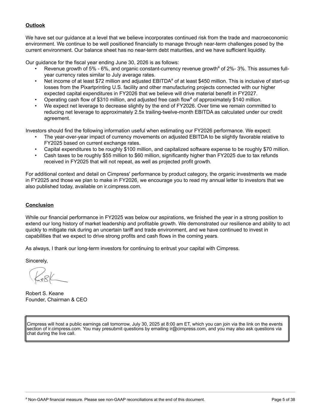 Outlook We have set our guidance at a level that we believe incorporates continued risk from the trade and macroeconomic environment. We continue to be well positioned financially to manage through near-term challenges posed by the current environment. Our balance sheet has no near-term debt maturities, and we have sufficient liquidity. Our guidance for the fiscal year ending June 30, 2026 is as follows: • Revenue growth of 5% - 6%, and organic constant-currency revenue growtha of 2%- 3%. This assumes full- year currency rates similar to July average rates. • Net income of at least $72 million and adjusted EBITDAa of at least $450 million. This is inclusive of start-up losses from the Pixartprinting U.S. facility and other manufacturing projects connected with our higher expected capital expenditures in FY2026 that we believe will drive material benefit in FY2027. • Operating cash flow of $310 million, and adjusted free cash flowa of approximately $140 million. • We expect net leverage to decrease slightly by the end of FY2026. Over time we remain committed to reducing net leverage to approximately 2.5x trailing-twelve-month EBITDA as calculated under our credit agreement. Investors should find the following information useful when estimating our FY2026 performance. We expect: • The year-over-year impact of currency movements on adjusted EBITDA to be slightly favorable relative to FY2025 based on current exchange rates. • Capital expenditures to be roughly $100 million, and capitalized software expense to be roughly $70 million. • Cash taxes to be roughly $55 million to $60 million, significantly higher than FY2025 due to tax refunds received in FY2025 that will not repeat, as well as projected profit growth. For additional context and detail on Cimpress' performance by product category, the organic investments we made in FY2025 and those we plan to make in FY2026, we encourage you to read my annual letter to investors that we also published today, available on ir.cimpress.com. Conclusion While our financial performance in FY2025 was below our aspirations, we finished the year in a strong position to extend our long history of market leadership and profitable growth. We demonstrated our resilience and ability to act quickly to mitigate risk during an uncertain tariff and trade environment, and we have continued to invest in capabilities that we expect to drive strong profits and cash flows in the coming years. As always, I thank our long-term investors for continuing to entrust your capital with Cimpress. Sincerely, Robert S. Keane Founder, Chairman & CEO Cimpress will host a public earnings call tomorrow, July 30, 2025 at 8:00 am ET, which you can join via the link on the events section of ir.cimpress.com. You may presubmit questions by emailing ir@cimpress.com, and you may also ask questions via chat during the live call. a Non-GAAP financial measure. Please see non-GAAP reconciliations at the end of this document. Page 5 of 38