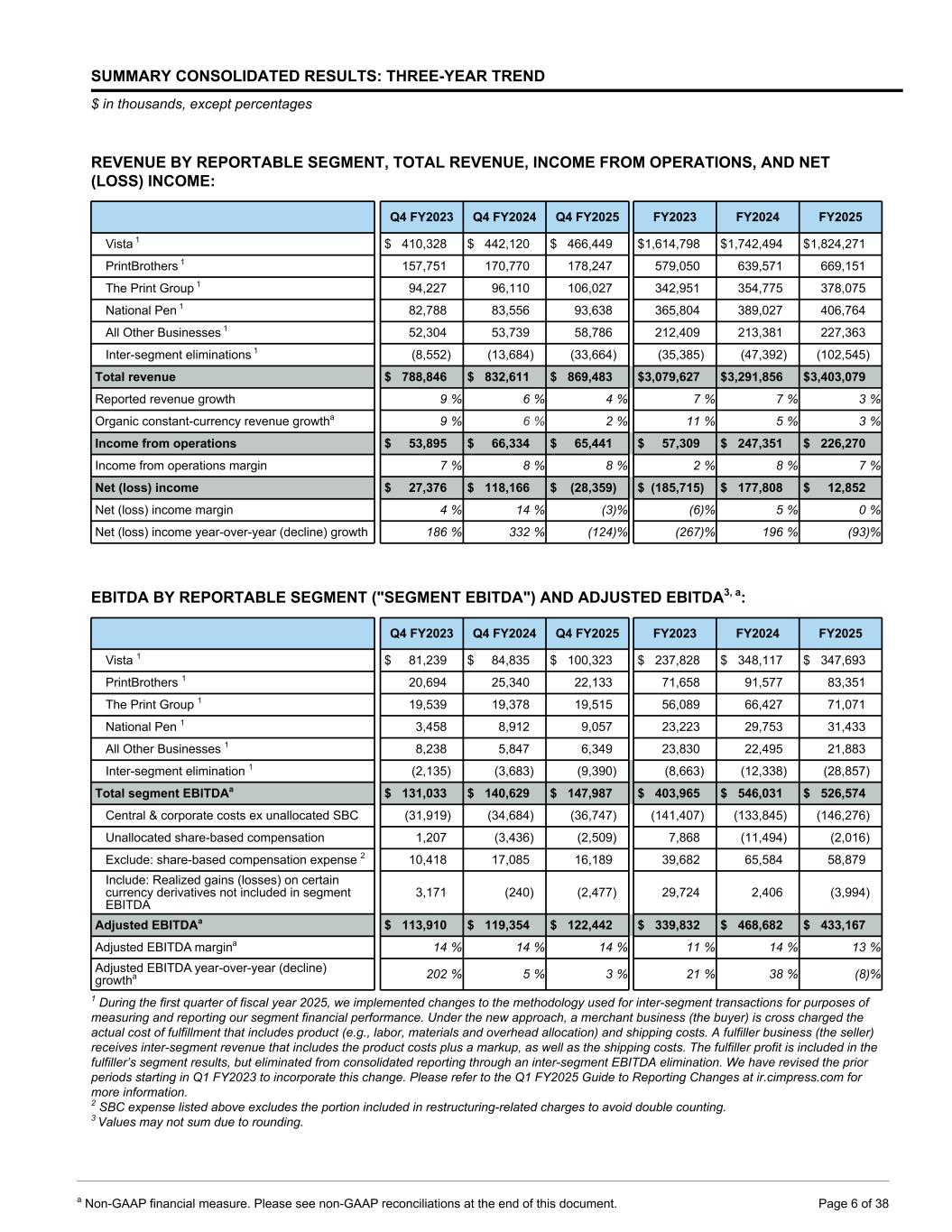 SUMMARY CONSOLIDATED RESULTS: THREE-YEAR TREND $ in thousands, except percentages REVENUE BY REPORTABLE SEGMENT, TOTAL REVENUE, INCOME FROM OPERATIONS, AND NET (LOSS) INCOME: Q4 FY2023 Q4 FY2024 Q4 FY2025 FY2023 FY2024 FY2025 Vista 1 $ 410,328 $ 442,120 $ 466,449 $ 1,614,798 $ 1,742,494 $ 1,824,271 PrintBrothers 1 157,751 170,770 178,247 579,050 639,571 669,151 The Print Group 1 94,227 96,110 106,027 342,951 354,775 378,075 National Pen 1 82,788 83,556 93,638 365,804 389,027 406,764 All Other Businesses 1 52,304 53,739 58,786 212,409 213,381 227,363 Inter-segment eliminations 1 (8,552) (13,684) (33,664) (35,385) (47,392) (102,545) Total revenue $ 788,846 $ 832,611 $ 869,483 $ 3,079,627 $ 3,291,856 $ 3,403,079 Reported revenue growth 9 % 6 % 4 % 7 % 7 % 3 % Organic constant-currency revenue growtha 9 % 6 % 2 % 11 % 5 % 3 % Income from operations $ 53,895 $ 66,334 $ 65,441 $ 57,309 $ 247,351 $ 226,270 Income from operations margin 7 % 8 % 8 % 2 % 8 % 7 % Net (loss) income $ 27,376 $ 118,166 $ (28,359) $ (185,715) $ 177,808 $ 12,852 Net (loss) income margin 4 % 14 % (3) % (6) % 5 % 0 % Net (loss) income year-over-year (decline) growth 186 % 332 % (124) % (267) % 196 % (93) % EBITDA BY REPORTABLE SEGMENT ("SEGMENT EBITDA") AND ADJUSTED EBITDA3, a: Q4 FY2023 Q4 FY2024 Q4 FY2025 FY2023 FY2024 FY2025 Vista 1 $ 81,239 $ 84,835 $ 100,323 $ 237,828 $ 348,117 $ 347,693 PrintBrothers 1 20,694 25,340 22,133 71,658 91,577 83,351 The Print Group 1 19,539 19,378 19,515 56,089 66,427 71,071 National Pen 1 3,458 8,912 9,057 23,223 29,753 31,433 All Other Businesses 1 8,238 5,847 6,349 23,830 22,495 21,883 Inter-segment elimination 1 (2,135) (3,683) (9,390) (8,663) (12,338) (28,857) Total segment EBITDAa $ 131,033 $ 140,629 $ 147,987 $ 403,965 $ 546,031 $ 526,574 Central & corporate costs ex unallocated SBC (31,919) (34,684) (36,747) (141,407) (133,845) (146,276) Unallocated share-based compensation 1,207 (3,436) (2,509) 7,868 (11,494) (2,016) Exclude: share-based compensation expense 2 10,418 17,085 16,189 39,682 65,584 58,879 Include: Realized gains (losses) on certain currency derivatives not included in segment EBITDA 3,171 (240) (2,477) 29,724 2,406 (3,994) Adjusted EBITDAa $ 113,910 $ 119,354 $ 122,442 $ 339,832 $ 468,682 $ 433,167 Adjusted EBITDA margina 14 % 14 % 14 % 11 % 14 % 13 % Adjusted EBITDA year-over-year (decline) growtha 202 % 5 % 3 % 21 % 38 % (8) % 1 During the first quarter of fiscal year 2025, we implemented changes to the methodology used for inter-segment transactions for purposes of measuring and reporting our segment financial performance. Under the new approach, a merchant business (the buyer) is cross charged the actual cost of fulfillment that includes product (e.g., labor, materials and overhead allocation) and shipping costs. A fulfiller business (the seller) receives inter-segment revenue that includes the product costs plus a markup, as well as the shipping costs. The fulfiller profit is included in the fulfiller’s segment results, but eliminated from consolidated reporting through an inter-segment EBITDA elimination. We have revised the prior periods starting in Q1 FY2023 to incorporate this change. Please refer to the Q1 FY2025 Guide to Reporting Changes at ir.cimpress.com for more information. 2 SBC expense listed above excludes the portion included in restructuring-related charges to avoid double counting. 3 Values may not sum due to rounding. a Non-GAAP financial measure. Please see non-GAAP reconciliations at the end of this document. Page 6 of 38