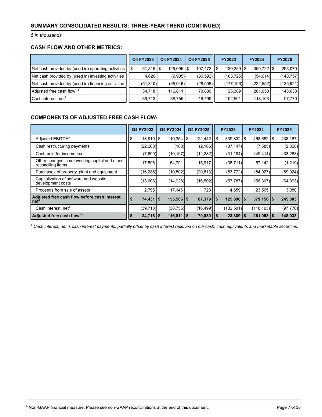 SUMMARY CONSOLIDATED RESULTS: THREE-YEAR TREND (CONTINUED) $ in thousands CASH FLOW AND OTHER METRICS: Q4 FY2023 Q4 FY2024 Q4 FY2025 FY2023 FY2024 FY2025 Net cash provided by (used in) operating activities $ 61,815 $ 125,095 $ 107,472 $ 130,289 $ 350,722 $ 298,070 Net cash provided by (used in) investing activities 4,626 (9,905) (36,592) (103,725) (54,614) (140,757) Net cash provided by (used in) financing activities (51,340) (65,046) (28,508) (177,106) (222,552) (135,921) Adjusted free cash flow1,a 34,718 116,811 70,880 23,389 261,053 148,033 Cash interest, net1 39,713 38,755 16,499 102,501 118,103 97,770 COMPONENTS OF ADJUSTED FREE CASH FLOW: Q4 FY2023 Q4 FY2024 Q4 FY2025 FY2023 FY2024 FY2025 Adjusted EBITDAa $ 113,910 $ 119,354 $ 122,442 $ 339,832 $ 468,682 $ 433,167 Cash restructuring payments (22,288) (188) (2,106) (37,147) (7,585) (2,820) Cash paid for income tax (7,690) (10,107) (12,282) (31,184) (49,414) (33,288) Other changes in net working capital and other reconciling items 17,596 54,791 15,917 (38,711) 57,142 (1,219) Purchases of property, plant and equipment (16,286) (10,502) (20,813) (53,772) (54,927) (89,024) Capitalization of software and website development costs (13,606) (14,928) (16,502) (57,787) (58,307) (64,093) Proceeds from sale of assets 2,795 17,146 723 4,659 23,565 3,080 Adjusted free cash flow before cash interest, neta $ 74,431 $ 155,566 $ 87,379 $ 125,890 $ 379,156 $ 245,803 Cash interest, net1 (39,713) (38,755) (16,499) (102,501) (118,103) (97,770) Adjusted free cash flow1,a $ 34,718 $ 116,811 $ 70,880 $ 23,389 $ 261,053 $ 148,033 1 Cash interest, net is cash interest payments, partially offset by cash interest received on our cash, cash equivalents and marketable securities. a Non-GAAP financial measure. Please see non-GAAP reconciliations at the end of this document. Page 7 of 38