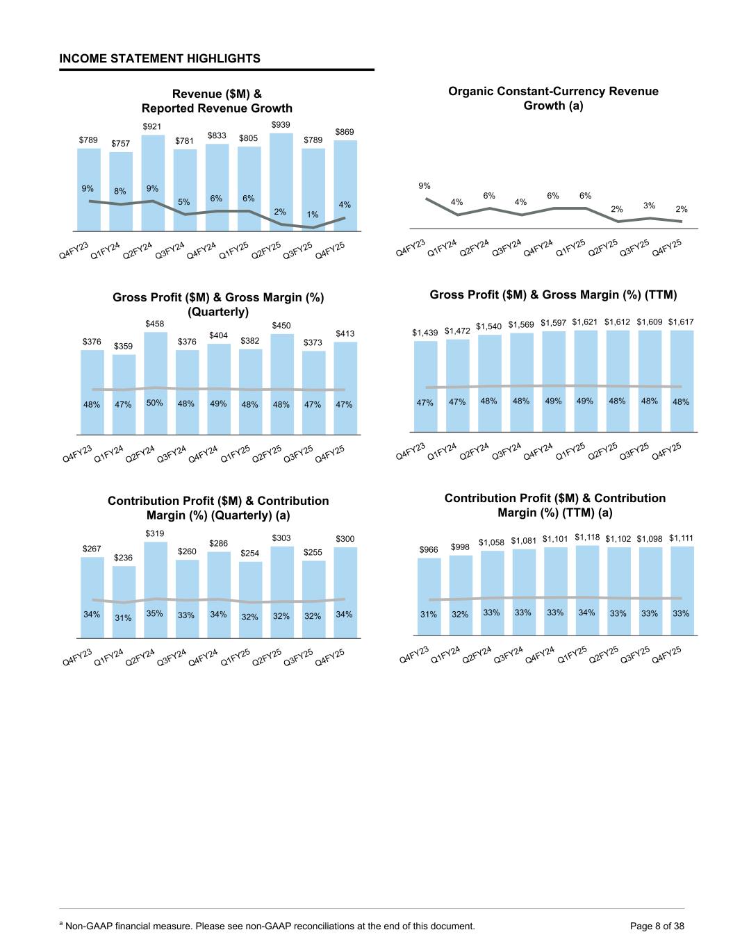 INCOME STATEMENT HIGHLIGHTS Revenue ($M) & Reported Revenue Growth $789 $757 $921 $781 $833 $805 $939 $789 $869 9% 8% 9% 5% 6% 6% 2% 1% 4% Q4FY23 Q1FY24 Q2FY24 Q3FY24 Q4FY24 Q1FY25 Q2FY25 Q3FY25 Q4FY25 Gross Profit ($M) & Gross Margin (%) (Quarterly) $376 $359 $458 $376 $404 $382 $450 $373 $413 48% 47% 50% 48% 49% 48% 48% 47% 47% Q4FY23 Q1FY24 Q2FY24 Q3FY24 Q4FY24 Q1FY25 Q2FY25 Q3FY25 Q4FY25 Contribution Profit ($M) & Contribution Margin (%) (Quarterly) (a) $267 $236 $319 $260 $286 $254 $303 $255 $300 34% 31% 35% 33% 34% 32% 32% 32% 34% Q4FY23 Q1FY24 Q2FY24 Q3FY24 Q4FY24 Q1FY25 Q2FY25 Q3FY25 Q4FY25 Organic Constant-Currency Revenue Growth (a) 9% 4% 6% 4% 6% 6% 2% 3% 2% Q4FY23 Q1FY24 Q2FY24 Q3FY24 Q4FY24 Q1FY25 Q2FY25 Q3FY25 Q4FY25 Gross Profit ($M) & Gross Margin (%) (TTM) $1,439 $1,472 $1,540 $1,569 $1,597 $1,621 $1,612 $1,609 $1,617 47% 47% 48% 48% 49% 49% 48% 48% 48% Q4FY23 Q1FY24 Q2FY24 Q3FY24 Q4FY24 Q1FY25 Q2FY25 Q3FY25 Q4FY25 Contribution Profit ($M) & Contribution Margin (%) (TTM) (a) $966 $998 $1,058 $1,081 $1,101 $1,118 $1,102 $1,098 $1,111 31% 32% 33% 33% 33% 34% 33% 33% 33% Q4FY23 Q1FY24 Q2FY24 Q3FY24 Q4FY24 Q1FY25 Q2FY25 Q3FY25 Q4FY25 a Non-GAAP financial measure. Please see non-GAAP reconciliations at the end of this document. Page 8 of 38