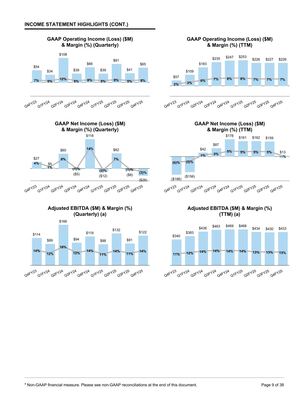 INCOME STATEMENT HIGHLIGHTS (CONT.) GAAP Operating Income (Loss) ($M) & Margin (%) (Quarterly) $54 $34 $108 $39 $66 $39 $81 $41 $65 7% 5% 12% 5% 8% 5% 9% 5% 8% Q4FY23 Q1FY24 Q2FY24 Q3FY24 Q4FY24 Q1FY25 Q2FY25 Q3FY25 Q4FY25 GAAP Net Income (Loss) ($M) & Margin (%) (Quarterly) $27 $5 $60 ($5) $118 ($12) $62 ($8) ($28) 4% 1% 6% (1)% 14% (2)% 7% (1)% (3)% Q4FY23 Q1FY24 Q2FY24 Q3FY24 Q4FY24 Q1FY25 Q2FY25 Q3FY25 Q4FY25 Adjusted EBITDA ($M) & Margin (%) (Quarterly) (a) $114 $89 $166 $94 $119 $88 $132 $91 $122 14% 12% 18% 12% 14% 11% 14% 11% 14% Q4FY23 Q1FY24 Q2FY24 Q3FY24 Q4FY24 Q1FY25 Q2FY25 Q3FY25 Q4FY25 GAAP Operating Income (Loss) ($M) & Margin (%) (TTM) $57 $109 $183 $235 $247 $253 $226 $227 $226 2% 3% 6% 7% 8% 8% 7% 7% 7% Q4FY23 Q1FY24 Q2FY24 Q3FY24 Q4FY24 Q1FY25 Q2FY25 Q3FY25 Q4FY25 GAAP Net Income (Loss) ($M) & Margin (%) (TTM) ($186) ($156) $42 $87 $178 $161 $162 $159 $13 (6)% (5)% 1% 3% 5% 5% 5% 5% —% Q4FY23 Q1FY24 Q2FY24 Q3FY24 Q4FY24 Q1FY25 Q2FY25 Q3FY25 Q4FY25 Adjusted EBITDA ($M) & Margin (%) (TTM) (a) $340 $383 $438 $463 $469 $468 $434 $430 $433 11% 12% 14% 14% 14% 14% 13% 13% 13% Q4FY23 Q1FY24 Q2FY24 Q3FY24 Q4FY24 Q1FY25 Q2FY25 Q3FY25 Q4FY25 a Non-GAAP financial measure. Please see non-GAAP reconciliations at the end of this document. Page 9 of 38