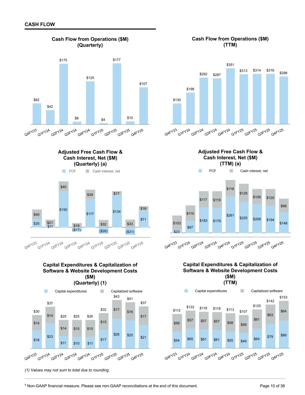 CASH FLOW Cash Flow from Operations ($M) (Quarterly) $62 $42 $175 $8 $125 $4 $177 $10 $107 Q4FY23 Q1FY24 Q2FY24 Q3FY24 Q4FY24 Q1FY25 Q2FY25 Q3FY25 Q4FY25 Adjusted Free Cash Flow & Cash Interest, Net ($M) (Quarterly) (a) $35 $11 $150 ($17) $117 ($26) $134 ($31) $71 $40 $21 $40 $19 $39 $32 $17 $33 $16 FCF Cash interest, net Q4FY23 Q1FY24 Q2FY24 Q3FY24 Q4FY24 Q1FY25 Q2FY25 Q3FY25 Q4FY25 Capital Expenditures & Capitalization of Software & Website Development Costs ($M) (Quarterly) (1) $16 $23 $11 $10 $11 $17 $26 $25 $21 $14 $14 $14 $15 $15 $15 $17 $16 $17 $30 $37 $25 $25 $26 $32 $43 $41 $37 Capital expenditures Capitalized software Q4FY23 Q1FY24 Q2FY24 Q3FY24 Q4FY24 Q1FY25 Q2FY25 Q3FY25 Q4FY25 (1) Values may not sum to total due to rounding. Cash Flow from Operations ($M) (TTM) $130 $198 $292 $287 $351 $313 $314 $316 $298 Q4FY23 Q1FY24 Q2FY24 Q3FY24 Q4FY24 Q1FY25 Q2FY25 Q3FY25 Q4FY25 Adjusted Free Cash Flow & Cash Interest, Net ($M) (TTM) (a) $23 $87 $183 $179 $261 $225 $208 $194 $148$103 $110 $117 $119 $118 $129 $106 $120 $98 FCF Cash interest, net Q4FY23 Q1FY24 Q2FY24 Q3FY24 Q4FY24 Q1FY25 Q2FY25 Q3FY25 Q4FY25 Capital Expenditures & Capitalization of Software & Website Development Costs ($M) (TTM) $54 $65 $61 $61 $55 $49 $64 $79 $89 $58 $57 $57 $57 $58 $58 $61 $63 $64$112 $122 $118 $118 $113 $107 $125 $142 $153 Capital expenditures Capitalized software Q4FY23 Q1FY24 Q2FY24 Q3FY24 Q4FY24 Q1FY25 Q2FY25 Q3FY25 Q4FY25 a Non-GAAP financial measure. Please see non-GAAP reconciliations at the end of this document. Page 10 of 38