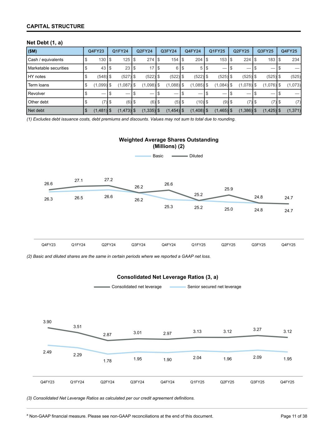 CAPITAL STRUCTURE Net Debt (1, a) ($M) Q4FY23 Q1FY24 Q2FY24 Q3FY24 Q4FY24 Q1FY25 Q2FY25 Q3FY25 Q4FY25 Cash / equivalents $ 130 $ 125 $ 274 $ 154 $ 204 $ 153 $ 224 $ 183 $ 234 Marketable securities $ 43 $ 23 $ 17 $ 6 $ 5 $ — $ — $ — $ — HY notes $ (548) $ (527) $ (522) $ (522) $ (522) $ (525) $ (525) $ (525) $ (525) Term loans $ (1,099) $ (1,087) $ (1,098) $ (1,088) $ (1,085) $ (1,084) $ (1,078) $ (1,076) $ (1,073) Revolver $ — $ — $ — $ — $ — $ — $ — $ — $ — Other debt $ (7) $ (6) $ (6) $ (5) $ (10) $ (9) $ (7) $ (7) $ (7) Net debt $ (1,481) $ (1,473) $ (1,335) $ (1,454) $ (1,408) $ (1,465) $ (1,386) $ (1,425) $ (1,371) (1) Excludes debt issuance costs, debt premiums and discounts. Values may not sum to total due to rounding. Weighted Average Shares Outstanding (Millions) (2) 26.3 26.5 26.6 26.2 25.3 25.2 25.0 24.8 24.7 26.6 27.1 27.2 26.2 26.6 25.2 25.9 24.8 24.7 Basic Diluted Q4FY23 Q1FY24 Q2FY24 Q3FY24 Q4FY24 Q1FY25 Q2FY25 Q3FY25 Q4FY25 (2) Basic and diluted shares are the same in certain periods where we reported a GAAP net loss. Consolidated Net Leverage Ratios (3, a) 3.90 3.51 2.87 3.01 2.97 3.13 3.12 3.27 3.12 2.49 2.29 1.78 1.95 1.90 2.04 1.96 2.09 1.95 Consolidated net leverage Senior secured net leverage Q4FY23 Q1FY24 Q2FY24 Q3FY24 Q4FY24 Q1FY25 Q2FY25 Q3FY25 Q4FY25 (3) Consolidated Net Leverage Ratios as calculated per our credit agreement definitions. a Non-GAAP financial measure. Please see non-GAAP reconciliations at the end of this document. Page 11 of 38