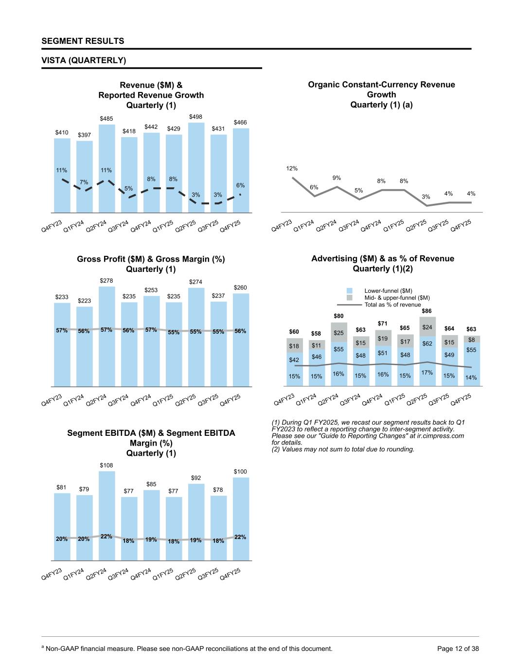 SEGMENT RESULTS VISTA (QUARTERLY) Revenue ($M) & Reported Revenue Growth Quarterly (1) $410 $397 $485 $418 $442 $429 $498 $431 $466 11% 7% 11% 5% 8% 8% 3% 3% 6% Q4FY23 Q1FY24 Q2FY24 Q3FY24 Q4FY24 Q1FY25 Q2FY25 Q3FY25 Q4FY25 Gross Profit ($M) & Gross Margin (%) Quarterly (1) $233 $223 $278 $235 $253 $235 $274 $237 $260 57% 56% 57% 56% 57% 55% 55% 55% 56% Q4FY23 Q1FY24 Q2FY24 Q3FY24 Q4FY24 Q1FY25 Q2FY25 Q3FY25 Q4FY25 Segment EBITDA ($M) & Segment EBITDA Margin (%) Quarterly (1) $81 $79 $108 $77 $85 $77 $92 $78 $100 20% 20% 22% 18% 19% 18% 19% 18% 22% Q4FY23 Q1FY24 Q2FY24 Q3FY24 Q4FY24 Q1FY25 Q2FY25 Q3FY25 Q4FY25 Organic Constant-Currency Revenue Growth Quarterly (1) (a) 12% 6% 9% 5% 8% 8% 3% 4% 4% Q4FY23 Q1FY24 Q2FY24 Q3FY24 Q4FY24 Q1FY25 Q2FY25 Q3FY25 Q4FY25 Advertising ($M) & as % of Revenue Quarterly (1)(2) $60 $58 $80 $63 $71 $65 $86 $64 $63 $42 $46 $55 $48 $51 $48 $62 $49 $55$18 $11 $25 $15 $19 $17 $24 $15 $8 15% 15% 16% 15% 16% 15% 17% 15% 14% Lower-funnel ($M) Mid- & upper-funnel ($M) Total as % of revenue Q4FY23 Q1FY24 Q2FY24 Q3FY24 Q4FY24 Q1FY25 Q2FY25 Q3FY25 Q4FY25 (1) During Q1 FY2025, we recast our segment results back to Q1 FY2023 to reflect a reporting change to inter-segment activity. Please see our "Guide to Reporting Changes" at ir.cimpress.com for details. (2) Values may not sum to total due to rounding. a Non-GAAP financial measure. Please see non-GAAP reconciliations at the end of this document. Page 12 of 38