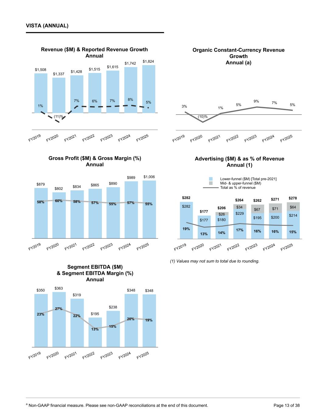 VISTA (ANNUAL) Revenue ($M) & Reported Revenue Growth Annual $1,508 $1,337 $1,428 $1,515 $1,615 $1,742 $1,824 1% (11)% 7% 6% 7% 8% 5% FY2019 FY2020 FY2021 FY2022 FY2023 FY2024 FY2025 Gross Profit ($M) & Gross Margin (%) Annual $879 $802 $834 $865 $890 $989 $1,006 58% 60% 58% 57% 55% 57% 55% FY2019 FY2020 FY2021 FY2022 FY2023 FY2024 FY2025 Segment EBITDA ($M) & Segment EBITDA Margin (%) Annual $350 $363 $319 $195 $238 $348 $348 23% 27% 22% 13% 15% 20% 19% FY2019 FY2020 FY2021 FY2022 FY2023 FY2024 FY2025 Organic Constant-Currency Revenue Growth Annual (a) 3% (10)% 1% 5% 9% 7% 5% FY2019 FY2020 FY2021 FY2022 FY2023 FY2024 FY2025 Advertising ($M) & as % of Revenue Annual (1) $282 $177 $206 $264 $262 $271 $278 $282 $177 $180 $229 $195 $200 $214$26 $34 $67 $71 $64 19% 13% 14% 17% 16% 16% 15% Lower-funnel ($M) [Total pre-2021] Mid- & upper-funnel ($M) Total as % of revenue FY2019 FY2020 FY2021 FY2022 FY2023 FY2024 FY2025 (1) Values may not sum to total due to rounding. a Non-GAAP financial measure. Please see non-GAAP reconciliations at the end of this document. Page 13 of 38