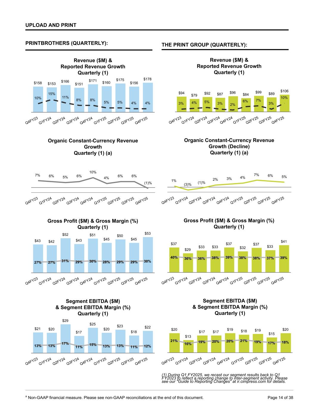 UPLOAD AND PRINT PRINTBROTHERS (QUARTERLY): Revenue ($M) & Reported Revenue Growth Quarterly (1) $158 $153 $166 $151 $171 $160 $175 $156 $178 10% 15% 11% 8% 8% 5% 5% 4% 4% Q4FY23 Q1FY24 Q2FY24 Q3FY24 Q4FY24 Q1FY25 Q2FY25 Q3FY25 Q4FY25 Organic Constant-Currency Revenue Growth Quarterly (1) (a) 7% 6% 5% 6% 10% 4% 6% 6% (1)% Q4FY23 Q1FY24 Q2FY24 Q3FY24 Q4FY24 Q1FY25 Q2FY25 Q3FY25 Q4FY25 Gross Profit ($M) & Gross Margin (%) Quarterly (1) $43 $42 $52 $43 $51 $45 $50 $45 $53 27% 27% 31% 29% 30% 28% 29% 29% 30% Q4FY23 Q1FY24 Q2FY24 Q3FY24 Q4FY24 Q1FY25 Q2FY25 Q3FY25 Q4FY25 Segment EBITDA ($M) & Segment EBITDA Margin (%) Quarterly (1) $21 $20 $29 $17 $25 $20 $23 $18 $22 13% 13% 17% 11% 15% 13% 13% 11% 12% Q4FY23 Q1FY24 Q2FY24 Q3FY24 Q4FY24 Q1FY25 Q2FY25 Q3FY25 Q4FY25 THE PRINT GROUP (QUARTERLY): Revenue ($M) & Reported Revenue Growth Quarterly (1) $94 $79 $92 $87 $96 $84 $99 $89 $106 3% 4% 5% 3% 2% 6% 7% 3% 10% Q4FY23 Q1FY24 Q2FY24 Q3FY24 Q4FY24 Q1FY25 Q2FY25 Q3FY25 Q4FY25 0 Organic Constant-Currency Revenue Growth (Decline) Quarterly (1) (a) 1% (3)% (1)% 2% 3% 4% 7% 6% 5% Q4FY23 Q1FY24 Q2FY24 Q3FY24 Q4FY24 Q1FY25 Q2FY25 Q3FY25 Q4FY25 Gross Profit ($M) & Gross Margin (%) Quarterly (1) $37 $29 $33 $33 $37 $32 $37 $33 $41 40% 36% 36% 38% 39% 38% 38% 37% 39% Q4FY23 Q1FY24 Q2FY24 Q3FY24 Q4FY24 Q1FY25 Q2FY25 Q3FY25 Q4FY25 Segment EBITDA ($M) & Segment EBITDA Margin (%) Quarterly (1) $20 $13 $17 $17 $19 $18 $19 $15 $20 21% 16% 19% 20% 20% 21% 19% 17% 18% Q4FY23 Q1FY24 Q2FY24 Q3FY24 Q4FY24 Q1FY25 Q2FY25 Q3FY25 Q4FY25 (1) During Q1 FY2025, we recast our segment results back to Q1 FY2023 to reflect a reporting change to inter-segment activity. Please see our "Guide to Reporting Changes" at ir.cimpress.com for details. a Non-GAAP financial measure. Please see non-GAAP reconciliations at the end of this document. Page 14 of 38