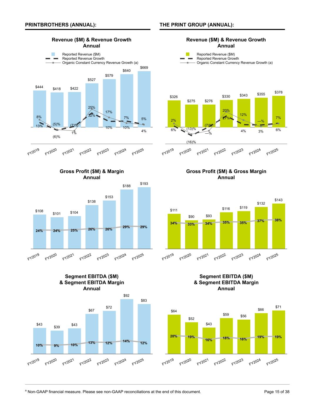 PRINTBROTHERS (ANNUAL): Revenue ($M) & Revenue Growth Annual $444 $418 $422 $527 $579 $640 $669 8% (6)% 1% 25% 10% 10% 5% 13% (5)% (7)% 32% 17% 7% 4% Reported Revenue ($M) Reported Revenue Growth Organic Constant Currency Revenue Growth (a) FY2019 FY2020 FY2021 FY2022 FY2023 FY2024 FY2025 Gross Profit ($M) & Margin Annual $108 $101 $104 $138 $153 $188 $193 24% 24% 25% 26% 26% 29% 29% FY2019 FY2020 FY2021 FY2022 FY2023 FY2024 FY2025 Segment EBITDA ($M) & Segment EBITDA Margin Annual $43 $39 $43 $67 $72 $92 $83 10% 9% 10% 13% 12% 14% 12% FY2019 FY2020 FY2021 FY2022 FY2023 FY2024 FY2025 THE PRINT GROUP (ANNUAL): Revenue ($M) & Revenue Growth Annual $326 $275 $276 $330 $343 $355 $378 2% (16)% —% 20% 4% 3% 7% 6% (13)% (7)% 27% 12% —% 6% Reported Revenue ($M) Reported Revenue Growth Organic Constant Currency Revenue Growth (a) FY2019 FY2020 FY2021 FY2022 FY2023 FY2024 FY2025 Gross Profit ($M) & Gross Margin Annual $111 $90 $93 $116 $119 $132 $143 34% 33% 34% 35% 35% 37% 38% FY2019 FY2020 FY2021 FY2022 FY2023 FY2024 FY2025 Segment EBITDA ($M) & Segment EBITDA Margin Annual $64 $52 $43 $59 $56 $66 $71 20% 19% 16% 18% 16% 19% 19% FY2019 FY2020 FY2021 FY2022 FY2023 FY2024 FY2025 a Non-GAAP financial measure. Please see non-GAAP reconciliations at the end of this document. Page 15 of 38