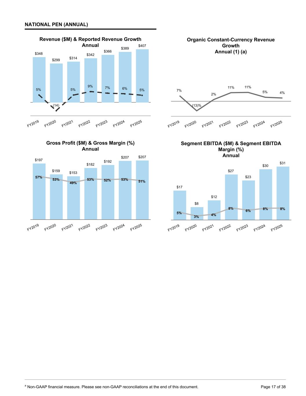 NATIONAL PEN (ANNUAL) Revenue ($M) & Reported Revenue Growth Annual $348 $299 $314 $342 $366 $389 $407 5% (14) 5% 9% 7% 6% 5% FY2019 FY2020 FY2021 FY2022 FY2023 FY2024 FY2025 Gross Profit ($M) & Gross Margin (%) Annual $197 $159 $153 $182 $192 $207 $207 57% 53% 49% 53% 52% 53% 51% FY2019 FY2020 FY2021 FY2022 FY2023 FY2024 FY2025 Organic Constant-Currency Revenue Growth Annual (1) (a) 7% (13)% 2% 11% 11% 5% 4% FY2019 FY2020 FY2021 FY2022 FY2023 FY2024 FY2025 Segment EBITDA ($M) & Segment EBITDA Margin (%) Annual $17 $8 $12 $27 $23 $30 $31 5% 3% 4% 8% 6% 8% 8% FY2019 FY2020 FY2021 FY2022 FY2023 FY2024 FY2025 a Non-GAAP financial measure. Please see non-GAAP reconciliations at the end of this document. Page 17 of 38