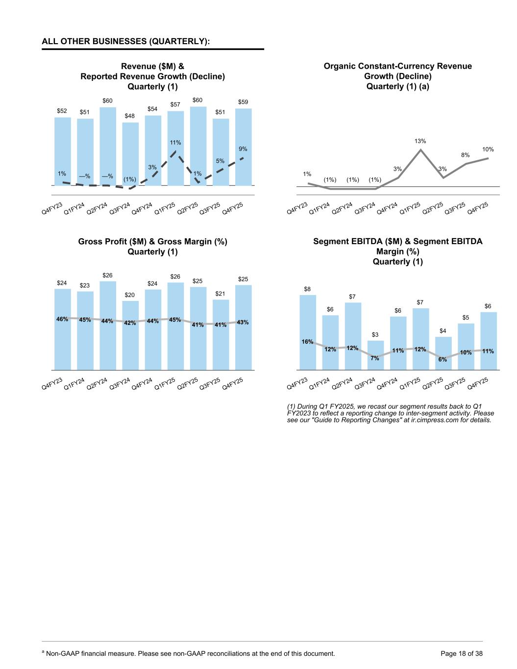 ALL OTHER BUSINESSES (QUARTERLY): Revenue ($M) & Reported Revenue Growth (Decline) Quarterly (1) $52 $51 $60 $48 $54 $57 $60 $51 $59 1% —% —% (1%) 3% 11% 1% 5% 9% Q4FY23 Q1FY24 Q2FY24 Q3FY24 Q4FY24 Q1FY25 Q2FY25 Q3FY25 Q4FY25 Gross Profit ($M) & Gross Margin (%) Quarterly (1) $24 $23 $26 $20 $24 $26 $25 $21 $25 46% 45% 44% 42% 44% 45% 41% 41% 43% Q4FY23 Q1FY24 Q2FY24 Q3FY24 Q4FY24 Q1FY25 Q2FY25 Q3FY25 Q4FY25 Organic Constant-Currency Revenue Growth (Decline) Quarterly (1) (a) 1% (1%) (1%) (1%) 3% 13% 3% 8% 10% Q4FY23 Q1FY24 Q2FY24 Q3FY24 Q4FY24 Q1FY25 Q2FY25 Q3FY25 Q4FY25 Segment EBITDA ($M) & Segment EBITDA Margin (%) Quarterly (1) $8 $6 $7 $3 $6 $7 $4 $5 $6 16% 12% 12% 7% 11% 12% 6% 10% 11% Q4FY23 Q1FY24 Q2FY24 Q3FY24 Q4FY24 Q1FY25 Q2FY25 Q3FY25 Q4FY25 (1) During Q1 FY2025, we recast our segment results back to Q1 FY2023 to reflect a reporting change to inter-segment activity. Please see our "Guide to Reporting Changes" at ir.cimpress.com for details. a Non-GAAP financial measure. Please see non-GAAP reconciliations at the end of this document. Page 18 of 38