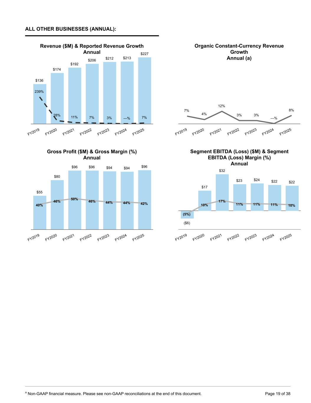 ALL OTHER BUSINESSES (ANNUAL): Revenue ($M) & Reported Revenue Growth Annual $136 $174 $192 $206 $212 $213 $227 239% 28% 11% 7% 3% —% 7% FY2019 FY2020 FY2021 FY2022 FY2023 FY2024 FY2025 Gross Profit ($M) & Gross Margin (%) Annual $55 $80 $96 $96 $94 $94 $96 40% 46% 50% 46% 44% 44% 42% FY2019 FY2020 FY2021 FY2022 FY2023 FY2024 FY2025 Organic Constant-Currency Revenue Growth Annual (a) 7% 4% 12% 3% 3% —% 8% FY2019 FY2020 FY2021 FY2022 FY2023 FY2024 FY2025 Segment EBITDA (Loss) ($M) & Segment EBITDA (Loss) Margin (%) Annual ($6) $17 $32 $23 $24 $22 $22 (5%) 10% 17% 11% 11% 11% 10% FY2019 FY2020 FY2021 FY2022 FY2023 FY2024 FY2025 a Non-GAAP financial measure. Please see non-GAAP reconciliations at the end of this document. Page 19 of 38