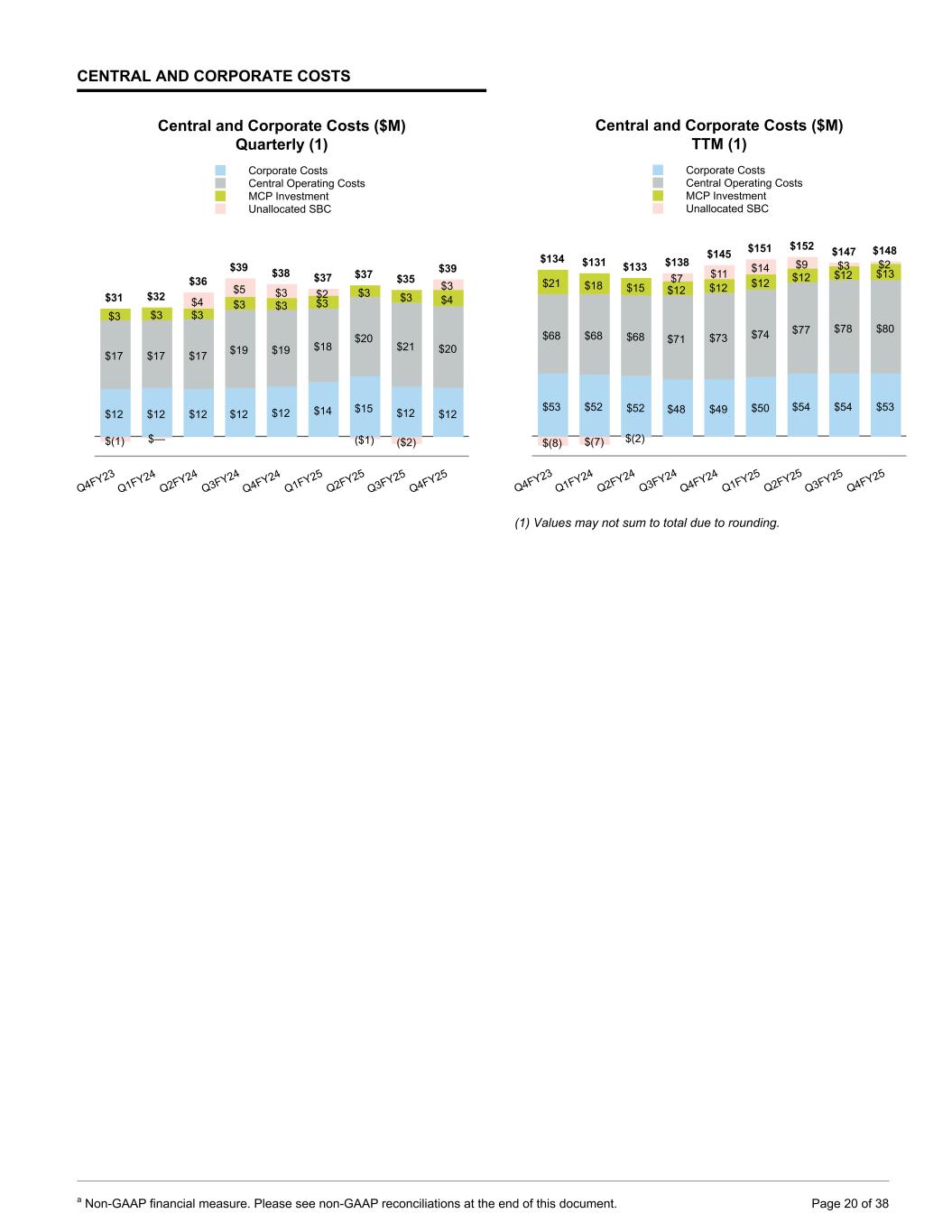 CENTRAL AND CORPORATE COSTS Central and Corporate Costs ($M) Quarterly (1) $12 $12 $12 $12 $12 $14 $15 $12 $12 $17 $17 $17 $19 $19 $18 $20 $21 $20 $3 $3 $3 $3 $3 $3 $3 $3 $4 $(1) $— $4 $5 $3 $2 ($1) ($2) $3 $31 $32 $36 $39 $38 $37 $37 $35 $39 Corporate Costs Central Operating Costs MCP Investment Unallocated SBC Q4FY23 Q1FY24 Q2FY24 Q3FY24 Q4FY24 Q1FY25 Q2FY25 Q3FY25 Q4FY25 Central and Corporate Costs ($M) TTM (1) $53 $52 $52 $48 $49 $50 $54 $54 $53 $68 $68 $68 $71 $73 $74 $77 $78 $80 $21 $18 $15 $12 $12 $12 $12 $12 $13 $(8) $(7) $(2) $7 $11 $14 $9 $3 $2$134 $131 $133 $138 $145 $151 $152 $147 $148 Corporate Costs Central Operating Costs MCP Investment Unallocated SBC Q4FY23 Q1FY24 Q2FY24 Q3FY24 Q4FY24 Q1FY25 Q2FY25 Q3FY25 Q4FY25 (1) Values may not sum to total due to rounding. a Non-GAAP financial measure. Please see non-GAAP reconciliations at the end of this document. Page 20 of 38