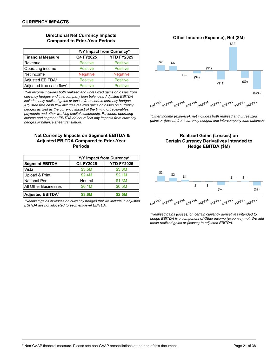 CURRENCY IMPACTS Directional Net Currency Impacts Compared to Prior-Year Periods Y/Y Impact from Currency* Financial Measure Q4 FY2025 YTD FY2025 Revenue Positive Positive Operating income Positive Positive Net income Negative Negative Adjusted EBITDAa Positive Positive Adjusted free cash flowa Positive Positive *Net income includes both realized and unrealized gains or losses from currency hedges and intercompany loan balances. Adjusted EBITDA includes only realized gains or losses from certain currency hedges. Adjusted free cash flow includes realized gains or losses on currency hedges as well as the currency impact of the timing of receivables, payments and other working capital settlements. Revenue, operating income and segment EBITDA do not reflect any impacts from currency hedges or balance sheet translation. Net Currency Impacts on Segment EBITDA & Adjusted EBITDA Compared to Prior-Year Periods Y/Y Impact from Currency* Segment EBITDA Q4 FY2025 YTD FY2025 Vista $3.5M $3.8M Upload & Print $2.4M $2.1M National Pen Neutral $1.3M All Other Businesses $0.1M $0.5M Adjusted EBITDAa $3.6M $2.5M *Realized gains or losses on currency hedges that we include in adjusted EBITDA are not allocated to segment-level EBITDA. Other Income (Expense), Net ($M) $7 $6 $— ($4) ($1) ($11) $32 ($9) ($24) Q4FY23 Q1FY24 Q2FY24 Q3FY24 Q4FY24 Q1FY25 Q2FY25 Q3FY25 Q4FY25 *Other income (expense), net includes both realized and unrealized gains or (losses) from currency hedges and intercompany loan balances. Realized Gains (Losses) on Certain Currency Derivatives Intended to Hedge EBITDA ($M) $3 $2 $1 $— $— ($2) $— $— ($2) Q4FY23 Q1FY24 Q2FY24 Q3FY24 Q4FY24 Q1FY25 Q2FY25 Q3FY25 Q4FY25 *Realized gains (losses) on certain currency derivatives intended to hedge EBITDA is a component of Other income (expense), net. We add these realized gains or (losses) to adjusted EBITDA. a Non-GAAP financial measure. Please see non-GAAP reconciliations at the end of this document. Page 21 of 38