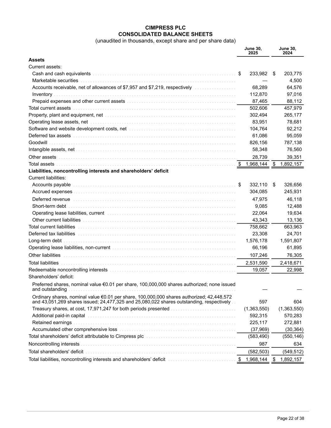 CIMPRESS PLC CONSOLIDATED BALANCE SHEETS (unaudited in thousands, except share and per share data) June 30, 2025 June 30, 2024 Assets Current assets: Cash and cash equivalents . . . . . . . . . . . . . . . . . . . . . . . . . . . . . . . . . . . . . . . . . . . . . . . . . . . . . . . . . . . $ 233,982 $ 203,775 Marketable securities . . . . . . . . . . . . . . . . . . . . . . . . . . . . . . . . . . . . . . . . . . . . . . . . . . . . . . . . . . . . . . . . — 4,500 Accounts receivable, net of allowances of $7,957 and $7,219, respectively . . . . . . . . . . . . . . . . . 68,289 64,576 Inventory . . . . . . . . . . . . . . . . . . . . . . . . . . . . . . . . . . . . . . . . . . . . . . . . . . . . . . . . . . . . . . . . . . . . . . . . . . . 112,870 97,016 Prepaid expenses and other current assets . . . . . . . . . . . . . . . . . . . . . . . . . . . . . . . . . . . . . . . . . . . . . 87,465 88,112 Total current assets . . . . . . . . . . . . . . . . . . . . . . . . . . . . . . . . . . . . . . . . . . . . . . . . . . . . . . . . . . . . . . . . . . . 502,606 457,979 Property, plant and equipment, net . . . . . . . . . . . . . . . . . . . . . . . . . . . . . . . . . . . . . . . . . . . . . . . . . . . . . . 302,494 265,177 Operating lease assets, net . . . . . . . . . . . . . . . . . . . . . . . . . . . . . . . . . . . . . . . . . . . . . . . . . . . . . . . . . . . . 83,951 78,681 Software and website development costs, net . . . . . . . . . . . . . . . . . . . . . . . . . . . . . . . . . . . . . . . . . . . . 104,764 92,212 Deferred tax assets . . . . . . . . . . . . . . . . . . . . . . . . . . . . . . . . . . . . . . . . . . . . . . . . . . . . . . . . . . . . . . . . . . . 61,086 95,059 Goodwill . . . . . . . . . . . . . . . . . . . . . . . . . . . . . . . . . . . . . . . . . . . . . . . . . . . . . . . . . . . . . . . . . . . . . . . . . . . . . 826,156 787,138 Intangible assets, net . . . . . . . . . . . . . . . . . . . . . . . . . . . . . . . . . . . . . . . . . . . . . . . . . . . . . . . . . . . . . . . . . . 58,348 76,560 Other assets . . . . . . . . . . . . . . . . . . . . . . . . . . . . . . . . . . . . . . . . . . . . . . . . . . . . . . . . . . . . . . . . . . . . . . . . . 28,739 39,351 Total assets . . . . . . . . . . . . . . . . . . . . . . . . . . . . . . . . . . . . . . . . . . . . . . . . . . . . . . . . . . . . . . . . . . . . . . . . . . $ 1,968,144 $ 1,892,157 Liabilities, noncontrolling interests and shareholders’ deficit Current liabilities: Accounts payable . . . . . . . . . . . . . . . . . . . . . . . . . . . . . . . . . . . . . . . . . . . . . . . . . . . . . . . . . . . . . . . . . . . $ 332,110 $ 326,656 Accrued expenses . . . . . . . . . . . . . . . . . . . . . . . . . . . . . . . . . . . . . . . . . . . . . . . . . . . . . . . . . . . . . . . . . . . 304,085 245,931 Deferred revenue . . . . . . . . . . . . . . . . . . . . . . . . . . . . . . . . . . . . . . . . . . . . . . . . . . . . . . . . . . . . . . . . . . . 47,975 46,118 Short-term debt . . . . . . . . . . . . . . . . . . . . . . . . . . . . . . . . . . . . . . . . . . . . . . . . . . . . . . . . . . . . . . . . . . . . . 9,085 12,488 Operating lease liabilities, current . . . . . . . . . . . . . . . . . . . . . . . . . . . . . . . . . . . . . . . . . . . . . . . . . . . . . 22,064 19,634 Other current liabilities . . . . . . . . . . . . . . . . . . . . . . . . . . . . . . . . . . . . . . . . . . . . . . . . . . . . . . . . . . . . . . . 43,343 13,136 Total current liabilities . . . . . . . . . . . . . . . . . . . . . . . . . . . . . . . . . . . . . . . . . . . . . . . . . . . . . . . . . . . . . . . . . 758,662 663,963 Deferred tax liabilities . . . . . . . . . . . . . . . . . . . . . . . . . . . . . . . . . . . . . . . . . . . . . . . . . . . . . . . . . . . . . . . . . 23,308 24,701 Long-term debt . . . . . . . . . . . . . . . . . . . . . . . . . . . . . . . . . . . . . . . . . . . . . . . . . . . . . . . . . . . . . . . . . . . . . . . 1,576,178 1,591,807 Operating lease liabilities, non-current . . . . . . . . . . . . . . . . . . . . . . . . . . . . . . . . . . . . . . . . . . . . . . . . . . . 66,196 61,895 Other liabilities . . . . . . . . . . . . . . . . . . . . . . . . . . . . . . . . . . . . . . . . . . . . . . . . . . . . . . . . . . . . . . . . . . . . . . . 107,246 76,305 Total liabilities . . . . . . . . . . . . . . . . . . . . . . . . . . . . . . . . . . . . . . . . . . . . . . . . . . . . . . . . . . . . . . . . . . . . . . . . 2,531,590 2,418,671 Redeemable noncontrolling interests . . . . . . . . . . . . . . . . . . . . . . . . . . . . . . . . . . . . . . . . . . . . . . . . . . . . 19,057 22,998 Shareholders’ deficit: Preferred shares, nominal value €0.01 per share, 100,000,000 shares authorized; none issued and outstanding . . . . . . . . . . . . . . . . . . . . . . . . . . . . . . . . . . . . . . . . . . . . . . . . . . . . . . . . . . . . . . . . . . . . . — — Ordinary shares, nominal value €0.01 per share, 100,000,000 shares authorized; 42,448,572 and 43,051,269 shares issued; 24,477,325 and 25,080,022 shares outstanding, respectively . . 597 604 Treasury shares, at cost, 17,971,247 for both periods presented . . . . . . . . . . . . . . . . . . . . . . . . . . . (1,363,550) (1,363,550) Additional paid-in capital . . . . . . . . . . . . . . . . . . . . . . . . . . . . . . . . . . . . . . . . . . . . . . . . . . . . . . . . . . . . . 592,315 570,283 Retained earnings . . . . . . . . . . . . . . . . . . . . . . . . . . . . . . . . . . . . . . . . . . . . . . . . . . . . . . . . . . . . . . . . . . . 225,117 272,881 Accumulated other comprehensive loss . . . . . . . . . . . . . . . . . . . . . . . . . . . . . . . . . . . . . . . . . . . . . . . . (37,969) (30,364) Total shareholders’ deficit attributable to Cimpress plc . . . . . . . . . . . . . . . . . . . . . . . . . . . . . . . . . . . . . (583,490) (550,146) Noncontrolling interests . . . . . . . . . . . . . 