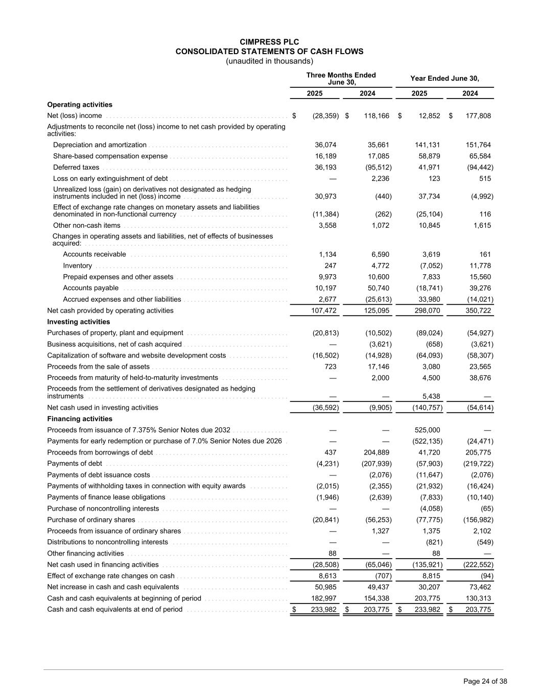 CIMPRESS PLC CONSOLIDATED STATEMENTS OF CASH FLOWS (unaudited in thousands) Three Months Ended June 30, Year Ended June 30, 2025 2024 2025 2024 Operating activities Net (loss) income . . . . . . . . . . . . . . . . . . . . . . . . . . . . . . . . . . . . . . . . . . . . . . . . . . . . $ (28,359) $ 118,166 $ 12,852 $ 177,808 Adjustments to reconcile net (loss) income to net cash provided by operating activities: Depreciation and amortization . . . . . . . . . . . . . . . . . . . . . . . . . . . . . . . . . . . . . . . . 36,074 35,661 141,131 151,764 Share-based compensation expense . . . . . . . . . . . . . . . . . . . . . . . . . . . . . . . . . . 16,189 17,085 58,879 65,584 Deferred taxes . . . . . . . . . . . . . . . . . . . . . . . . . . . . . . . . . . . . . . . . . . . . . . . . . . . . . 36,193 (95,512) 41,971 (94,442) Loss on early extinguishment of debt . . . . . . . . . . . . . . . . . . . . . . . . . . . . . . . . . . — 2,236 123 515 Unrealized loss (gain) on derivatives not designated as hedging instruments included in net (loss) income . . . . . . . . . . . . . . . . . . . . . . . . . . . . . . 30,973 (440) 37,734 (4,992) Effect of exchange rate changes on monetary assets and liabilities denominated in non-functional currency . . . . . . . . . . . . . . . . . . . . . . . . . . . . . . . (11,384) (262) (25,104) 116 Other non-cash items . . . . . . . . . . . . . . . . . . . . . . . . . . . . . . . . . . . . . . . . . . . . . . . 3,558 1,072 10,845 1,615 Changes in operating assets and liabilities, net of effects of businesses acquired: . . . . . . . . . . . . . . . . . . . . . . . . . . . . . . . . . . . . . . . . . . . . . . . . . . . . . . . . . . Accounts receivable . . . . . . . . . . . . . . . . . . . . . . . . . . . . . . . . . . . . . . . . . . . . . 1,134 6,590 3,619 161 Inventory . . . . . . . . . . . . . . . . . . . . . . . . . . . . . . . . . . . . . . . . . . . . . . . . . . . . . . . 247 4,772 (7,052) 11,778 Prepaid expenses and other assets . . . . . . . . . . . . . . . . . . . . . . . . . . . . . . . . 9,973 10,600 7,833 15,560 Accounts payable . . . . . . . . . . . . . . . . . . . . . . . . . . . . . . . . . . . . . . . . . . . . . . . 10,197 50,740 (18,741) 39,276 Accrued expenses and other liabilities . . . . . . . . . . . . . . . . . . . . . . . . . . . . . . 2,677 (25,613) 33,980 (14,021) Net cash provided by operating activities 107,472 125,095 298,070 350,722 Investing activities Purchases of property, plant and equipment . . . . . . . . . . . . . . . . . . . . . . . . . . . . . (20,813) (10,502) (89,024) (54,927) Business acquisitions, net of cash acquired . . . . . . . . . . . . . . . . . . . . . . . . . . . . . . — (3,621) (658) (3,621) Capitalization of software and website development costs . . . . . . . . . . . . . . . . . (16,502) (14,928) (64,093) (58,307) Proceeds from the sale of assets . . . . . . . . . . . . . . . . . . . . . . . . . . . . . . . . . . . . . . . 723 17,146 3,080 23,565 Proceeds from maturity of held-to-maturity investments . . . . . . . . . . . . . . . . . . . — 2,000 4,500 38,676 Proceeds from the settlement of derivatives designated as hedging instruments . . . . . . . . . . . . . . . . . . . . . . . . . . . . . . . . . . . . . . . . . . . . . . . . . . . . . . . . . — — 5,438 — Net cash used in investing activities (36,592) (9,905) (140,757) (54,614) Financing activities Proceeds from issuance of 7.375% Senior Notes due 2032 . . . . . . . . . . . . . . . . — — 525,000 — Payments for early redemption or purchase of 7.0% Senior Notes due 2026 . — — (522,135) (24,471) Proceeds from borrowings of debt . . . . . . . . . . . . . . . . . . . . . . . . . . . . . . . . . . . . . . 437 204,889 41,720 205,775 Payments of debt . . . . . . . . . . . . . . . . . . . . . . . . . . . . . . . . . . . . . . . . . . . . . . . . . . . . (4,231) (207,939) (57,903) (219,722) Payments of debt issuance costs . . . . . . . . . . . . . . . . . . . . . . . . . . . . . . . . . . . . . . . — (2,076) (11,647) (2,076) Payments of withholding taxes in connection with equity awards . . . . . . . . . . . (2,015) (2,355) (21,932) (16,424) Payments of finance lease obligations . . . . . . . . . . . . . . . . . . . . . . . . . . . . . . . . . . (1,946) (2,639) (7,833) (10,140) Purchase of noncontrolling interests . . . . . . . . . . . . . . . . . . . . . . . . . . . . . . . . . . . . — — (4,058) (65) Purchase of ordinary shares . . . . . . . . . . . . . . . . . . . . . . . . . . . . . . . . . . . . . . . . . . . (20,841) (56,253) (77,775) (156,982) Proceeds from issuance of ordinary shares . . . . . . . . . . . . . . . . . . . . . . . . . . . . . . — 1,327 1,375 2,102 Distributions to noncontrolling interests . . . . . . . . . . . . . . . . . . . . . . . . . . . . . . . . . — — (821) (549) Other financing activities . . . . . . . . . . . . . . . . . . . . . . . . . . . . . . . . . . . . . . . . . . . . . . 88 — 88 — Net cash used in financing activities . . . . . . . . . . . . . . . . . . . . . . . . . . . . . . . . . . . . (28,508) (65,046) (135,921) (222,552) Effect of exchange rate changes on cash . . . . . . . . . . . . . . . . . . . . . . . . . . . . . . . . 8,613 (707) 8,815 (94) Net increase in cash and cash equivalents . . . . . . . . . . . . . . . . . . . . . . . . . . . . . . 50,985 49,437 30,207 73,462 Cash and cash equivalents at beginning of period . . . . . . . . . . . . . . . . . . . . . . . . 182,997 154,338 203,775 130,313 Cash and cash equivalents at end of period . . . . . . . . . . . . . . . . . . . . . . . . . . . . . $ 233,982 $ 203,775 $ 233,982 $ 203,775 Page 24 of 38