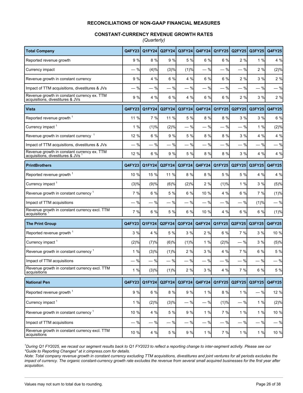 RECONCILIATIONS OF NON-GAAP FINANCIAL MEASURES CONSTANT-CURRENCY REVENUE GROWTH RATES (Quarterly) Total Company Q4FY23 Q1FY24 Q2FY24 Q3FY24 Q4FY24 Q1FY25 Q2FY25 Q3FY25 Q4FY25 Reported revenue growth 9 % 8 % 9 % 5 % 6 % 6 % 2 % 1 % 4 % Currency impact — % (4) % (3) % (1) % — % — % — % 2 % (2) % Revenue growth in constant currency 9 % 4 % 6 % 4 % 6 % 6 % 2 % 3 % 2 % Impact of TTM acquisitions, divestitures & JVs — % — % — % — % — % — % — % — % — % Revenue growth in constant currency ex. TTM acquisitions, divestitures & JVs 9 % 4 % 6 % 4 % 6 % 6 % 2 % 3 % 2 % Vista Q4FY23 Q1FY24 Q2FY24 Q3FY24 Q4FY24 Q1FY25 Q2FY25 Q3FY25 Q4FY25 Reported revenue growth 1 11 % 7 % 11 % 5 % 8 % 8 % 3 % 3 % 6 % Currency impact 1 1 % (1) % (2) % — % — % — % — % 1 % (2) % Revenue growth in constant currency 1 12 % 6 % 9 % 5 % 8 % 8 % 3 % 4 % 4 % Impact of TTM acquisitions, divestitures & JVs — % — % — % — % — % — % — % — % — % Revenue growth in constant currency ex. TTM acquisitions, divestitures & JVs 1 12 % 6 % 9 % 5 % 8 % 8 % 3 % 4 % 4 % PrintBrothers Q4FY23 Q1FY24 Q2FY24 Q3FY24 Q4FY24 Q1FY25 Q2FY25 Q3FY25 Q4FY25 Reported revenue growth 1 10 % 15 % 11 % 8 % 8 % 5 % 5 % 4 % 4 % Currency impact 1 (3) % (9) % (6) % (2) % 2 % (1) % 1 % 3 % (5) % Revenue growth in constant currency 1 7 % 6 % 5 % 6 % 10 % 4 % 6 % 7 % (1) % Impact of TTM acquisitions — % — % — % — % — % — % — % (1) % — % Revenue growth in constant currency excl. TTM acquisitions 1 7 % 6 % 5 % 6 % 10 % 4 % 6 % 6 % (1) % The Print Group Q4FY23 Q1FY24 Q2FY24 Q3FY24 Q4FY24 Q1FY25 Q2FY25 Q3FY25 Q4FY25 Reported revenue growth 1 3 % 4 % 5 % 3 % 2 % 6 % 7 % 3 % 10 % Currency impact 1 (2) % (7) % (6) % (1) % 1 % (2) % — % 3 % (5) % Revenue growth in constant currency 1 1 % (3) % (1) % 2 % 3 % 4 % 7 % 6 % 5 % Impact of TTM acquisitions — % — % — % — % — % — % — % — % — % Revenue growth in constant currency excl. TTM acquisitions 1 % (3) % (1) % 2 % 3 % 4 % 7 % 6 % 5 % National Pen Q4FY23 Q1FY24 Q2FY24 Q3FY24 Q4FY24 Q1FY25 Q2FY25 Q3FY25 Q4FY25 Reported revenue growth 1 9 % 6 % 8 % 9 % 1 % 8 % 1 % — % 12 % Currency impact 1 1 % (2) % (3) % — % — % (1) % — % 1 % (2) % Revenue growth in constant currency 1 10 % 4 % 5 % 9 % 1 % 7 % 1 % 1 % 10 % Impact of TTM acquisitions — % — % — % — % — % — % — % — % — % Revenue growth in constant currency excl. TTM acquisitions 10 % 4 % 5 % 9 % 1 % 7 % 1 % 1 % 10 % 1During Q1 FY2025, we recast our segment results back to Q1 FY2023 to reflect a reporting change to inter-segment activity. Please see our "Guide to Reporting Changes" at ir.cimpress.com for details. Note: Total company revenue growth in constant currency excluding TTM acquisitions, divestitures and joint ventures for all periods excludes the impact of currency. The organic constant-currency growth rate excludes the revenue from several small acquired businesses for the first year after acquisition. Values may not sum to total due to rounding. Page 26 of 38