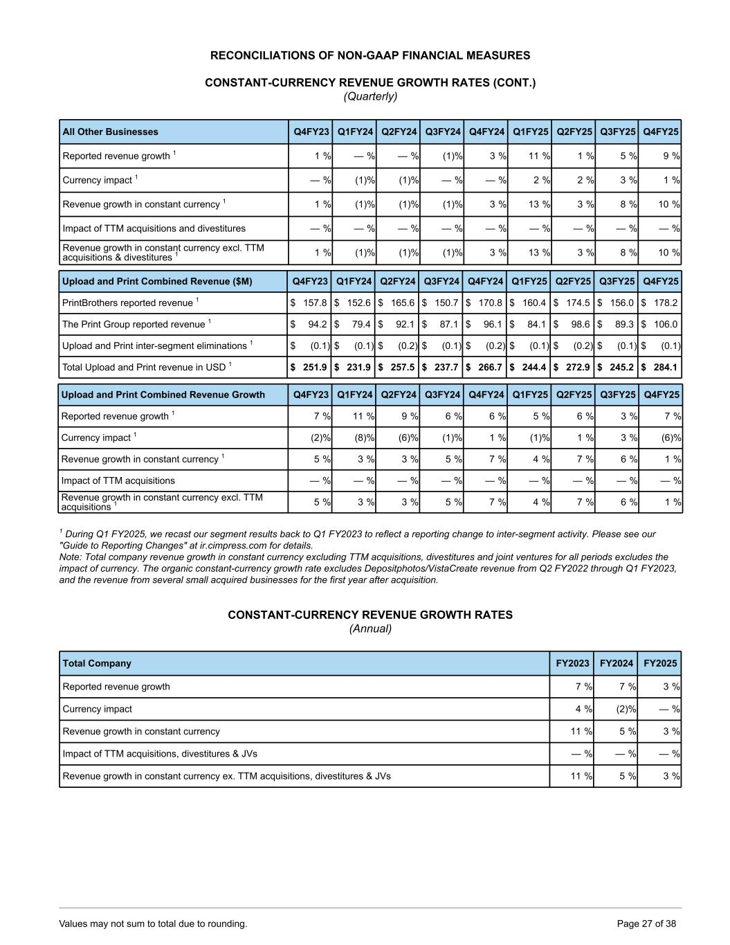 RECONCILIATIONS OF NON-GAAP FINANCIAL MEASURES CONSTANT-CURRENCY REVENUE GROWTH RATES (CONT.) (Quarterly) All Other Businesses Q4FY23 Q1FY24 Q2FY24 Q3FY24 Q4FY24 Q1FY25 Q2FY25 Q3FY25 Q4FY25 Reported revenue growth 1 1 % — % — % (1) % 3 % 11 % 1 % 5 % 9 % Currency impact 1 — % (1) % (1) % — % — % 2 % 2 % 3 % 1 % Revenue growth in constant currency 1 1 % (1) % (1) % (1) % 3 % 13 % 3 % 8 % 10 % Impact of TTM acquisitions and divestitures — % — % — % — % — % — % — % — % — % Revenue growth in constant currency excl. TTM acquisitions & divestitures 1 1 % (1) % (1) % (1) % 3 % 13 % 3 % 8 % 10 % Upload and Print Combined Revenue ($M) Q4FY23 Q1FY24 Q2FY24 Q3FY24 Q4FY24 Q1FY25 Q2FY25 Q3FY25 Q4FY25 PrintBrothers reported revenue 1 $ 157.8 $ 152.6 $ 165.6 $ 150.7 $ 170.8 $ 160.4 $ 174.5 $ 156.0 $ 178.2 The Print Group reported revenue 1 $ 94.2 $ 79.4 $ 92.1 $ 87.1 $ 96.1 $ 84.1 $ 98.6 $ 89.3 $ 106.0 Upload and Print inter-segment eliminations 1 $ (0.1) $ (0.1) $ (0.2) $ (0.1) $ (0.2) $ (0.1) $ (0.2) $ (0.1) $ (0.1) Total Upload and Print revenue in USD 1 $ 251.9 $ 231.9 $ 257.5 $ 237.7 $ 266.7 $ 244.4 $ 272.9 $ 245.2 $ 284.1 Upload and Print Combined Revenue Growth Q4FY23 Q1FY24 Q2FY24 Q3FY24 Q4FY24 Q1FY25 Q2FY25 Q3FY25 Q4FY25 Reported revenue growth 1 7 % 11 % 9 % 6 % 6 % 5 % 6 % 3 % 7 % Currency impact 1 (2) % (8) % (6) % (1) % 1 % (1) % 1 % 3 % (6) % Revenue growth in constant currency 1 5 % 3 % 3 % 5 % 7 % 4 % 7 % 6 % 1 % Impact of TTM acquisitions — % — % — % — % — % — % — % — % — % Revenue growth in constant currency excl. TTM acquisitions 1 5 % 3 % 3 % 5 % 7 % 4 % 7 % 6 % 1 % 1 During Q1 FY2025, we recast our segment results back to Q1 FY2023 to reflect a reporting change to inter-segment activity. Please see our "Guide to Reporting Changes" at ir.cimpress.com for details. Note: Total company revenue growth in constant currency excluding TTM acquisitions, divestitures and joint ventures for all periods excludes the impact of currency. The organic constant-currency growth rate excludes Depositphotos/VistaCreate revenue from Q2 FY2022 through Q1 FY2023, and the revenue from several small acquired businesses for the first year after acquisition. CONSTANT-CURRENCY REVENUE GROWTH RATES (Annual) Total Company FY2023 FY2024 FY2025 Reported revenue growth 7 % 7 % 3 % Currency impact 4 % (2) % — % Revenue growth in constant currency 11 % 5 % 3 % Impact of TTM acquisitions, divestitures & JVs — % — % — % Revenue growth in constant currency ex. TTM acquisitions, divestitures & JVs 11 % 5 % 3 % Values may not sum to total due to rounding. Page 27 of 38