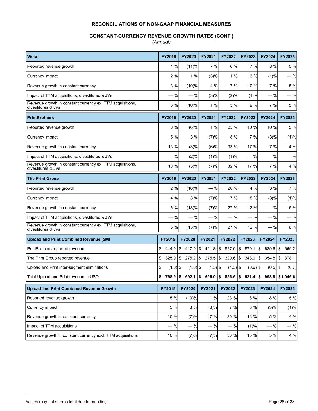 RECONCILIATIONS OF NON-GAAP FINANCIAL MEASURES CONSTANT-CURRENCY REVENUE GROWTH RATES (CONT.) (Annual) Vista FY2019 FY2020 FY2021 FY2022 FY2023 FY2024 FY2025 Reported revenue growth 1 % (11) % 7 % 6 % 7 % 8 % 5 % Currency impact 2 % 1 % (3) % 1 % 3 % (1) % — % Revenue growth in constant currency 3 % (10) % 4 % 7 % 10 % 7 % 5 % Impact of TTM acquisitions, divestitures & JVs — % — % (3) % (2) % (1) % — % — % Revenue growth in constant currency ex. TTM acquisitions, divestitures & JVs 3 % (10) % 1 % 5 % 9 % 7 % 5 % PrintBrothers FY2019 FY2020 FY2021 FY2022 FY2023 FY2024 FY2025 Reported revenue growth 8 % (6) % 1 % 25 % 10 % 10 % 5 % Currency impact 5 % 3 % (7) % 8 % 7 % (3) % (1) % Revenue growth in constant currency 13 % (3) % (6) % 33 % 17 % 7 % 4 % Impact of TTM acquisitions, divestitures & JVs — % (2) % (1) % (1) % — % — % — % Revenue growth in constant currency ex. TTM acquisitions, divestitures & JVs 13 % (5) % (7) % 32 % 17 % 7 % 4 % The Print Group FY2019 FY2020 FY2021 FY2022 FY2023 FY2024 FY2025 Reported revenue growth 2 % (16) % — % 20 % 4 % 3 % 7 % Currency impact 4 % 3 % (7) % 7 % 8 % (3) % (1) % Revenue growth in constant currency 6 % (13) % (7) % 27 % 12 % — % 6 % Impact of TTM acquisitions, divestitures & JVs — % — % — % — % — % — % — % Revenue growth in constant currency ex. TTM acquisitions, divestitures & JVs 6 % (13) % (7) % 27 % 12 % — % 6 % Upload and Print Combined Revenue ($M) FY2019 FY2020 FY2021 FY2022 FY2023 FY2024 FY2025 PrintBrothers reported revenue $ 444.0 $ 417.9 $ 421.8 $ 527.0 $ 579.1 $ 639.6 $ 669.2 The Print Group reported revenue $ 325.9 $ 275.2 $ 275.5 $ 329.6 $ 343.0 $ 354.8 $ 378.1 Upload and Print inter-segment eliminations $ (1.0) $ (1.0) $ (1.3) $ (1.3) $ (0.6) $ (0.5) $ (0.7) Total Upload and Print revenue in USD $ 768.9 $ 692.1 $ 696.0 $ 855.6 $ 921.4 $ 993.8 $ 1,046.6 Upload and Print Combined Revenue Growth FY2019 FY2020 FY2021 FY2022 FY2023 FY2024 FY2025 Reported revenue growth 5 % (10) % 1 % 23 % 8 % 8 % 5 % Currency impact 5 % 3 % (8) % 7 % 8 % (3) % (1) % Revenue growth in constant currency 10 % (7) % (7) % 30 % 16 % 5 % 4 % Impact of TTM acquisitions — % — % — % — % (1) % — % — % Revenue growth in constant currency excl. TTM acquisitions 10 % (7) % (7) % 30 % 15 % 5 % 4 % Values may not sum to total due to rounding. Page 28 of 38