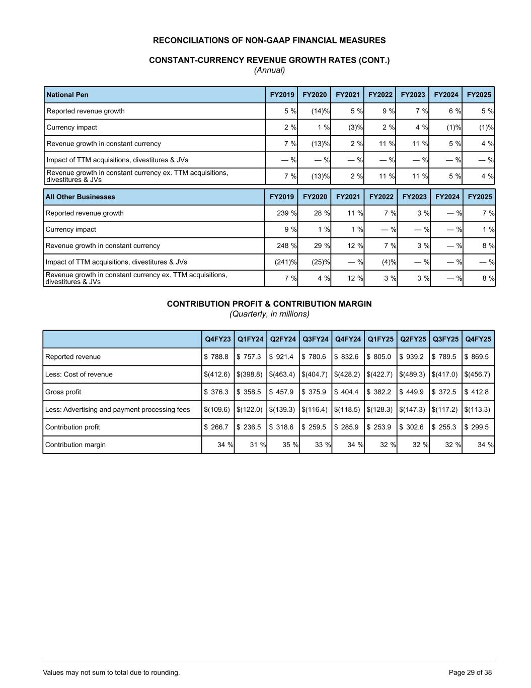 RECONCILIATIONS OF NON-GAAP FINANCIAL MEASURES CONSTANT-CURRENCY REVENUE GROWTH RATES (CONT.) (Annual) National Pen FY2019 FY2020 FY2021 FY2022 FY2023 FY2024 FY2025 Reported revenue growth 5 % (14) % 5 % 9 % 7 % 6 % 5 % Currency impact 2 % 1 % (3) % 2 % 4 % (1) % (1) % Revenue growth in constant currency 7 % (13) % 2 % 11 % 11 % 5 % 4 % Impact of TTM acquisitions, divestitures & JVs — % — % — % — % — % — % — % Revenue growth in constant currency ex. TTM acquisitions, divestitures & JVs 7 % (13) % 2 % 11 % 11 % 5 % 4 % All Other Businesses FY2019 FY2020 FY2021 FY2022 FY2023 FY2024 FY2025 Reported revenue growth 239 % 28 % 11 % 7 % 3 % — % 7 % Currency impact 9 % 1 % 1 % — % — % — % 1 % Revenue growth in constant currency 248 % 29 % 12 % 7 % 3 % — % 8 % Impact of TTM acquisitions, divestitures & JVs (241) % (25) % — % (4) % — % — % — % Revenue growth in constant currency ex. TTM acquisitions, divestitures & JVs 7 % 4 % 12 % 3 % 3 % — % 8 % CONTRIBUTION PROFIT & CONTRIBUTION MARGIN (Quarterly, in millions) Q4FY23 Q1FY24 Q2FY24 Q3FY24 Q4FY24 Q1FY25 Q2FY25 Q3FY25 Q4FY25 Reported revenue $ 788.8 $ 757.3 $ 921.4 $ 780.6 $ 832.6 $ 805.0 $ 939.2 $ 789.5 $ 869.5 Less: Cost of revenue $ (412.6) $ (398.8) $ (463.4) $ (404.7) $ (428.2) $ (422.7) $ (489.3) $ (417.0) $ (456.7) Gross profit $ 376.3 $ 358.5 $ 457.9 $ 375.9 $ 404.4 $ 382.2 $ 449.9 $ 372.5 $ 412.8 Less: Advertising and payment processing fees $ (109.6) $ (122.0) $ (139.3) $ (116.4) $ (118.5) $ (128.3) $ (147.3) $ (117.2) $ (113.3) Contribution profit $ 266.7 $ 236.5 $ 318.6 $ 259.5 $ 285.9 $ 253.9 $ 302.6 $ 255.3 $ 299.5 Contribution margin 34 % 31 % 35 % 33 % 34 % 32 % 32 % 32 % 34 % Values may not sum to total due to rounding. Page 29 of 38