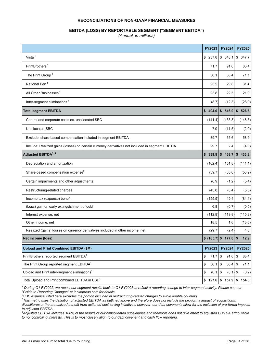 RECONCILIATIONS OF NON-GAAP FINANCIAL MEASURES EBITDA (LOSS) BY REPORTABLE SEGMENT ("SEGMENT EBITDA") (Annual, in millions) FY2023 FY2024 FY2025 Vista 1 $ 237.8 $ 348.1 $ 347.7 PrintBrothers 1 71.7 91.6 83.4 The Print Group 1 56.1 66.4 71.1 National Pen 1 23.2 29.8 31.4 All Other Businesses 1 23.8 22.5 21.9 Inter-segment eliminations 1 (8.7) (12.3) (28.9) Total segment EBITDA $ 404.0 $ 546.0 $ 526.6 Central and corporate costs ex. unallocated SBC (141.4) (133.8) (146.3) Unallocated SBC 7.9 (11.5) (2.0) Exclude: share-based compensation included in segment EBITDA 39.7 65.6 58.9 Include: Realized gains (losses) on certain currency derivatives not included in segment EBITDA 29.7 2.4 (4.0) Adjusted EBITDA3,,4 $ 339.8 $ 468.7 $ 433.2 Depreciation and amortization (162.4) (151.8) (141.1) Share-based compensation expense2 (39.7) (65.6) (58.9) Certain impairments and other adjustments (6.9) (1.2) (5.4) Restructuring-related charges (43.8) (0.4) (5.5) Income tax (expense) benefit (155.5) 49.4 (84.1) (Loss) gain on early extinguishment of debt 6.8 (0.7) (0.5) Interest expense, net (112.8) (119.8) (115.2) Other income, net 18.5 1.6 (13.6) Realized (gains) losses on currency derivatives included in other income, net (29.7) (2.4) 4.0 Net income (loss) $ (185.7) $ 177.8 $ 12.9 Upload and Print Combined EBITDA ($M) FY2023 FY2024 FY2025 PrintBrothers reported segment EBITDA1 $ 71.7 $ 91.6 $ 83.4 The Print Group reported segment EBITDA1 $ 56.1 $ 66.4 $ 71.1 Upload and Print inter-segment eliminations1 $ (0.1) $ (0.1) $ (0.2) Total Upload and Print combined EBITDA in USD1 $ 127.6 $ 157.9 $ 154.3 1 During Q1 FY2025, we recast our segment results back to Q1 FY2023 to reflect a reporting change to inter-segment activity. Please see our "Guide to Reporting Changes" at ir.cimpress.com for details. 2SBC expense listed here excludes the portion included in restructuring-related charges to avoid double counting. 3This metric uses the definition of adjusted EBITDA as outlined above and therefore does not include the pro-forma impact of acquisitions, divestitures or the annualized benefit from actioned cost saving initiatives; however, our debt covenants allow for the inclusion of pro-forma impacts to adjusted EBITDA. 4Adjusted EBITDA includes 100% of the results of our consolidated subsidiaries and therefore does not give effect to adjusted EBITDA attributable to noncontrolling interests. This is to most closely align to our debt covenant and cash flow reporting. Values may not sum to total due to rounding. Page 31 of 38
