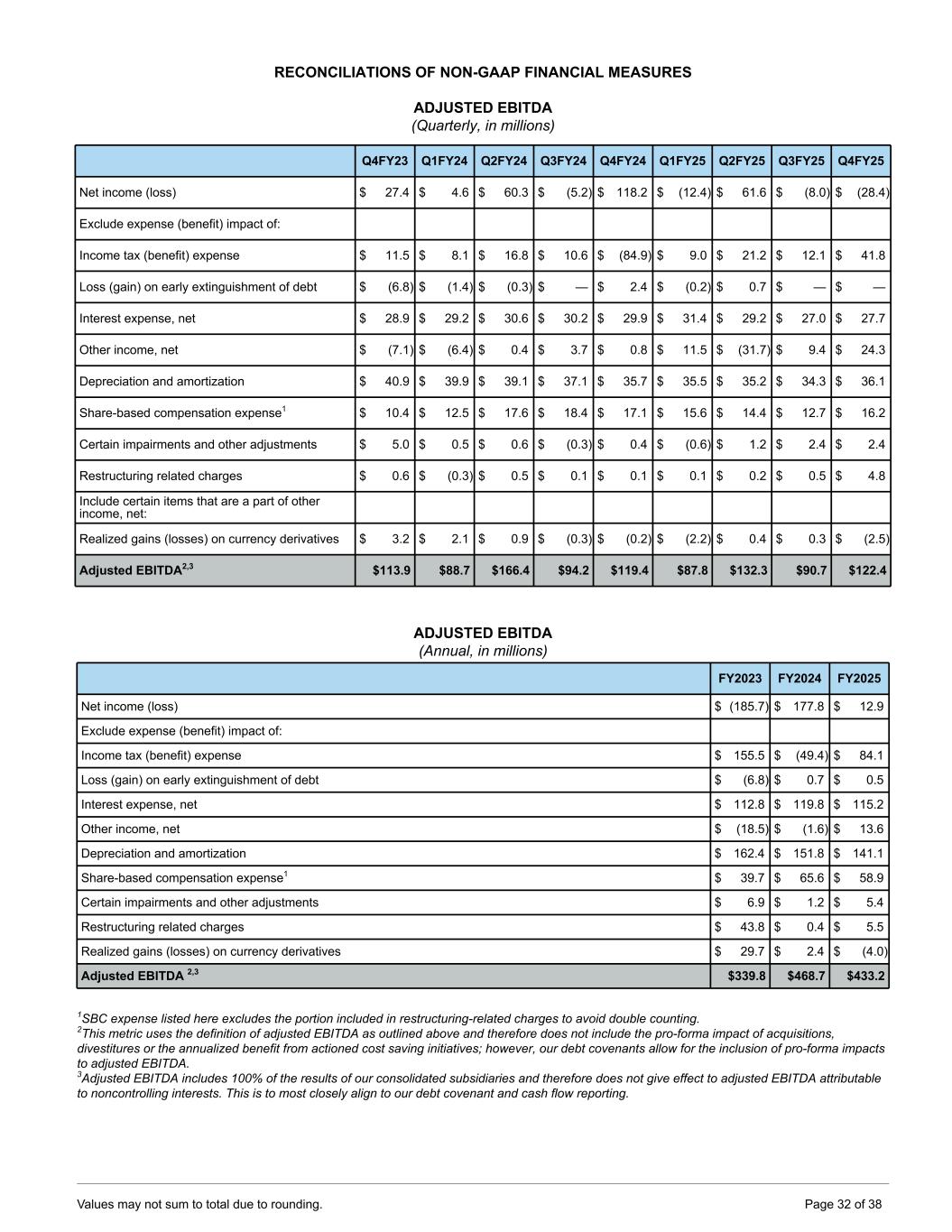 RECONCILIATIONS OF NON-GAAP FINANCIAL MEASURES ADJUSTED EBITDA (Quarterly, in millions) Q4FY23 Q1FY24 Q2FY24 Q3FY24 Q4FY24 Q1FY25 Q2FY25 Q3FY25 Q4FY25 Net income (loss) $ 27.4 $ 4.6 $ 60.3 $ (5.2) $ 118.2 $ (12.4) $ 61.6 $ (8.0) $ (28.4) Exclude expense (benefit) impact of: Income tax (benefit) expense $ 11.5 $ 8.1 $ 16.8 $ 10.6 $ (84.9) $ 9.0 $ 21.2 $ 12.1 $ 41.8 Loss (gain) on early extinguishment of debt $ (6.8) $ (1.4) $ (0.3) $ — $ 2.4 $ (0.2) $ 0.7 $ — $ — Interest expense, net $ 28.9 $ 29.2 $ 30.6 $ 30.2 $ 29.9 $ 31.4 $ 29.2 $ 27.0 $ 27.7 Other income, net $ (7.1) $ (6.4) $ 0.4 $ 3.7 $ 0.8 $ 11.5 $ (31.7) $ 9.4 $ 24.3 Depreciation and amortization $ 40.9 $ 39.9 $ 39.1 $ 37.1 $ 35.7 $ 35.5 $ 35.2 $ 34.3 $ 36.1 Share-based compensation expense1 $ 10.4 $ 12.5 $ 17.6 $ 18.4 $ 17.1 $ 15.6 $ 14.4 $ 12.7 $ 16.2 Certain impairments and other adjustments $ 5.0 $ 0.5 $ 0.6 $ (0.3) $ 0.4 $ (0.6) $ 1.2 $ 2.4 $ 2.4 Restructuring related charges $ 0.6 $ (0.3) $ 0.5 $ 0.1 $ 0.1 $ 0.1 $ 0.2 $ 0.5 $ 4.8 Include certain items that are a part of other income, net: Realized gains (losses) on currency derivatives $ 3.2 $ 2.1 $ 0.9 $ (0.3) $ (0.2) $ (2.2) $ 0.4 $ 0.3 $ (2.5) Adjusted EBITDA2,3 $113.9 $88.7 $166.4 $94.2 $119.4 $87.8 $132.3 $90.7 $122.4 ADJUSTED EBITDA (Annual, in millions) FY2023 FY2024 FY2025 Net income (loss) $ (185.7) $ 177.8 $ 12.9 Exclude expense (benefit) impact of: Income tax (benefit) expense $ 155.5 $ (49.4) $ 84.1 Loss (gain) on early extinguishment of debt $ (6.8) $ 0.7 $ 0.5 Interest expense, net $ 112.8 $ 119.8 $ 115.2 Other income, net $ (18.5) $ (1.6) $ 13.6 Depreciation and amortization $ 162.4 $ 151.8 $ 141.1 Share-based compensation expense1 $ 39.7 $ 65.6 $ 58.9 Certain impairments and other adjustments $ 6.9 $ 1.2 $ 5.4 Restructuring related charges $ 43.8 $ 0.4 $ 5.5 Realized gains (losses) on currency derivatives $ 29.7 $ 2.4 $ (4.0) Adjusted EBITDA 2,3 $339.8 $468.7 $433.2 1SBC expense listed here excludes the portion included in restructuring-related charges to avoid double counting. 2This metric uses the definition of adjusted EBITDA as outlined above and therefore does not include the pro-forma impact of acquisitions, divestitures or the annualized benefit from actioned cost saving initiatives; however, our debt covenants allow for the inclusion of pro-forma impacts to adjusted EBITDA. 3Adjusted EBITDA includes 100% of the results of our consolidated subsidiaries and therefore does not give effect to adjusted EBITDA attributable to noncontrolling interests. This is to most closely align to our debt covenant and cash flow reporting. Values may not sum to total due to rounding. Page 32 of 38
