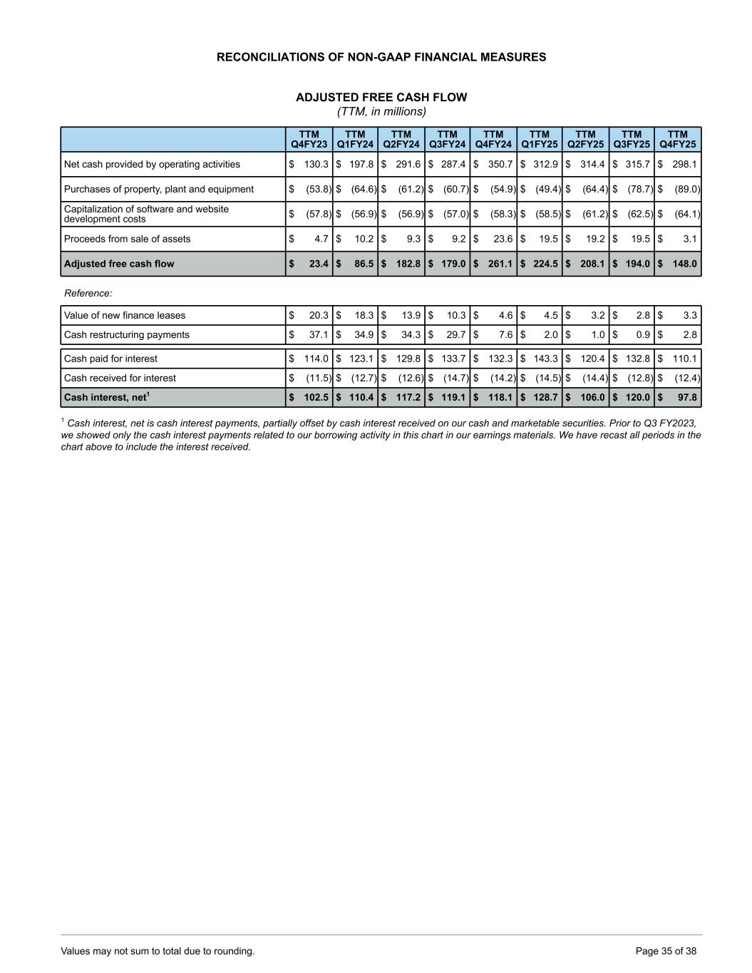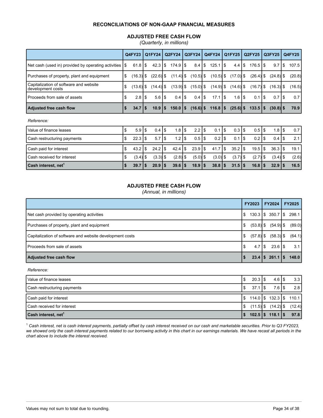 RECONCILIATIONS OF NON-GAAP FINANCIAL MEASURES ADJUSTED FREE CASH FLOW (Quarterly, in millions) Q4FY23 Q1FY24 Q2FY24 Q3FY24 Q4FY24 Q1FY25 Q2FY25 Q3FY25 Q4FY25 Net cash (used in) provided by operating activities $ 61.8 $ 42.3 $ 174.9 $ 8.4 $ 125.1 $ 4.4 $ 176.5 $ 9.7 $ 107.5 Purchases of property, plant and equipment $ (16.3) $ (22.6) $ (11.4) $ (10.5) $ (10.5) $ (17.0) $ (26.4) $ (24.8) $ (20.8) Capitalization of software and website development costs $ (13.6) $ (14.4) $ (13.9) $ (15.0) $ (14.9) $ (14.6) $ (16.7) $ (16.3) $ (16.5) Proceeds from sale of assets $ 2.8 $ 5.6 $ 0.4 $ 0.4 $ 17.1 $ 1.6 $ 0.1 $ 0.7 $ 0.7 Adjusted free cash flow $ 34.7 $ 10.9 $ 150.0 $ (16.6) $ 116.8 $ (25.6) $ 133.5 $ (30.8) $ 70.9 Reference: Value of finance leases $ 5.9 $ 0.4 $ 1.8 $ 2.2 $ 0.1 $ 0.3 $ 0.5 $ 1.8 $ 0.7 Cash restructuring payments $ 22.3 $ 5.7 $ 1.2 $ 0.5 $ 0.2 $ 0.1 $ 0.2 $ 0.4 $ 2.1 Cash paid for interest $ 43.2 $ 24.2 $ 42.4 $ 23.9 $ 41.7 $ 35.2 $ 19.5 $ 36.3 $ 19.1 Cash received for interest $ (3.4) $ (3.3) $ (2.8) $ (5.0) $ (3.0) $ (3.7) $ (2.7) $ (3.4) $ (2.6) Cash interest, net1 $ 39.7 $ 20.9 $ 39.6 $ 18.9 $ 38.8 $ 31.5 $ 16.8 $ 32.9 $ 16.5 ADJUSTED FREE CASH FLOW (Annual, in millions) FY2023 FY2024 FY2025 Net cash provided by operating activities $ 130.3 $ 350.7 $ 298.1 Purchases of property, plant and equipment $ (53.8) $ (54.9) $ (89.0) Capitalization of software and website development costs $ (57.8) $ (58.3) $ (64.1) Proceeds from sale of assets $ 4.7 $ 23.6 $ 3.1 Adjusted free cash flow $ 23.4 $ 261.1 $ 148.0 Reference: Value of finance leases $ 20.3 $ 4.6 $ 3.3 Cash restructuring payments $ 37.1 $ 7.6 $ 2.8 Cash paid for interest $ 114.0 $ 132.3 $ 110.1 Cash received for interest $ (11.5) $ (14.2) $ (12.4) Cash interest, net1 $ 102.5 $ 118.1 $ 97.8 1 Cash interest, net is cash interest payments, partially offset by cash interest received on our cash and marketable securities. Prior to Q3 FY2023, we showed only the cash interest payments related to our borrowing activity in this chart in our earnings materials. We have recast all periods in the chart above to include the interest received. Values may not sum to total due to rounding. Page 34 of 38