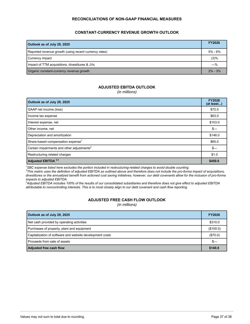 RECONCILIATIONS OF NON-GAAP FINANCIAL MEASURES CONSTANT-CURRENCY REVENUE GROWTH OUTLOOK Outlook as of July 29, 2025 FY2026 Reported revenue growth (using recent currency rates) 5% - 6% Currency impact (3)% Impact of TTM acquisitions, divestitures & JVs —% Organic constant-currency revenue growth 2% - 3% ADJUSTED EBITDA OUTLOOK (in millions) Outlook as of July 29, 2025 FY2026 (at least...) GAAP net income (loss) $72.0 Income tax expense $63.0 Interest expense, net $103.0 Other income, net $— Depreciation and amortization $146.0 Share-based compensation expense1 $65.0 Certain impairments and other adjustments2 $— Restructuring related charges $1.0 Adjusted EBITDA 2,3 $450.0 1SBC expense listed here excludes the portion included in restructuring-related charges to avoid double counting. 2This metric uses the definition of adjusted EBITDA as outlined above and therefore does not include the pro-forma impact of acquisitions, divestitures or the annualized benefit from actioned cost saving initiatives; however, our debt covenants allow for the inclusion of pro-forma impacts to adjusted EBITDA. 3Adjusted EBITDA includes 100% of the results of our consolidated subsidiaries and therefore does not give effect to adjusted EBITDA attributable to noncontrolling interests. This is to most closely align to our debt covenant and cash flow reporting. ADJUSTED FREE CASH FLOW OUTLOOK (in millions) Outlook as of July 29, 2025 FY2026 Net cash provided by operating activities $310.0 Purchases of property, plant and equipment ($100.0) Capitalization of software and website development costs ($70.0) Proceeds from sale of assets $— Adjusted free cash flow $140.0 Values may not sum to total due to rounding. Page 37 of 38