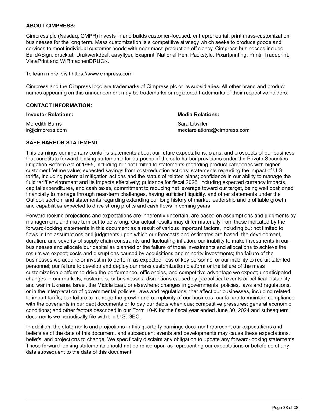 ABOUT CIMPRESS: Cimpress plc (Nasdaq: CMPR) invests in and builds customer-focused, entrepreneurial, print mass-customization businesses for the long term. Mass customization is a competitive strategy which seeks to produce goods and services to meet individual customer needs with near mass production efficiency. Cimpress businesses include BuildASign, druck.at, Drukwerkdeal, easyflyer, Exaprint, National Pen, Packstyle, Pixartprinting, Printi, Tradeprint, VistaPrint and WIRmachenDRUCK. To learn more, visit https://www.cimpress.com. Cimpress and the Cimpress logo are trademarks of Cimpress plc or its subsidiaries. All other brand and product names appearing on this announcement may be trademarks or registered trademarks of their respective holders. CONTACT INFORMATION: Investor Relations: Media Relations: Meredith Burns Sara Litwiller ir@cimpress.com mediarelations@cimpress.com SAFE HARBOR STATEMENT: This earnings commentary contains statements about our future expectations, plans, and prospects of our business that constitute forward-looking statements for purposes of the safe harbor provisions under the Private Securities Litigation Reform Act of 1995, including but not limited to statements regarding product categories with higher customer lifetime value; expected savings from cost-reduction actions; statements regarding the impact of U.S. tariffs, including potential mitigation actions and the status of related plans; confidence in our ability to manage the fluid tariff environment and its impacts effectively; guidance for fiscal 2026, including expected currency impacts, capital expenditures, and cash taxes, commitment to reducing net leverage toward our target, being well positioned financially to manage through near-term challenges, having sufficient liquidity, and other statements under the Outlook section; and statements regarding extending our long history of market leadership and profitable growth and capabilities expected to drive strong profits and cash flows in coming years. Forward-looking projections and expectations are inherently uncertain, are based on assumptions and judgments by management, and may turn out to be wrong. Our actual results may differ materially from those indicated by the forward-looking statements in this document as a result of various important factors, including but not limited to flaws in the assumptions and judgments upon which our forecasts and estimates are based; the development, duration, and severity of supply chain constraints and fluctuating inflation; our inability to make investments in our businesses and allocate our capital as planned or the failure of those investments and allocations to achieve the results we expect; costs and disruptions caused by acquisitions and minority investments; the failure of the businesses we acquire or invest in to perform as expected; loss of key personnel or our inability to recruit talented personnel; our failure to develop and deploy our mass customization platform or the failure of the mass customization platform to drive the performance, efficiencies, and competitive advantage we expect; unanticipated changes in our markets, customers, or businesses; disruptions caused by geopolitical events or political instability and war in Ukraine, Israel, the Middle East, or elsewhere; changes in governmental policies, laws and regulations, or in the interpretation of governmental policies, laws and regulations, that affect our businesses, including related to import tariffs; our failure to manage the growth and complexity of our business; our failure to maintain compliance with the covenants in our debt documents or to pay our debts when due; competitive pressures; general economic conditions; and other factors described in our Form 10-K for the fiscal year ended June 30, 2024 and subsequent documents we periodically file with the U.S. SEC. In addition, the statements and projections in this quarterly earnings document represent our expectations and beliefs as of the date of this document, and subsequent events and developments may cause these expectations, beliefs, and projections to change. We specifically disclaim any obligation to update any forward-looking statements. These forward-looking statements should not be relied upon as representing our expectations or beliefs as of any date subsequent to the date of this document. Page 38 of 38