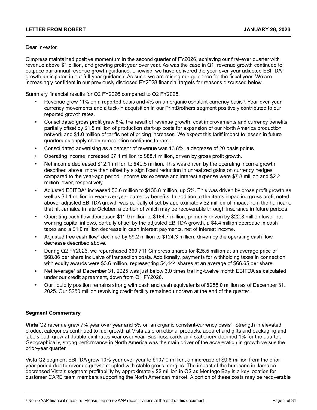 LETTER FROM ROBERT JANUARY 28, 2026 Dear Investor, Cimpress maintained positive momentum in the second quarter of FY2026, achieving our first-ever quarter with revenue above $1 billion, and growing profit year over year. As was the case in Q1, revenue growth continued to outpace our annual revenue growth guidance. Likewise, we have delivered the year-over-year adjusted EBITDAa growth anticipated in our full-year guidance. As such, we are raising our guidance for the fiscal year. We are increasingly confident in our previously disclosed FY2028 financial targets for reasons discussed below. Summary financial results for Q2 FY2026 compared to Q2 FY2025: • Revenue grew 11% on a reported basis and 4% on an organic constant-currency basisa. Year-over-year currency movements and a tuck-in acquisition in our PrintBrothers segment positively contributed to our reported growth rates. • Consolidated gross profit grew 8%, the result of revenue growth, cost improvements and currency benefits, partially offset by $1.5 million of production start-up costs for expansion of our North America production network and $1.0 million of tariffs net of pricing increases. We expect this tariff impact to lessen in future quarters as supply chain remediation continues to ramp. • Consolidated advertising as a percent of revenue was 13.8%, a decrease of 20 basis points. • Operating income increased $7.1 million to $88.1 million, driven by gross profit growth. • Net income decreased $12.1 million to $49.5 million. This was driven by the operating income growth described above, more than offset by a significant reduction in unrealized gains on currency hedges compared to the year-ago period. Income tax expense and interest expense were $7.8 million and $2.2 million lower, respectively. • Adjusted EBITDAa increased $6.6 million to $138.8 million, up 5%. This was driven by gross profit growth as well as $4.1 million in year-over-year currency benefits. In addition to the items impacting gross profit noted above, adjusted EBITDA growth was partially offset by approximately $2 million of impact from the hurricane that hit Jamaica in late October, a portion of which may be recoverable through insurance in future periods. • Operating cash flow decreased $11.9 million to $164.7 million, primarily driven by $22.8 million lower net working capital inflows, partially offset by the adjusted EBITDA growth, a $4.4 million decrease in cash taxes and a $1.0 million decrease in cash interest payments, net of interest income. • Adjusted free cash flowa declined by $9.2 million to $124.3 million, driven by the operating cash flow decrease described above. • During Q2 FY2026, we repurchased 369,711 Cimpress shares for $25.5 million at an average price of $68.86 per share inclusive of transaction costs. Additionally, payments for withholding taxes in connection with equity awards were $3.6 million, representing 54,444 shares at an average of $66.65 per share. • Net leveragea at December 31, 2025 was just below 3.0 times trailing-twelve month EBITDA as calculated under our credit agreement, down from Q1 FY2026. • Our liquidity position remains strong with cash and cash equivalents of $258.0 million as of December 31, 2025. Our $250 million revolving credit facility remained undrawn at the end of the quarter. Segment Commentary Vista Q2 revenue grew 7% year over year and 5% on an organic constant-currency basisa. Strength in elevated product categories continued to fuel growth at Vista as promotional products, apparel and gifts and packaging and labels both grew at double-digit rates year over year. Business cards and stationery declined 1% for the quarter. Geographically, strong performance in North America was the main driver of the acceleration in growth versus the prior-year quarter. Vista Q2 segment EBITDA grew 10% year over year to $107.0 million, an increase of $9.8 million from the prior- year period due to revenue growth coupled with stable gross margins. The impact of the hurricane in Jamaica decreased Vista's segment profitability by approximately $2 million in Q2 as Montego Bay is a key location for customer CARE team members supporting the North American market. A portion of these costs may be recoverable a Non-GAAP financial measure. Please see non-GAAP reconciliations at the end of this document. Page 2 of 34