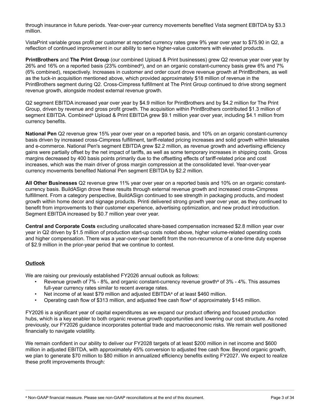 through insurance in future periods. Year-over-year currency movements benefited Vista segment EBITDA by $3.3 million. VistaPrint variable gross profit per customer at reported currency rates grew 9% year over year to $75.90 in Q2, a reflection of continued improvement in our ability to serve higher-value customers with elevated products. PrintBrothers and The Print Group (our combined Upload & Print businesses) grew Q2 revenue year over year by 26% and 16% on a reported basis (23% combineda), and on an organic constant-currency basis grew 6% and 7% (6% combined), respectively. Increases in customer and order count drove revenue growth at PrintBrothers, as well as the tuck-in acquisition mentioned above, which provided approximately $18 million of revenue in the PrintBrothers segment during Q2. Cross-Cimpress fulfillment at The Print Group continued to drive strong segment revenue growth, alongside modest external revenue growth. Q2 segment EBITDA increased year over year by $4.9 million for PrintBrothers and by $4.2 million for The Print Group, driven by revenue and gross profit growth. The acquisition within PrintBrothers contributed $1.3 million of segment EBITDA. Combineda Upload & Print EBITDA grew $9.1 million year over year, including $4.1 million from currency benefits. National Pen Q2 revenue grew 15% year over year on a reported basis, and 10% on an organic constant-currency basis driven by increased cross-Cimpress fulfillment, tariff-related pricing increases and solid growth within telesales and e-commerce. National Pen's segment EBITDA grew $2.2 million, as revenue growth and advertising efficiency gains were partially offset by the net impact of tariffs, as well as some temporary increases in shipping costs. Gross margins decreased by 400 basis points primarily due to the offsetting effects of tariff-related price and cost increases, which was the main driver of gross margin compression at the consolidated level. Year-over-year currency movements benefited National Pen segment EBITDA by $2.2 million. All Other Businesses Q2 revenue grew 11% year over year on a reported basis and 10% on an organic constant- currency basis. BuildASign drove these results through external revenue growth and increased cross-Cimpress fulfillment. From a category perspective, BuildASign continued to see strength in packaging products, and modest growth within home decor and signage products. Printi delivered strong growth year over year, as they continued to benefit from improvements to their customer experience, advertising optimization, and new product introduction. Segment EBITDA increased by $0.7 million year over year. Central and Corporate Costs excluding unallocated share-based compensation increased $2.8 million year over year in Q2 driven by $1.5 million of production start-up costs noted above, higher volume-related operating costs and higher compensation. There was a year-over-year benefit from the non-recurrence of a one-time duty expense of $2.9 million in the prior-year period that we continue to contest. Outlook We are raising our previously established FY2026 annual outlook as follows: • Revenue growth of 7% - 8%, and organic constant-currency revenue growtha of 3% - 4%. This assumes full-year currency rates similar to recent average rates. • Net income of at least $79 million and adjusted EBITDAa of at least $460 million. • Operating cash flow of $313 million, and adjusted free cash flowa of approximately $145 million. FY2026 is a significant year of capital expenditures as we expand our product offering and focused production hubs, which is a key enabler to both organic revenue growth opportunities and lowering our cost structure. As noted previously, our FY2026 guidance incorporates potential trade and macroeconomic risks. We remain well positioned financially to navigate volatility. We remain confident in our ability to deliver our FY2028 targets of at least $200 million in net income and $600 million in adjusted EBITDA, with approximately 45% conversion to adjusted free cash flow. Beyond organic growth, we plan to generate $70 million to $80 million in annualized efficiency benefits exiting FY2027. We expect to realize these profit improvements through: a Non-GAAP financial measure. Please see non-GAAP reconciliations at the end of this document. Page 3 of 34
