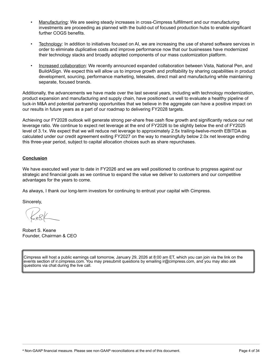 • Manufacturing: We are seeing steady increases in cross-Cimpress fulfillment and our manufacturing investments are proceeding as planned with the build-out of focused production hubs to enable significant further COGS benefits. • Technology: In addition to initiatives focused on AI, we are increasing the use of shared software services in order to eliminate duplicative costs and improve performance now that our businesses have modernized their technology stacks and broadly adopted components of our mass customization platform. • Increased collaboration: We recently announced expanded collaboration between Vista, National Pen, and BuildASign. We expect this will allow us to improve growth and profitability by sharing capabilities in product development, sourcing, performance marketing, telesales, direct mail and manufacturing while maintaining separate, focused brands. Additionally, the advancements we have made over the last several years, including with technology modernization, product expansion and manufacturing and supply chain, have positioned us well to evaluate a healthy pipeline of tuck-in M&A and potential partnership opportunities that we believe in the aggregate can have a positive impact on our results in future years as a part of our roadmap to delivering FY2028 targets. Achieving our FY2028 outlook will generate strong per-share free cash flow growth and significantly reduce our net leverage ratio. We continue to expect net leverage at the end of FY2026 to be slightly below the end of FY2025 level of 3.1x. We expect that we will reduce net leverage to approximately 2.5x trailing-twelve-month EBITDA as calculated under our credit agreement exiting FY2027 on the way to meaningfully below 2.0x net leverage ending this three-year period, subject to capital allocation choices such as share repurchases. Conclusion We have executed well year to date in FY2026 and we are well positioned to continue to progress against our strategic and financial goals as we continue to expand the value we deliver to customers and our competitive advantages for the years to come. As always, I thank our long-term investors for continuing to entrust your capital with Cimpress. Sincerely, Robert S. Keane Founder, Chairman & CEO Cimpress will host a public earnings call tomorrow, January 29, 2026 at 8:00 am ET, which you can join via the link on the events section of ir.cimpress.com. You may presubmit questions by emailing ir@cimpress.com, and you may also ask questions via chat during the live call. a Non-GAAP financial measure. Please see non-GAAP reconciliations at the end of this document. Page 4 of 34