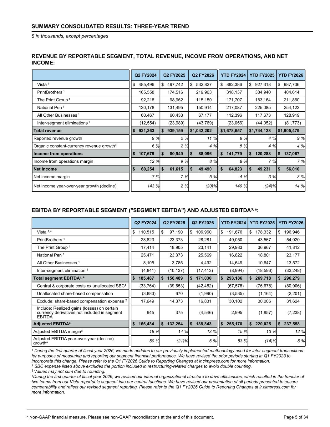 SUMMARY CONSOLIDATED RESULTS: THREE-YEAR TREND $ in thousands, except percentages REVENUE BY REPORTABLE SEGMENT, TOTAL REVENUE, INCOME FROM OPERATIONS, AND NET INCOME: Q2 FY2024 Q2 FY2025 Q2 FY2026 YTD FY2024 YTD FY2025 YTD FY2026 Vista 1 $ 485,496 $ 497,742 $ 532,827 $ 882,386 $ 927,318 $ 987,736 PrintBrothers 1 165,558 174,516 219,903 318,137 334,940 404,614 The Print Group 1 92,218 98,962 115,150 171,707 183,164 211,860 National Pen 1 130,178 131,495 150,914 217,087 225,085 254,123 All Other Businesses 1 60,467 60,433 67,177 112,396 117,673 128,919 Inter-segment eliminations 1 (12,554) (23,989) (43,769) (23,056) (44,052) (81,773) Total revenue $ 921,363 $ 939,159 $ 1,042,202 $ 1,678,657 $ 1,744,128 $ 1,905,479 Reported revenue growth 9 % 2 % 11 % 8 % 4 % 9 % Organic constant-currency revenue growtha 6 % 2 % 4 % 5 % 4 % 4 % Income from operations $ 107,679 $ 80,949 $ 88,096 $ 141,779 $ 120,288 $ 137,067 Income from operations margin 12 % 9 % 8 % 8 % 7 % 7 % Net income $ 60,254 $ 61,615 $ 49,490 $ 64,823 $ 49,231 $ 56,010 Net income margin 7 % 7 % 5 % 4 % 3 % 3 % Net income year-over-year growth (decline) 143 % 2 % (20) % 140 % (24) % 14 % EBITDA BY REPORTABLE SEGMENT ("SEGMENT EBITDA") AND ADJUSTED EBITDA3, a: Q2 FY2024 Q2 FY2025 Q2 FY2026 YTD FY2024 YTD FY2025 YTD FY2026 Vista 1,4 $ 110,515 $ 97,190 $ 106,960 $ 191,676 $ 178,332 $ 196,946 PrintBrothers 1 28,823 23,373 28,281 49,050 43,567 54,020 The Print Group 1 17,414 18,905 23,141 29,983 36,967 41,812 National Pen 1 25,471 23,373 25,569 16,822 18,801 23,177 All Other Businesses 1 8,105 3,785 4,492 14,649 10,647 13,572 Inter-segment elimination 1 (4,841) (10,137) (17,413) (8,994) (18,596) (33,248) Total segment EBITDAa, 4 $ 185,487 $ 156,489 $ 171,030 $ 293,186 $ 269,718 $ 296,279 Central & corporate costs ex unallocated SBC4 (33,764) (39,653) (42,482) (67,578) (76,678) (80,906) Unallocated share-based compensation (3,883) 670 (1,990) (3,535) (1,164) (2,201) Exclude: share-based compensation expense 2 17,649 14,373 16,831 30,102 30,006 31,624 Include: Realized gains (losses) on certain currency derivatives not included in segment EBITDA 945 375 (4,546) 2,995 (1,857) (7,238) Adjusted EBITDAa $ 166,434 $ 132,254 $ 138,843 $ 255,170 $ 220,025 $ 237,558 Adjusted EBITDA margina 18 % 14 % 13 % 15 % 13 % 12 % Adjusted EBITDA year-over-year (decline) growtha 50 % (21) % 5 % 63 % (14) % 8 % 1 During the first quarter of fiscal year 2026, we made updates to our previously implemented methodology used for inter-segment transactions for purposes of measuring and reporting our segment financial performance. We have revised the prior periods starting in Q1 FY2023 to incorporate this change. Please refer to the Q1 FY2026 Guide to Reporting Changes at ir.cimpress.com for more information. 2 SBC expense listed above excludes the portion included in restructuring-related charges to avoid double counting. 3 Values may not sum due to rounding. 4During the first quarter of fiscal year 2026, we revised our internal organizational structure to drive efficiencies, which resulted in the transfer of two teams from our Vista reportable segment into our central functions. We have revised our presentation of all periods presented to ensure comparability and reflect our revised segment reporting. Please refer to the Q1 FY2026 Guide to Reporting Changes at ir.cimpress.com for more information. a Non-GAAP financial measure. Please see non-GAAP reconciliations at the end of this document. Page 5 of 34