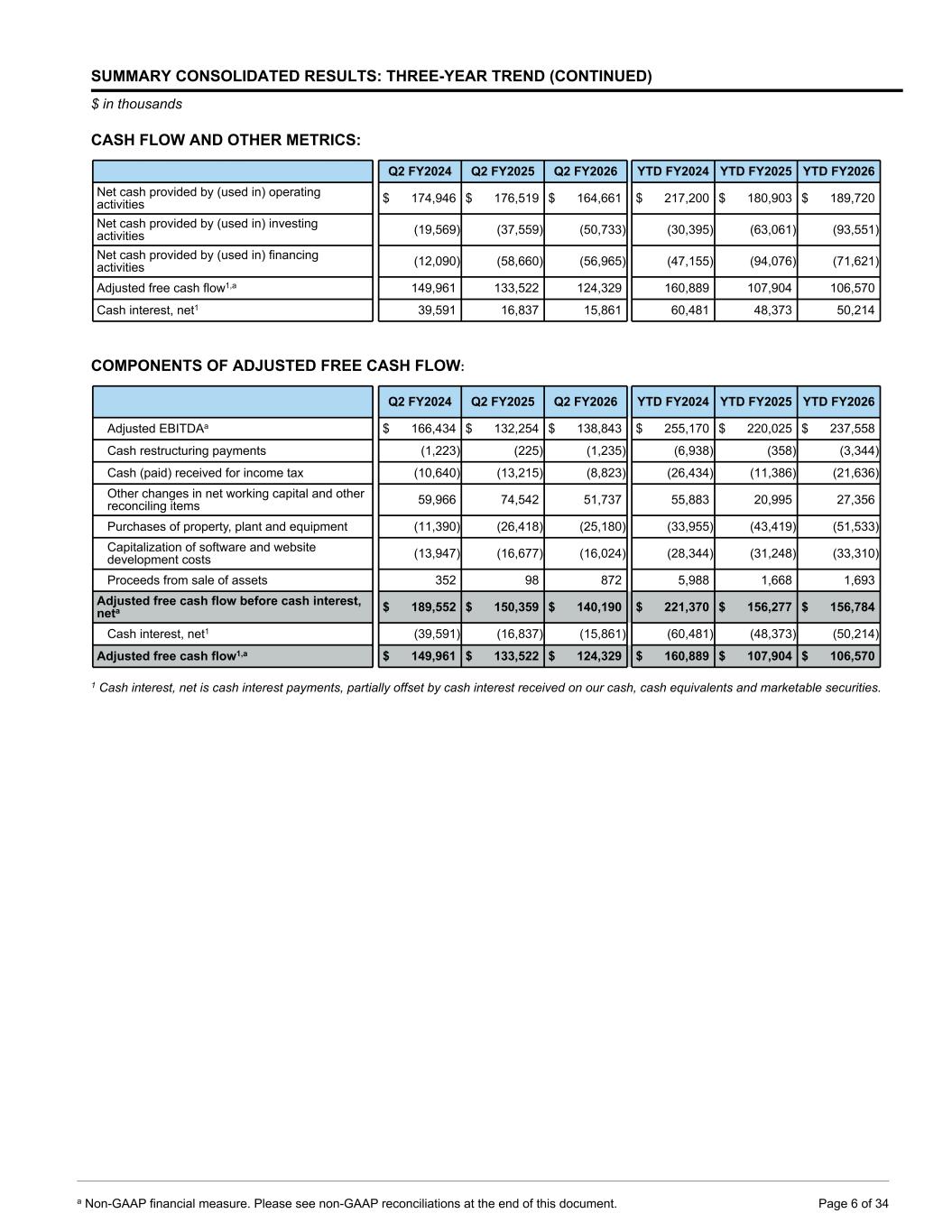 SUMMARY CONSOLIDATED RESULTS: THREE-YEAR TREND (CONTINUED) $ in thousands CASH FLOW AND OTHER METRICS: Q2 FY2024 Q2 FY2025 Q2 FY2026 YTD FY2024 YTD FY2025 YTD FY2026 Net cash provided by (used in) operating activities $ 174,946 $ 176,519 $ 164,661 $ 217,200 $ 180,903 $ 189,720 Net cash provided by (used in) investing activities (19,569) (37,559) (50,733) (30,395) (63,061) (93,551) Net cash provided by (used in) financing activities (12,090) (58,660) (56,965) (47,155) (94,076) (71,621) Adjusted free cash flow1,a 149,961 133,522 124,329 160,889 107,904 106,570 Cash interest, net1 39,591 16,837 15,861 60,481 48,373 50,214 COMPONENTS OF ADJUSTED FREE CASH FLOW: Q2 FY2024 Q2 FY2025 Q2 FY2026 YTD FY2024 YTD FY2025 YTD FY2026 Adjusted EBITDAa $ 166,434 $ 132,254 $ 138,843 $ 255,170 $ 220,025 $ 237,558 Cash restructuring payments (1,223) (225) (1,235) (6,938) (358) (3,344) Cash (paid) received for income tax (10,640) (13,215) (8,823) (26,434) (11,386) (21,636) Other changes in net working capital and other reconciling items 59,966 74,542 51,737 55,883 20,995 27,356 Purchases of property, plant and equipment (11,390) (26,418) (25,180) (33,955) (43,419) (51,533) Capitalization of software and website development costs (13,947) (16,677) (16,024) (28,344) (31,248) (33,310) Proceeds from sale of assets 352 98 872 5,988 1,668 1,693 Adjusted free cash flow before cash interest, neta $ 189,552 $ 150,359 $ 140,190 $ 221,370 $ 156,277 $ 156,784 Cash interest, net1 (39,591) (16,837) (15,861) (60,481) (48,373) (50,214) Adjusted free cash flow1,a $ 149,961 $ 133,522 $ 124,329 $ 160,889 $ 107,904 $ 106,570 1 Cash interest, net is cash interest payments, partially offset by cash interest received on our cash, cash equivalents and marketable securities. a Non-GAAP financial measure. Please see non-GAAP reconciliations at the end of this document. Page 6 of 34