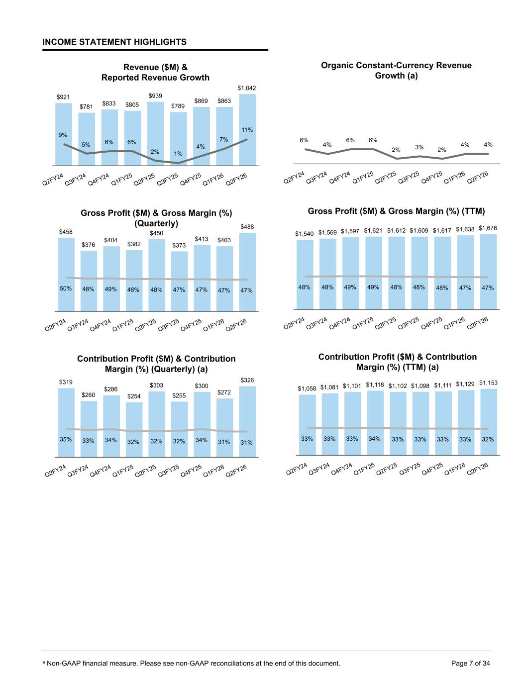 INCOME STATEMENT HIGHLIGHTS Revenue ($M) & Reported Revenue Growth $921 $781 $833 $805 $939 $789 $869 $863 $1,042 9% 5% 6% 6% 2% 1% 4% 7% 11% Q2FY24 Q3FY24 Q4FY24 Q1FY25 Q2FY25 Q3FY25 Q4FY25 Q1FY26 Q2FY26 Gross Profit ($M) & Gross Margin (%) (Quarterly) $458 $376 $404 $382 $450 $373 $413 $403 $488 50% 48% 49% 48% 48% 47% 47% 47% 47% Q2FY24 Q3FY24 Q4FY24 Q1FY25 Q2FY25 Q3FY25 Q4FY25 Q1FY26 Q2FY26 Contribution Profit ($M) & Contribution Margin (%) (Quarterly) (a) $319 $260 $286 $254 $303 $255 $300 $272 $326 35% 33% 34% 32% 32% 32% 34% 31% 31% Q2FY24 Q3FY24 Q4FY24 Q1FY25 Q2FY25 Q3FY25 Q4FY25 Q1FY26 Q2FY26 Organic Constant-Currency Revenue Growth (a) 6% 4% 6% 6% 2% 3% 2% 4% 4% Q2FY24 Q3FY24 Q4FY24 Q1FY25 Q2FY25 Q3FY25 Q4FY25 Q1FY26 Q2FY26 Gross Profit ($M) & Gross Margin (%) (TTM) $1,540 $1,569 $1,597 $1,621 $1,612 $1,609 $1,617 $1,638 $1,676 48% 48% 49% 49% 48% 48% 48% 47% 47% Q2FY24 Q3FY24 Q4FY24 Q1FY25 Q2FY25 Q3FY25 Q4FY25 Q1FY26 Q2FY26 Contribution Profit ($M) & Contribution Margin (%) (TTM) (a) $1,058 $1,081 $1,101 $1,118 $1,102 $1,098 $1,111 $1,129 $1,153 33% 33% 33% 34% 33% 33% 33% 33% 32% Q2FY24 Q3FY24 Q4FY24 Q1FY25 Q2FY25 Q3FY25 Q4FY25 Q1FY26 Q2FY26 a Non-GAAP financial measure. Please see non-GAAP reconciliations at the end of this document. Page 7 of 34