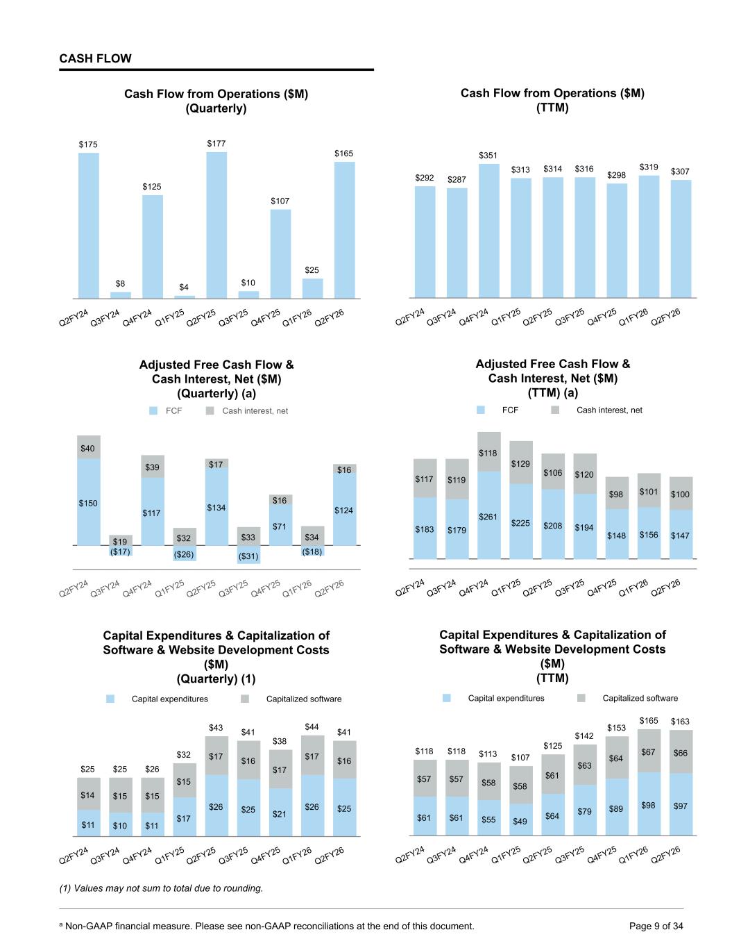 CASH FLOW Cash Flow from Operations ($M) (Quarterly) $175 $8 $125 $4 $177 $10 $107 $25 $165 Q2FY24 Q3FY24 Q4FY24 Q1FY25 Q2FY25 Q3FY25 Q4FY25 Q1FY26 Q2FY26 Adjusted Free Cash Flow & Cash Interest, Net ($M) (Quarterly) (a) $150 ($17) $117 ($26) $134 ($31) $71 ($18) $124 $40 $19 $39 $32 $17 $33 $16 $34 $16 FCF Cash interest, net Q2FY24 Q3FY24 Q4FY24 Q1FY25 Q2FY25 Q3FY25 Q4FY25 Q1FY26 Q2FY26 Capital Expenditures & Capitalization of Software & Website Development Costs ($M) (Quarterly) (1) $11 $10 $11 $17 $26 $25 $21 $26 $25 $14 $15 $15 $15 $17 $16 $17 $17 $16 $25 $25 $26 $32 $43 $41 $38 $44 $41 Capital expenditures Capitalized software Q2FY24 Q3FY24 Q4FY24 Q1FY25 Q2FY25 Q3FY25 Q4FY25 Q1FY26 Q2FY26 (1) Values may not sum to total due to rounding. Cash Flow from Operations ($M) (TTM) $292 $287 $351 $313 $314 $316 $298 $319 $307 Q2FY24 Q3FY24 Q4FY24 Q1FY25 Q2FY25 Q3FY25 Q4FY25 Q1FY26 Q2FY26 Adjusted Free Cash Flow & Cash Interest, Net ($M) (TTM) (a) $183 $179 $261 $225 $208 $194 $148 $156 $147 $117 $119 $118 $129 $106 $120 $98 $101 $100 FCF Cash interest, net Q2FY24 Q3FY24 Q4FY24 Q1FY25 Q2FY25 Q3FY25 Q4FY25 Q1FY26 Q2FY26 Capital Expenditures & Capitalization of Software & Website Development Costs ($M) (TTM) $61 $61 $55 $49 $64 $79 $89 $98 $97 $57 $57 $58 $58 $61 $63 $64 $67 $66$118 $118 $113 $107 $125 $142 $153 $165 $163 Capital expenditures Capitalized software Q2FY24 Q3FY24 Q4FY24 Q1FY25 Q2FY25 Q3FY25 Q4FY25 Q1FY26 Q2FY26 a Non-GAAP financial measure. Please see non-GAAP reconciliations at the end of this document. Page 9 of 34