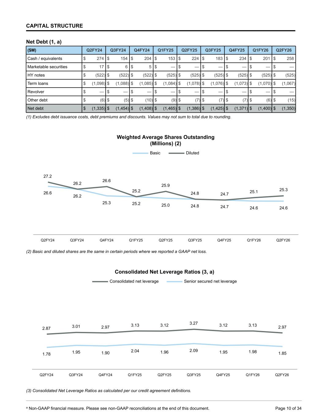 CAPITAL STRUCTURE Net Debt (1, a) ($M) Q2FY24 Q3FY24 Q4FY24 Q1FY25 Q2FY25 Q3FY25 Q4FY25 Q1FY26 Q2FY26 Cash / equivalents $ 274 $ 154 $ 204 $ 153 $ 224 $ 183 $ 234 $ 201 $ 258 Marketable securities $ 17 $ 6 $ 5 $ — $ — $ — $ — $ — $ — HY notes $ (522) $ (522) $ (522) $ (525) $ (525) $ (525) $ (525) $ (525) $ (525) Term loans $ (1,098) $ (1,088) $ (1,085) $ (1,084) $ (1,078) $ (1,076) $ (1,073) $ (1,070) $ (1,067) Revolver $ — $ — $ — $ — $ — $ — $ — $ — $ — Other debt $ (6) $ (5) $ (10) $ (9) $ (7) $ (7) $ (7) $ (6) $ (15) Net debt $ (1,335) $ (1,454) $ (1,408) $ (1,465) $ (1,386) $ (1,425) $ (1,371) $ (1,400) $ (1,350) (1) Excludes debt issuance costs, debt premiums and discounts. Values may not sum to total due to rounding. Weighted Average Shares Outstanding (Millions) (2) 26.6 26.2 25.3 25.2 25.0 24.8 24.7 24.6 24.6 27.2 26.2 26.6 25.2 25.9 24.8 24.7 25.1 25.3 Basic Diluted Q2FY24 Q3FY24 Q4FY24 Q1FY25 Q2FY25 Q3FY25 Q4FY25 Q1FY26 Q2FY26 (2) Basic and diluted shares are the same in certain periods where we reported a GAAP net loss. Consolidated Net Leverage Ratios (3, a) 2.87 3.01 2.97 3.13 3.12 3.27 3.12 3.13 2.97 1.78 1.95 1.90 2.04 1.96 2.09 1.95 1.98 1.85 Consolidated net leverage Senior secured net leverage Q2FY24 Q3FY24 Q4FY24 Q1FY25 Q2FY25 Q3FY25 Q4FY25 Q1FY26 Q2FY26 (3) Consolidated Net Leverage Ratios as calculated per our credit agreement definitions. a Non-GAAP financial measure. Please see non-GAAP reconciliations at the end of this document. Page 10 of 34