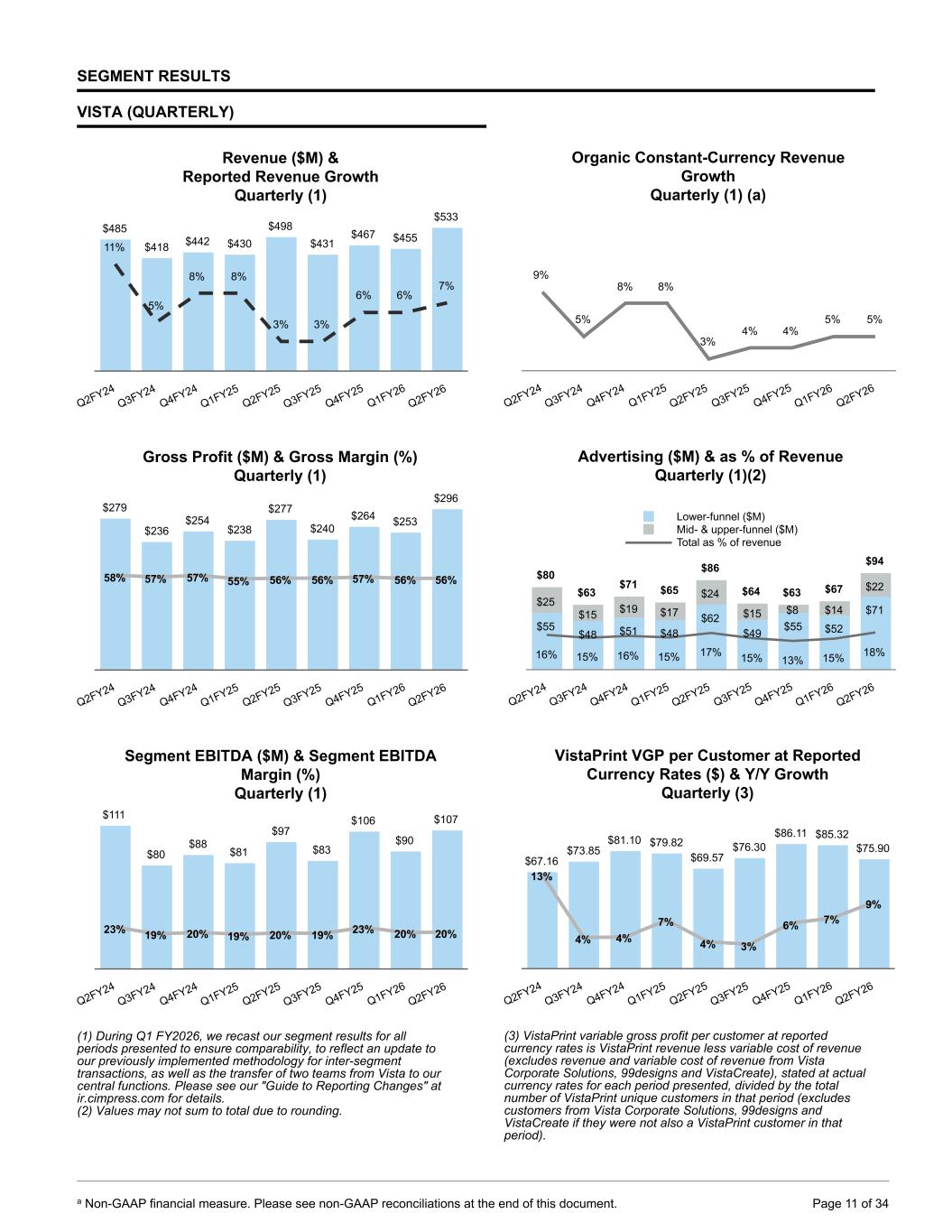 SEGMENT RESULTS VISTA (QUARTERLY) Revenue ($M) & Reported Revenue Growth Quarterly (1) $485 $418 $442 $430 $498 $431 $467 $455 $533 11% 5% 8% 8% 3% 3% 6% 6% 7% Q2FY24 Q3FY24 Q4FY24 Q1FY25 Q2FY25 Q3FY25 Q4FY25 Q1FY26 Q2FY26 Gross Profit ($M) & Gross Margin (%) Quarterly (1) $279 $236 $254 $238 $277 $240 $264 $253 $296 58% 57% 57% 55% 56% 56% 57% 56% 56% Q2FY24 Q3FY24 Q4FY24 Q1FY25 Q2FY25 Q3FY25 Q4FY25 Q1FY26 Q2FY26 Segment EBITDA ($M) & Segment EBITDA Margin (%) Quarterly (1) $111 $80 $88 $81 $97 $83 $106 $90 $107 23% 19% 20% 19% 20% 19% 23% 20% 20% Q2FY24 Q3FY24 Q4FY24 Q1FY25 Q2FY25 Q3FY25 Q4FY25 Q1FY26 Q2FY26 (1) During Q1 FY2026, we recast our segment results for all periods presented to ensure comparability, to reflect an update to our previously implemented methodology for inter-segment transactions, as well as the transfer of two teams from Vista to our central functions. Please see our "Guide to Reporting Changes" at ir.cimpress.com for details. (2) Values may not sum to total due to rounding. Organic Constant-Currency Revenue Growth Quarterly (1) (a) 9% 5% 8% 8% 3% 4% 4% 5% 5% Q2FY24 Q3FY24 Q4FY24 Q1FY25 Q2FY25 Q3FY25 Q4FY25 Q1FY26 Q2FY26 Advertising ($M) & as % of Revenue Quarterly (1)(2) $80 $63 $71 $65 $86 $64 $63 $67 $94 $55 $48 $51 $48 $62 $49 $55 $52 $71 $25 $15 $19 $17 $24 $15 $8 $14 $22 16% 15% 16% 15% 17% 15% 13% 15% 18% Lower-funnel ($M) Mid- & upper-funnel ($M) Total as % of revenue Q2FY24 Q3FY24 Q4FY24 Q1FY25 Q2FY25 Q3FY25 Q4FY25 Q1FY26 Q2FY26 VistaPrint VGP per Customer at Reported Currency Rates ($) & Y/Y Growth Quarterly (3) $67.16 $73.85 $81.10 $79.82 $69.57 $76.30 $86.11 $85.32 $75.90 13% 4% 4% 7% 4% 3% 6% 7% 9% Q2FY24 Q3FY24 Q4FY24 Q1FY25 Q2FY25 Q3FY25 Q4FY25 Q1FY26 Q2FY26 (3) VistaPrint variable gross profit per customer at reported currency rates is VistaPrint revenue less variable cost of revenue (excludes revenue and variable cost of revenue from Vista Corporate Solutions, 99designs and VistaCreate), stated at actual currency rates for each period presented, divided by the total number of VistaPrint unique customers in that period (excludes customers from Vista Corporate Solutions, 99designs and VistaCreate if they were not also a VistaPrint customer in that period). a Non-GAAP financial measure. Please see non-GAAP reconciliations at the end of this document. Page 11 of 34