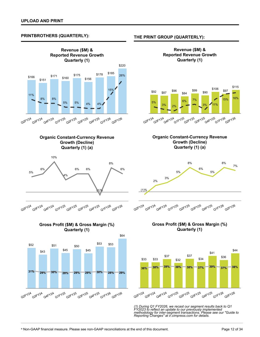 UPLOAD AND PRINT PRINTBROTHERS (QUARTERLY): Revenue ($M) & Reported Revenue Growth Quarterly (1) $166 $151 $171 $160 $175 $156 $178 $185 $220 11% 8% 8% 5% 5% 4% 4% 15% 26% Q2FY24 Q3FY24 Q4FY24 Q1FY25 Q2FY25 Q3FY25 Q4FY25 Q1FY26 Q2FY26 Organic Constant-Currency Revenue Growth (Decline) Quarterly (1) (a) 5% 6% 10% 4% 6% 6% (1)% 8% 6% Q2FY24 Q3FY24 Q4FY24 Q1FY25 Q2FY25 Q3FY25 Q4FY25 Q1FY26 Q2FY26 Gross Profit ($M) & Gross Margin (%) Quarterly (1) $52 $43 $51 $45 $50 $45 $53 $53 $64 31% 29% 30% 28% 29% 29% 30% 28% 29% Q2FY24 Q3FY24 Q4FY24 Q1FY25 Q2FY25 Q3FY25 Q4FY25 Q1FY26 Q2FY26 THE PRINT GROUP (QUARTERLY): Revenue ($M) & Reported Revenue Growth Quarterly (1) $92 $87 $96 $84 $99 $90 $106 $97 $115 5% 3% 2% 6% 7% 3% 11% 15% 16% Q2FY24 Q3FY24 Q4FY24 Q1FY25 Q2FY25 Q3FY25 Q4FY25 Q1FY26 Q2FY26 0 100 200 Organic Constant-Currency Revenue Growth (Decline) Quarterly (1) (a) (1)% 2% 3% 5% 8% 6% 5% 8% 7% Q2FY24 Q3FY24 Q4FY24 Q1FY25 Q2FY25 Q3FY25 Q4FY25 Q1FY26 Q2FY26 Gross Profit ($M) & Gross Margin (%) Quarterly (1) $33 $33 $37 $32 $37 $34 $41 $36 $44 36% 38% 39% 38% 38% 37% 39% 37% 38% Q2FY24 Q3FY24 Q4FY24 Q1FY25 Q2FY25 Q3FY25 Q4FY25 Q1FY26 Q2FY26 (1) During Q1 FY2026, we recast our segment results back to Q1 FY2023 to reflect an update to our previously implemented methodology for inter-segment transactions. Please see our "Guide to Reporting Changes" at ir.cimpress.com for details. a Non-GAAP financial measure. Please see non-GAAP reconciliations at the end of this document. Page 12 of 34