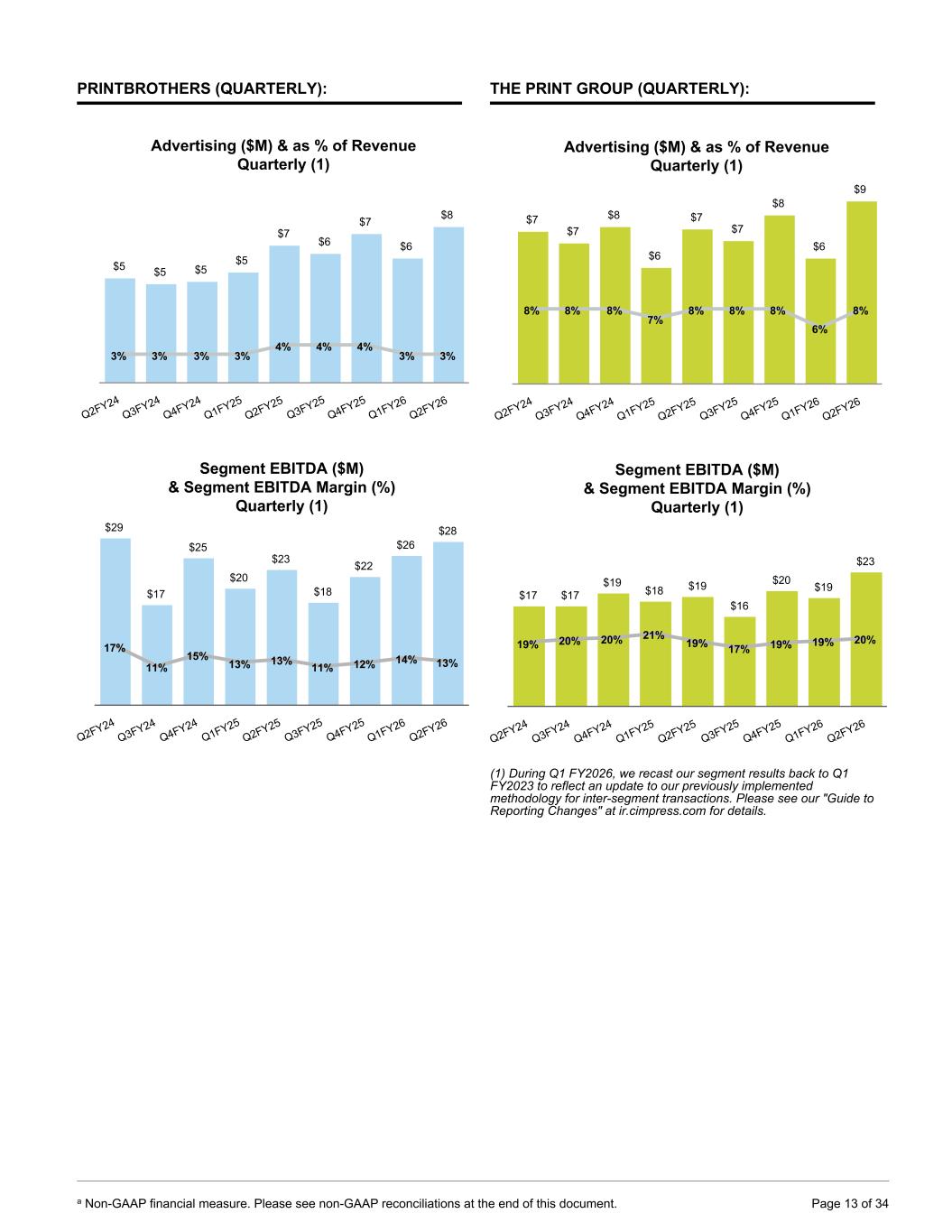 PRINTBROTHERS (QUARTERLY): Advertising ($M) & as % of Revenue Quarterly (1) $5 $5 $5 $5 $7 $6 $7 $6 $8 3% 3% 3% 3% 4% 4% 4% 3% 3% Q2FY24 Q3FY24 Q4FY24 Q1FY25 Q2FY25 Q3FY25 Q4FY25 Q1FY26 Q2FY26 Segment EBITDA ($M) & Segment EBITDA Margin (%) Quarterly (1) $29 $17 $25 $20 $23 $18 $22 $26 $28 17% 11% 15% 13% 13% 11% 12% 14% 13% Q2FY24 Q3FY24 Q4FY24 Q1FY25 Q2FY25 Q3FY25 Q4FY25 Q1FY26 Q2FY26 THE PRINT GROUP (QUARTERLY): Advertising ($M) & as % of Revenue Quarterly (1) $7 $7 $8 $6 $7 $7 $8 $6 $9 8% 8% 8% 7% 8% 8% 8% 6% 8% Q2FY24 Q3FY24 Q4FY24 Q1FY25 Q2FY25 Q3FY25 Q4FY25 Q1FY26 Q2FY26 Segment EBITDA ($M) & Segment EBITDA Margin (%) Quarterly (1) $17 $17 $19 $18 $19 $16 $20 $19 $23 19% 20% 20% 21% 19% 17% 19% 19% 20% Q2FY24 Q3FY24 Q4FY24 Q1FY25 Q2FY25 Q3FY25 Q4FY25 Q1FY26 Q2FY26 (1) During Q1 FY2026, we recast our segment results back to Q1 FY2023 to reflect an update to our previously implemented methodology for inter-segment transactions. Please see our "Guide to Reporting Changes" at ir.cimpress.com for details. a Non-GAAP financial measure. Please see non-GAAP reconciliations at the end of this document. Page 13 of 34