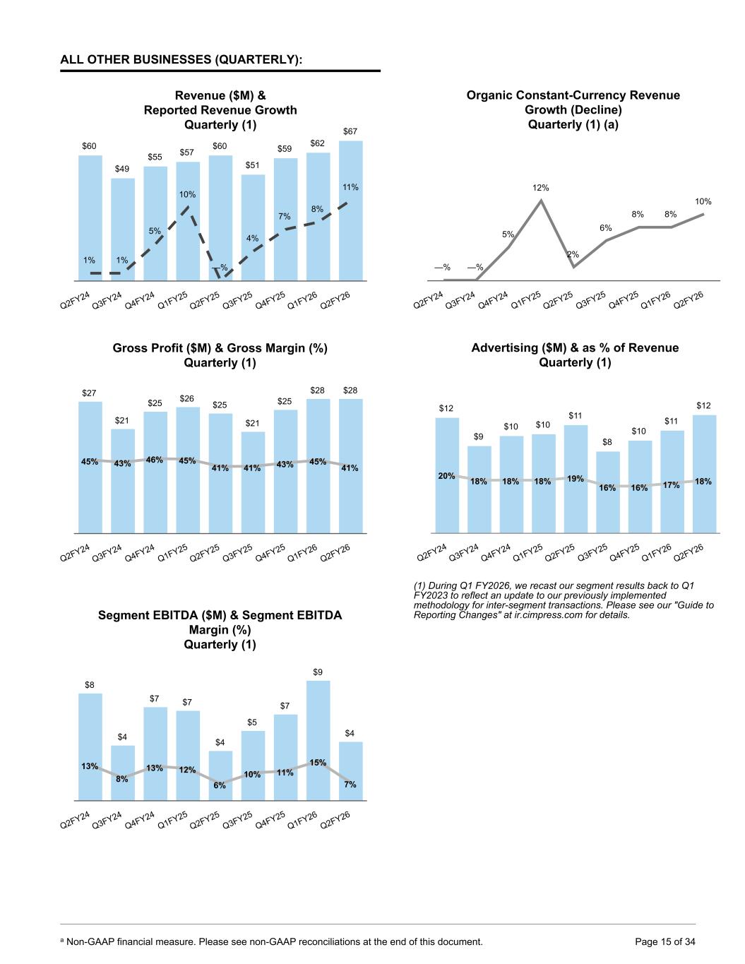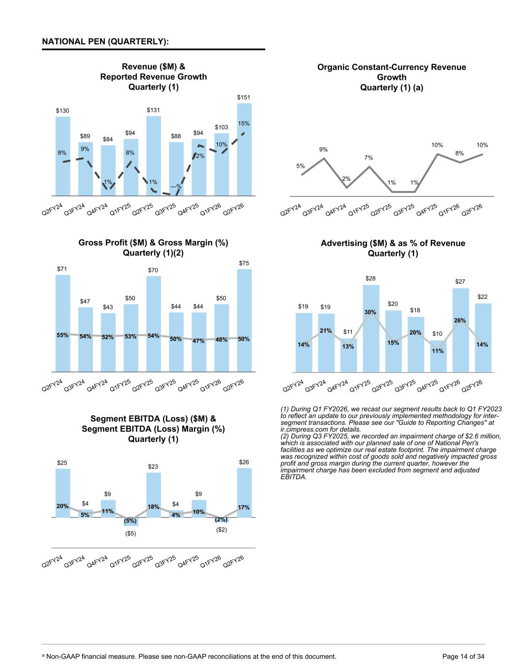 NATIONAL PEN (QUARTERLY): Revenue ($M) & Reported Revenue Growth Quarterly (1) $130 $89 $84 $94 $131 $88 $94 $103 $151 8% 9% 1% 8% 1% —% 12% 10% 15% Q2FY24 Q3FY24 Q4FY24 Q1FY25 Q2FY25 Q3FY25 Q4FY25 Q1FY26 Q2FY26 Gross Profit ($M) & Gross Margin (%) Quarterly (1)(2) $71 $47 $43 $50 $70 $44 $44 $50 $75 55% 54% 52% 53% 54% 50% 47% 48% 50% Q2FY24 Q3FY24 Q4FY24 Q1FY25 Q2FY25 Q3FY25 Q4FY25 Q1FY26 Q2FY26 Segment EBITDA (Loss) ($M) & Segment EBITDA (Loss) Margin (%) Quarterly (1) $25 $4 $9 ($5) $23 $4 $9 ($2) $26 20% 5% 11% (5%) 18% 4% 10% (2%) 17% Q2FY24 Q3FY24 Q4FY24 Q1FY25 Q2FY25 Q3FY25 Q4FY25 Q1FY26 Q2FY26 Organic Constant-Currency Revenue Growth Quarterly (1) (a) 5% 9% 2% 7% 1% 1% 10% 8% 10% Q2FY24 Q3FY24 Q4FY24 Q1FY25 Q2FY25 Q3FY25 Q4FY25 Q1FY26 Q2FY26 Advertising ($M) & as % of Revenue Quarterly (1) $19 $19 $11 $28 $20 $18 $10 $27 $22 14% 21% 13% 30% 15% 20% 11% 26% 14% Q2FY24 Q3FY24 Q4FY24 Q1FY25 Q2FY25 Q3FY25 Q4FY25 Q1FY26 Q2FY26 (1) During Q1 FY2026, we recast our segment results back to Q1 FY2023 to reflect an update to our previously implemented methodology for inter- segment transactions. Please see our "Guide to Reporting Changes" at ir.cimpress.com for details. (2) During Q3 FY2025, we recorded an impairment charge of $2.6 million, which is associated with our planned sale of one of National Pen's facilities as we optimize our real estate footprint. The impairment charge was recognized within cost of goods sold and negatively impacted gross profit and gross margin during the current quarter, however the impairment charge has been excluded from segment and adjusted EBITDA. a Non-GAAP financial measure. Please see non-GAAP reconciliations at the end of this document. Page 14 of 34