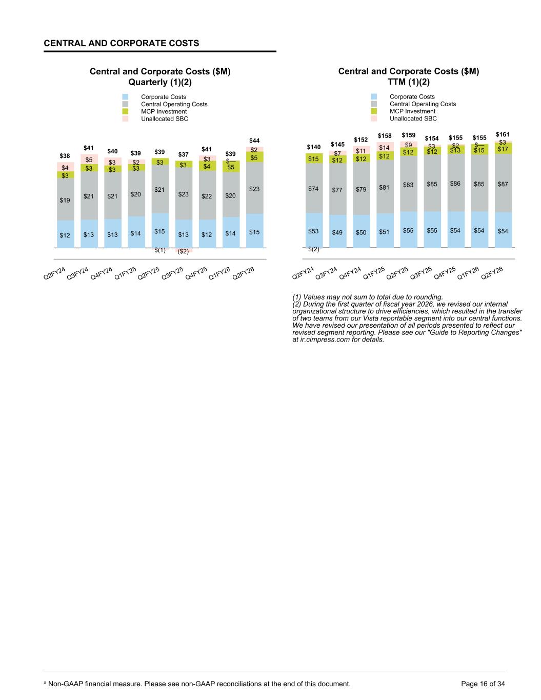CENTRAL AND CORPORATE COSTS Central and Corporate Costs ($M) Quarterly (1)(2) $12 $13 $13 $14 $15 $13 $12 $14 $15 $19 $21 $21 $20 $21 $23 $22 $20 $23 $3 $3 $3 $3 $3 $3 $4 $5 $5 $4 $5 $3 $2 $(1) ($2) $3 $— $2 $38 $41 $40 $39 $39 $37 $41 $39 $44 Corporate Costs Central Operating Costs MCP Investment Unallocated SBC Q2FY24 Q3FY24 Q4FY24 Q1FY25 Q2FY25 Q3FY25 Q4FY25 Q1FY26 Q2FY26 Central and Corporate Costs ($M) TTM (1)(2) $53 $49 $50 $51 $55 $55 $54 $54 $54 $74 $77 $79 $81 $83 $85 $86 $85 $87 $15 $12 $12 $12 $12 $12 $13 $15 $17 $(2) $7 $11 $14 $9 $3 $2 $— $3 $140 $145 $152 $158 $159 $154 $155 $155 $161 Corporate Costs Central Operating Costs MCP Investment Unallocated SBC Q2FY24 Q3FY24 Q4FY24 Q1FY25 Q2FY25 Q3FY25 Q4FY25 Q1FY26 Q2FY26 (1) Values may not sum to total due to rounding. (2) During the first quarter of fiscal year 2026, we revised our internal organizational structure to drive efficiencies, which resulted in the transfer of two teams from our Vista reportable segment into our central functions. We have revised our presentation of all periods presented to reflect our revised segment reporting. Please see our "Guide to Reporting Changes" at ir.cimpress.com for details. a Non-GAAP financial measure. Please see non-GAAP reconciliations at the end of this document. Page 16 of 34