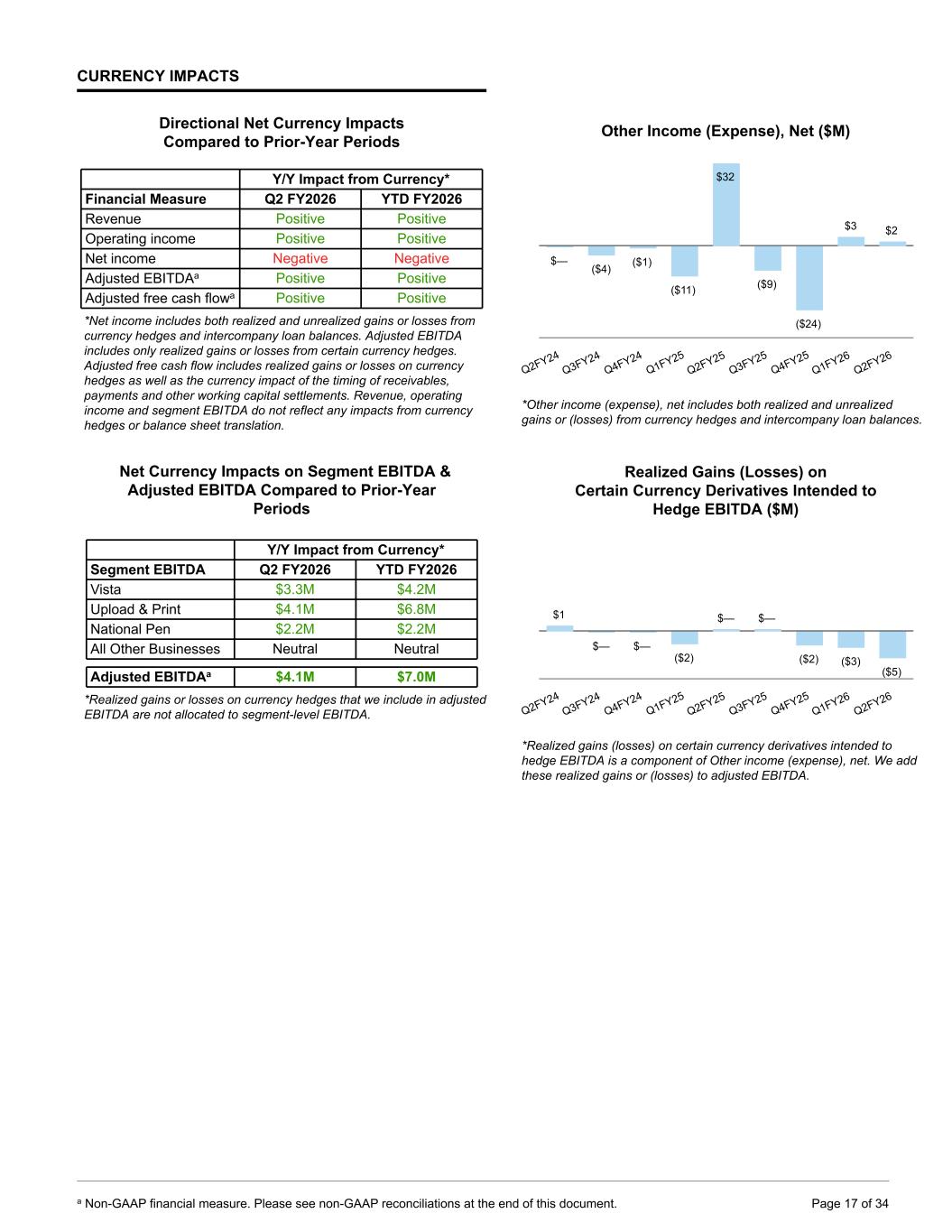 CURRENCY IMPACTS Directional Net Currency Impacts Compared to Prior-Year Periods Y/Y Impact from Currency* Financial Measure Q2 FY2026 YTD FY2026 Revenue Positive Positive Operating income Positive Positive Net income Negative Negative Adjusted EBITDAa Positive Positive Adjusted free cash flowa Positive Positive *Net income includes both realized and unrealized gains or losses from currency hedges and intercompany loan balances. Adjusted EBITDA includes only realized gains or losses from certain currency hedges. Adjusted free cash flow includes realized gains or losses on currency hedges as well as the currency impact of the timing of receivables, payments and other working capital settlements. Revenue, operating income and segment EBITDA do not reflect any impacts from currency hedges or balance sheet translation. Net Currency Impacts on Segment EBITDA & Adjusted EBITDA Compared to Prior-Year Periods Y/Y Impact from Currency* Segment EBITDA Q2 FY2026 YTD FY2026 Vista $3.3M $4.2M Upload & Print $4.1M $6.8M National Pen $2.2M $2.2M All Other Businesses Neutral Neutral Adjusted EBITDAa $4.1M $7.0M *Realized gains or losses on currency hedges that we include in adjusted EBITDA are not allocated to segment-level EBITDA. Other Income (Expense), Net ($M) $— ($4) ($1) ($11) $32 ($9) ($24) $3 $2 Q2FY24 Q3FY24 Q4FY24 Q1FY25 Q2FY25 Q3FY25 Q4FY25 Q1FY26 Q2FY26 *Other income (expense), net includes both realized and unrealized gains or (losses) from currency hedges and intercompany loan balances. Realized Gains (Losses) on Certain Currency Derivatives Intended to Hedge EBITDA ($M) $1 $— $— ($2) $— $— ($2) ($3) ($5) Q2FY24 Q3FY24 Q4FY24 Q1FY25 Q2FY25 Q3FY25 Q4FY25 Q1FY26 Q2FY26 *Realized gains (losses) on certain currency derivatives intended to hedge EBITDA is a component of Other income (expense), net. We add these realized gains or (losses) to adjusted EBITDA. a Non-GAAP financial measure. Please see non-GAAP reconciliations at the end of this document. Page 17 of 34