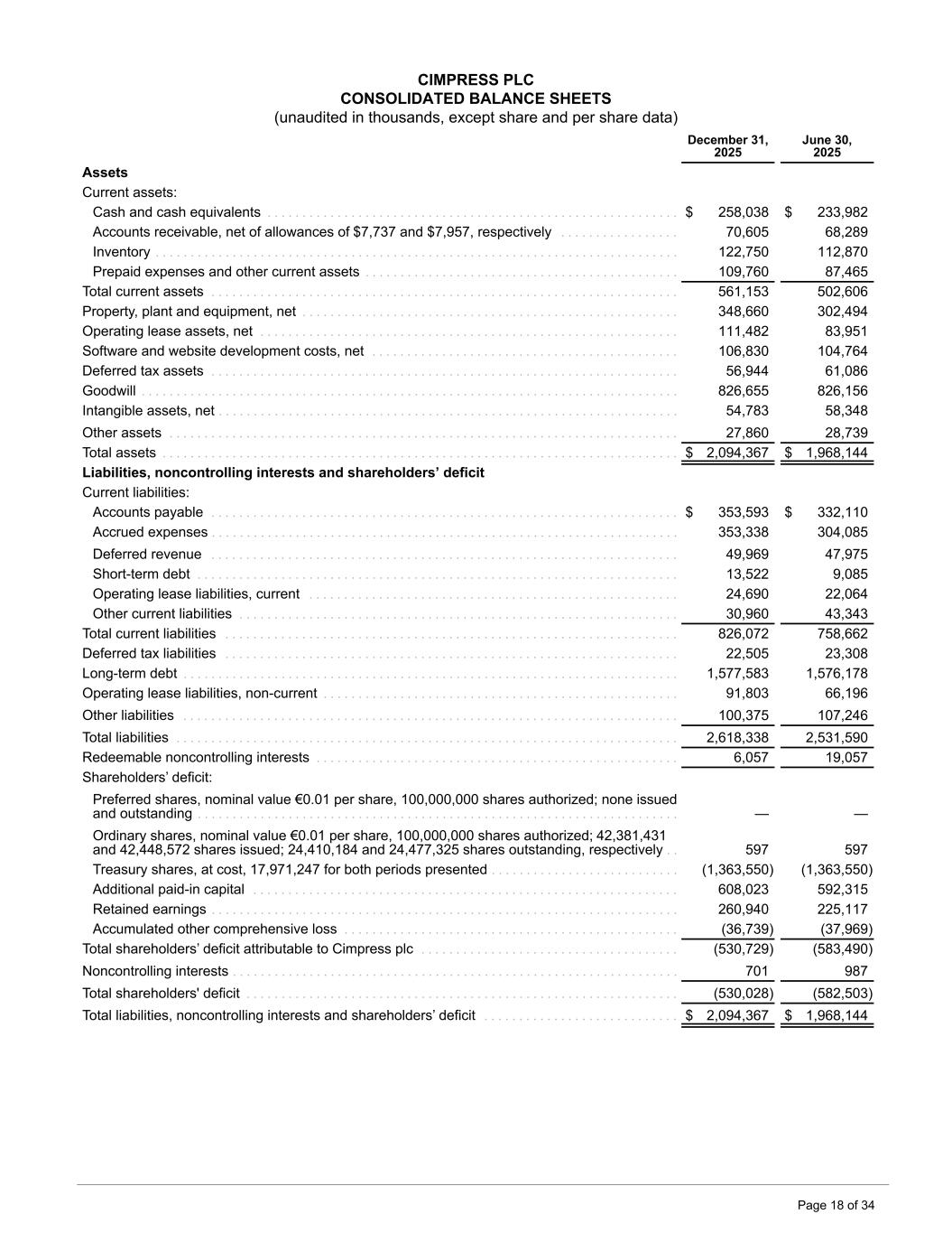CIMPRESS PLC CONSOLIDATED BALANCE SHEETS (unaudited in thousands, except share and per share data) December 31, 2025 June 30, 2025 Assets Current assets: Cash and cash equivalents . . . . . . . . . . . . . . . . . . . . . . . . . . . . . . . . . . . . . . . . . . . . . . . . . . . . . . . . . . . $ 258,038 $ 233,982 Accounts receivable, net of allowances of $7,737 and $7,957, respectively . . . . . . . . . . . . . . . . . 70,605 68,289 Inventory . . . . . . . . . . . . . . . . . . . . . . . . . . . . . . . . . . . . . . . . . . . . . . . . . . . . . . . . . . . . . . . . . . . . . . . . . . . 122,750 112,870 Prepaid expenses and other current assets . . . . . . . . . . . . . . . . . . . . . . . . . . . . . . . . . . . . . . . . . . . . . 109,760 87,465 Total current assets . . . . . . . . . . . . . . . . . . . . . . . . . . . . . . . . . . . . . . . . . . . . . . . . . . . . . . . . . . . . . . . . . . . 561,153 502,606 Property, plant and equipment, net . . . . . . . . . . . . . . . . . . . . . . . . . . . . . . . . . . . . . . . . . . . . . . . . . . . . . . 348,660 302,494 Operating lease assets, net . . . . . . . . . . . . . . . . . . . . . . . . . . . . . . . . . . . . . . . . . . . . . . . . . . . . . . . . . . . . 111,482 83,951 Software and website development costs, net . . . . . . . . . . . . . . . . . . . . . . . . . . . . . . . . . . . . . . . . . . . . 106,830 104,764 Deferred tax assets . . . . . . . . . . . . . . . . . . . . . . . . . . . . . . . . . . . . . . . . . . . . . . . . . . . . . . . . . . . . . . . . . . . 56,944 61,086 Goodwill . . . . . . . . . . . . . . . . . . . . . . . . . . . . . . . . . . . . . . . . . . . . . . . . . . . . . . . . . . . . . . . . . . . . . . . . . . . . . 826,655 826,156 Intangible assets, net . . . . . . . . . . . . . . . . . . . . . . . . . . . . . . . . . . . . . . . . . . . . . . . . . . . . . . . . . . . . . . . . . . 54,783 58,348 Other assets . . . . . . . . . . . . . . . . . . . . . . . . . . . . . . . . . . . . . . . . . . . . . . . . . . . . . . . . . . . . . . . . . . . . . . . . . 27,860 28,739 Total assets . . . . . . . . . . . . . . . . . . . . . . . . . . . . . . . . . . . . . . . . . . . . . . . . . . . . . . . . . . . . . . . . . . . . . . . . . . $ 2,094,367 $ 1,968,144 Liabilities, noncontrolling interests and shareholders’ deficit Current liabilities: Accounts payable . . . . . . . . . . . . . . . . . . . . . . . . . . . . . . . . . . . . . . . . . . . . . . . . . . . . . . . . . . . . . . . . . . . $ 353,593 $ 332,110 Accrued expenses . . . . . . . . . . . . . . . . . . . . . . . . . . . . . . . . . . . . . . . . . . . . . . . . . . . . . . . . . . . . . . . . . . . 353,338 304,085 Deferred revenue . . . . . . . . . . . . . . . . . . . . . . . . . . . . . . . . . . . . . . . . . . . . . . . . . . . . . . . . . . . . . . . . . . . 49,969 47,975 Short-term debt . . . . . . . . . . . . . . . . . . . . . . . . . . . . . . . . . . . . . . . . . . . . . . . . . . . . . . . . . . . . . . . . . . . . . 13,522 9,085 Operating lease liabilities, current . . . . . . . . . . . . . . . . . . . . . . . . . . . . . . . . . . . . . . . . . . . . . . . . . . . . . 24,690 22,064 Other current liabilities . . . . . . . . . . . . . . . . . . . . . . . . . . . . . . . . . . . . . . . . . . . . . . . . . . . . . . . . . . . . . . . 30,960 43,343 Total current liabilities . . . . . . . . . . . . . . . . . . . . . . . . . . . . . . . . . . . . . . . . . . . . . . . . . . . . . . . . . . . . . . . . . 826,072 758,662 Deferred tax liabilities . . . . . . . . . . . . . . . . . . . . . . . . . . . . . . . . . . . . . . . . . . . . . . . . . . . . . . . . . . . . . . . . . 22,505 23,308 Long-term debt . . . . . . . . . . . . . . . . . . . . . . . . . . . . . . . . . . . . . . . . . . . . . . . . . . . . . . . . . . . . . . . . . . . . . . . 1,577,583 1,576,178 Operating lease liabilities, non-current . . . . . . . . . . . . . . . . . . . . . . . . . . . . . . . . . . . . . . . . . . . . . . . . . . . 91,803 66,196 Other liabilities . . . . . . . . . . . . . . . . . . . . . . . . . . . . . . . . . . . . . . . . . . . . . . . . . . . . . . . . . . . . . . . . . . . . . . . 100,375 107,246 Total liabilities . . . . . . . . . . . . . . . . . . . . . . . . . . . . . . . . . . . . . . . . . . . . . . . . . . . . . . . . . . . . . . . . . . . . . . . . 2,618,338 2,531,590 Redeemable noncontrolling interests . . . . . . . . . . . . . . . . . . . . . . . . . . . . . . . . . . . . . . . . . . . . . . . . . . . . 6,057 19,057 Shareholders’ deficit: Preferred shares, nominal value €0.01 per share, 100,000,000 shares authorized; none issued and outstanding . . . . . . . . . . . . . . . . . . . . . . . . . . . . . . . . . . . . . . . . . . . . . . . . . . . . . . . . . . . . . . . . . . . . . — — Ordinary shares, nominal value €0.01 per share, 100,000,000 shares authorized; 42,381,431 and 42,448,572 shares issued; 24,410,184 and 24,477,325 shares outstanding, respectively . . 597 597 Treasury shares, at cost, 17,971,247 for both periods presented . . . . . . . . . . . . . . . . . . . . . . . . . . . (1,363,550) (1,363,550) Additional paid-in capital . . . . . . . . . . . . . . . . . . . . . . . . . . . . . . . . . . . . . . . . . . . . . . . . . . . . . . . . . . . . . 608,023 592,315 Retained earnings . . . . . . . . . . . . . . . . . . . . . . . . . . . . . . . . . . . . . . . . . . . . . . . . . . . . . . . . . . . . . . . . . . . 260,940 225,117 Accumulated other comprehensive loss . . . . . . . . . . . . . . . . . . . . . . . . . . . . . . . . . . . . . . . . . . . . . . . . (36,739) (37,969) Total shareholders’ deficit attributable to Cimpress plc . . . . . . . . . . . . . . . . . . . . . . . . . . . . . . . . . . . . . (530,729) (583,490) Noncontrolling interests . . . . . . . . . . . . . . . . . . . . . . . . . . . . . . . . . . . . . . . . . . . . . . . . . . . . . . . . . . . . . . . . 701 987 Total shareholders' deficit . . . . . . . 